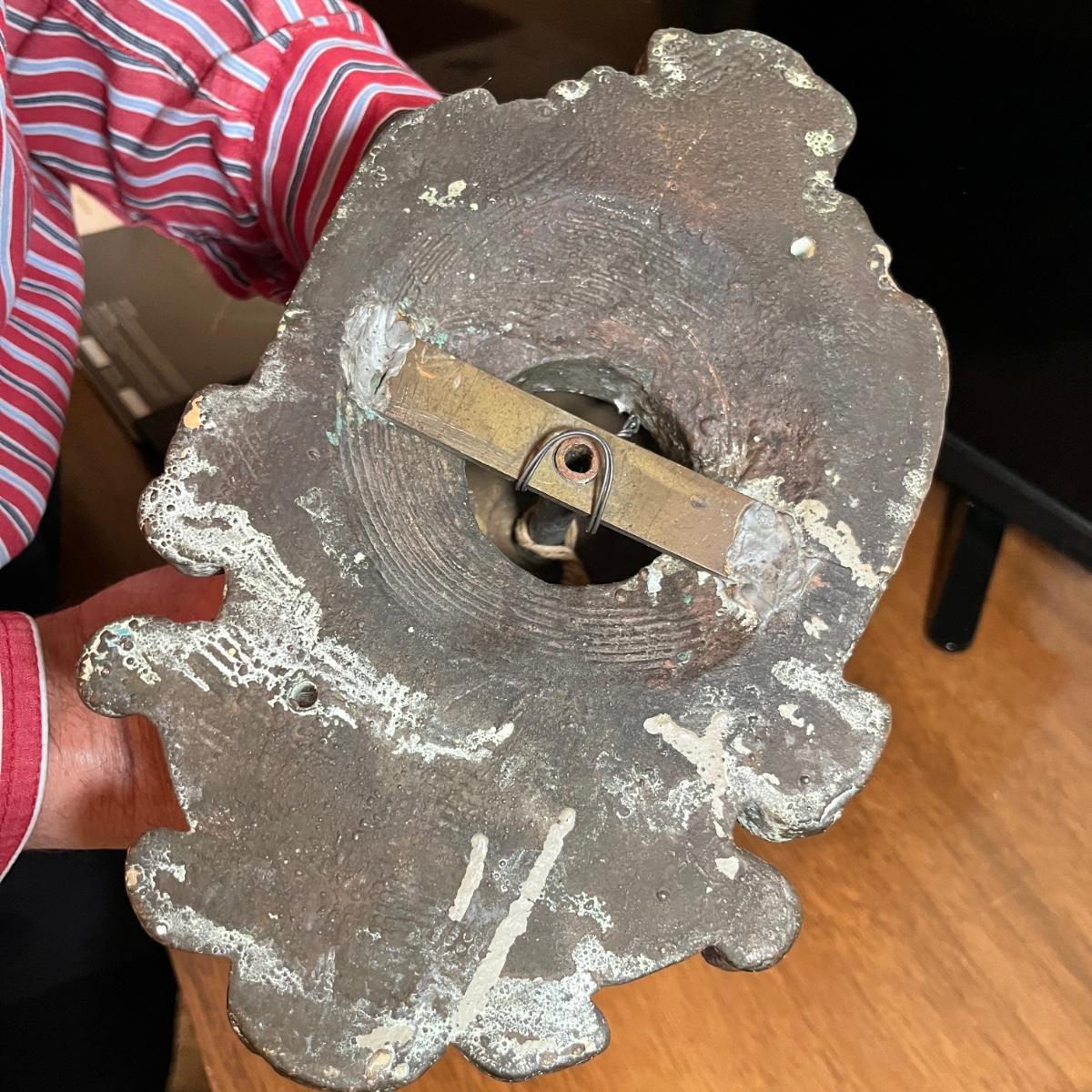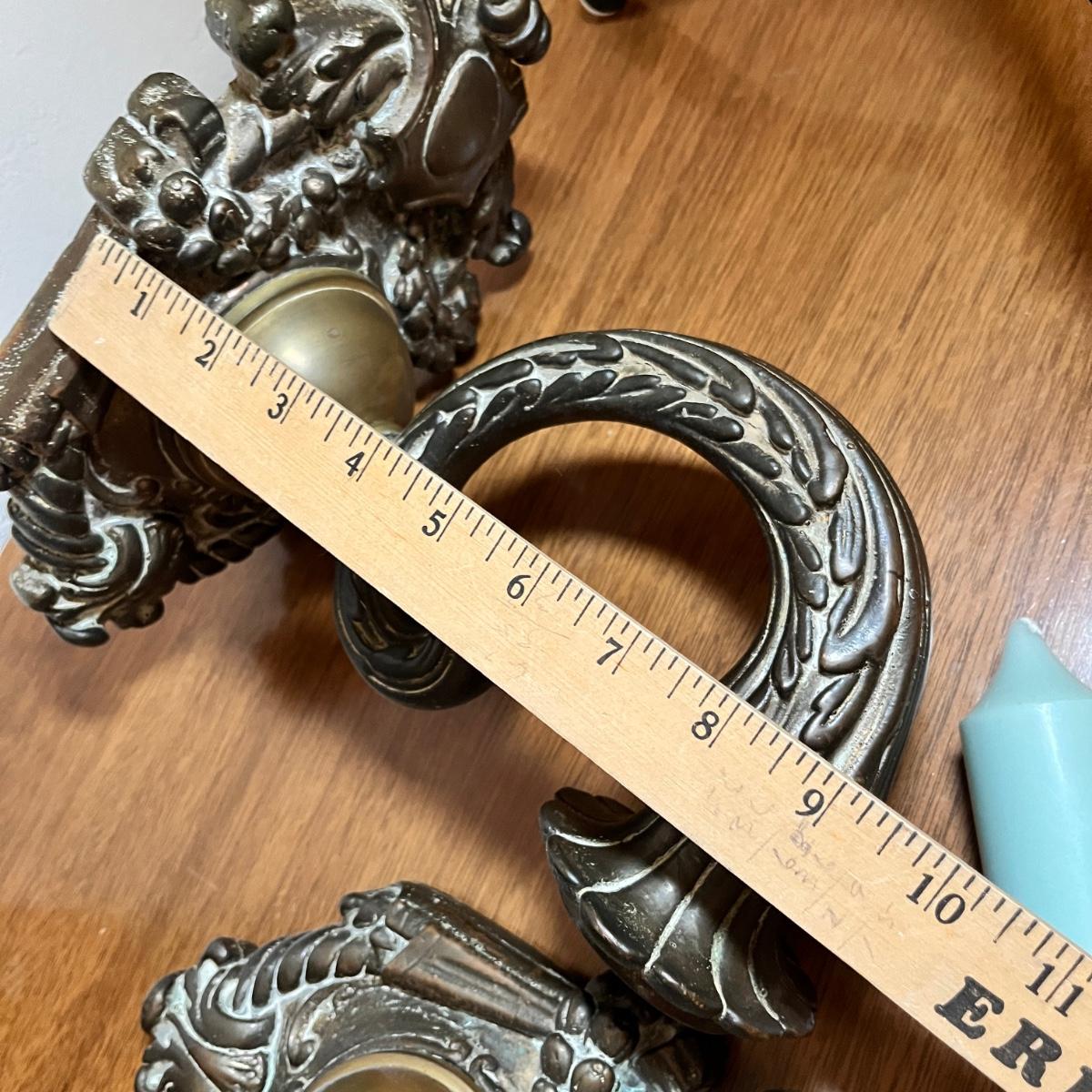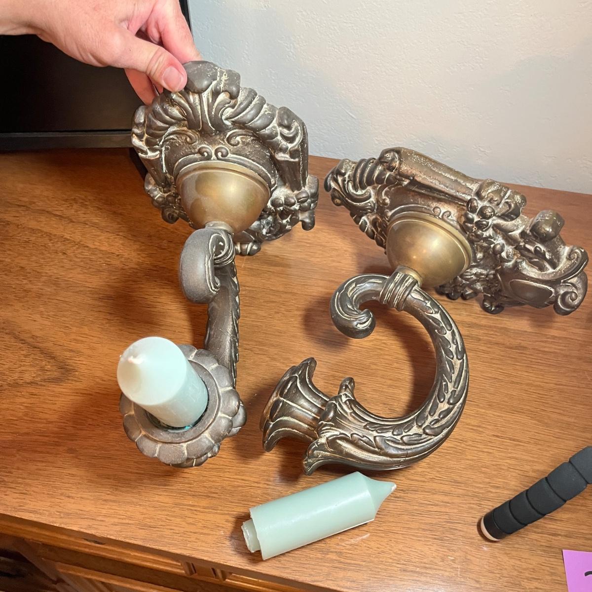 These are quite old, they look to be bronze. JR thinks that they are late 1800s by the style. They still have tubing to run electrical wiring. But these were probably originally gas lights! Very beautiful & quite heavy!