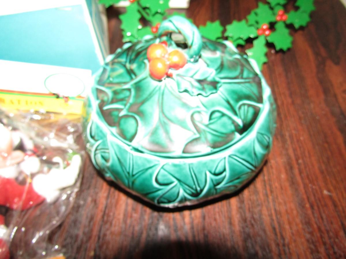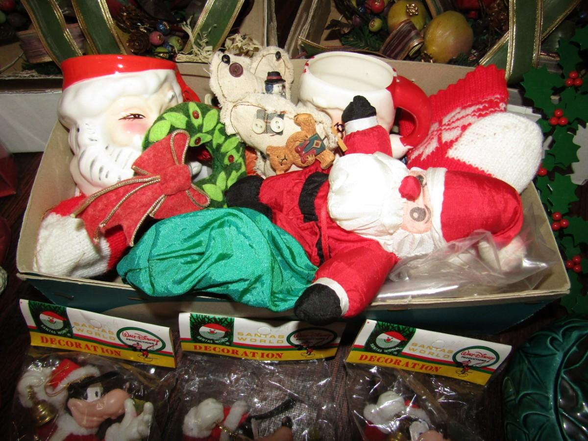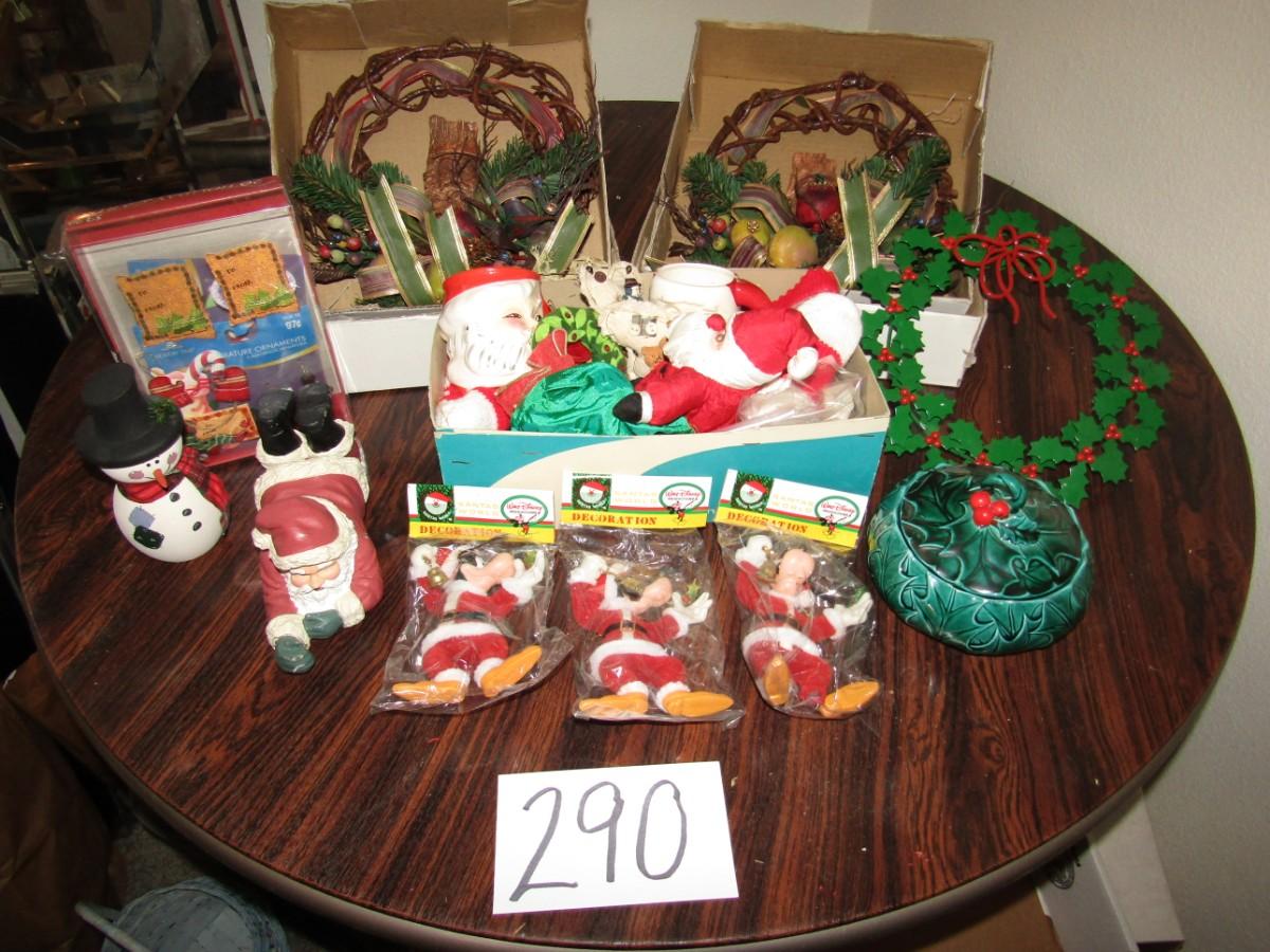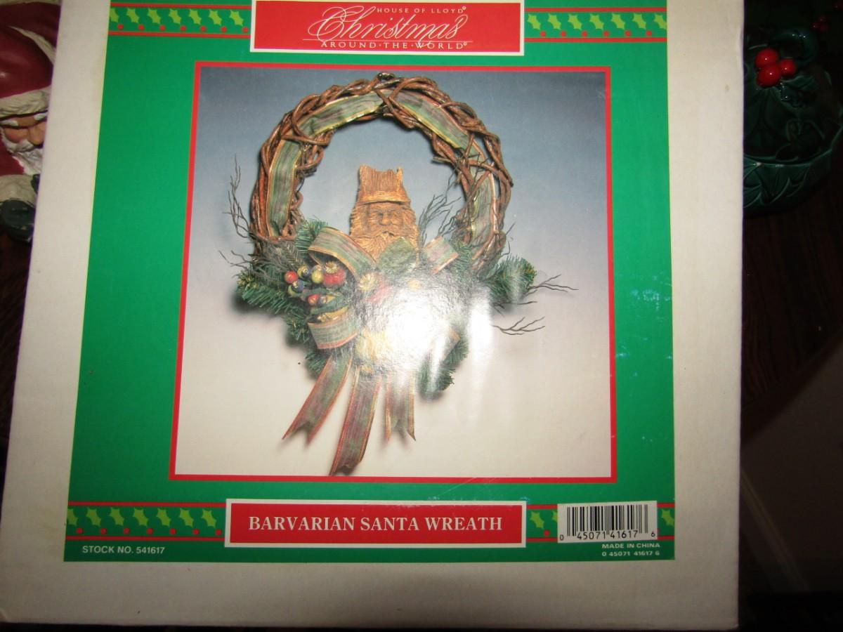 2 BAVARIAN SANTA WREATH IN ORIGINAL BOX, PLUTO CHRISTMAS DECORATIONS IN BAGS. NEW. CERAMIC DISH AND CERAMIC SANTA BY MIDWEST IMPORTS.