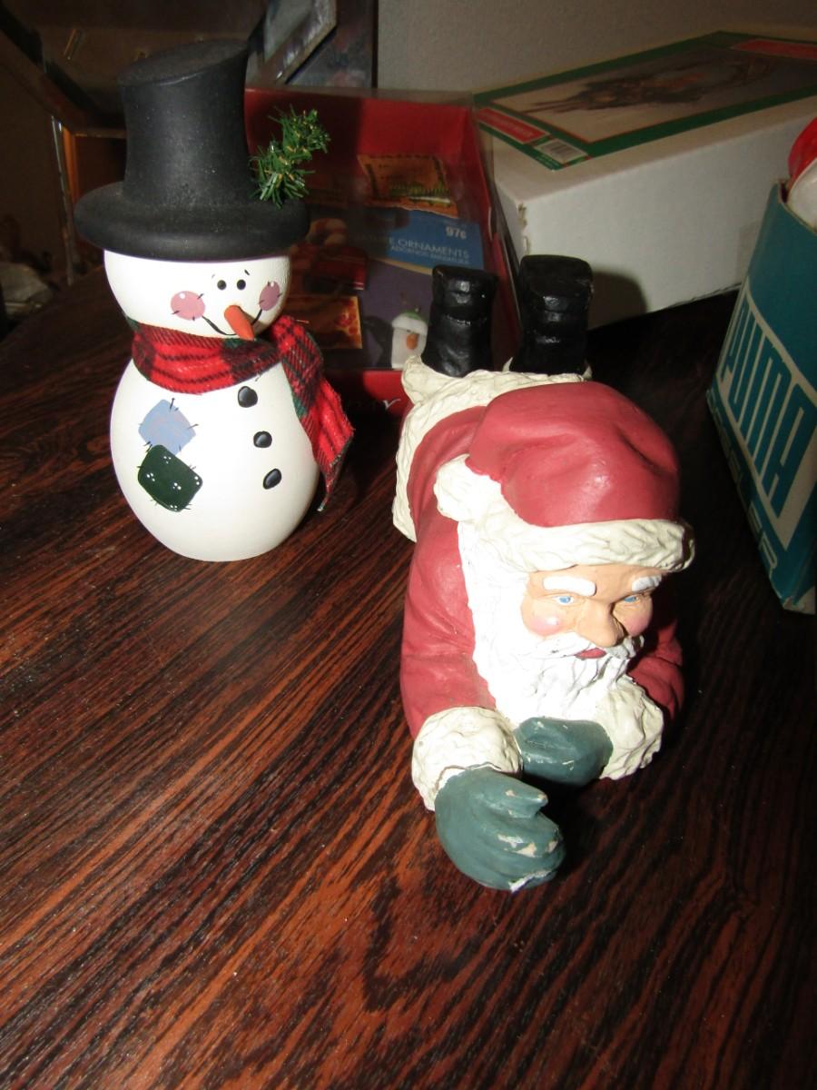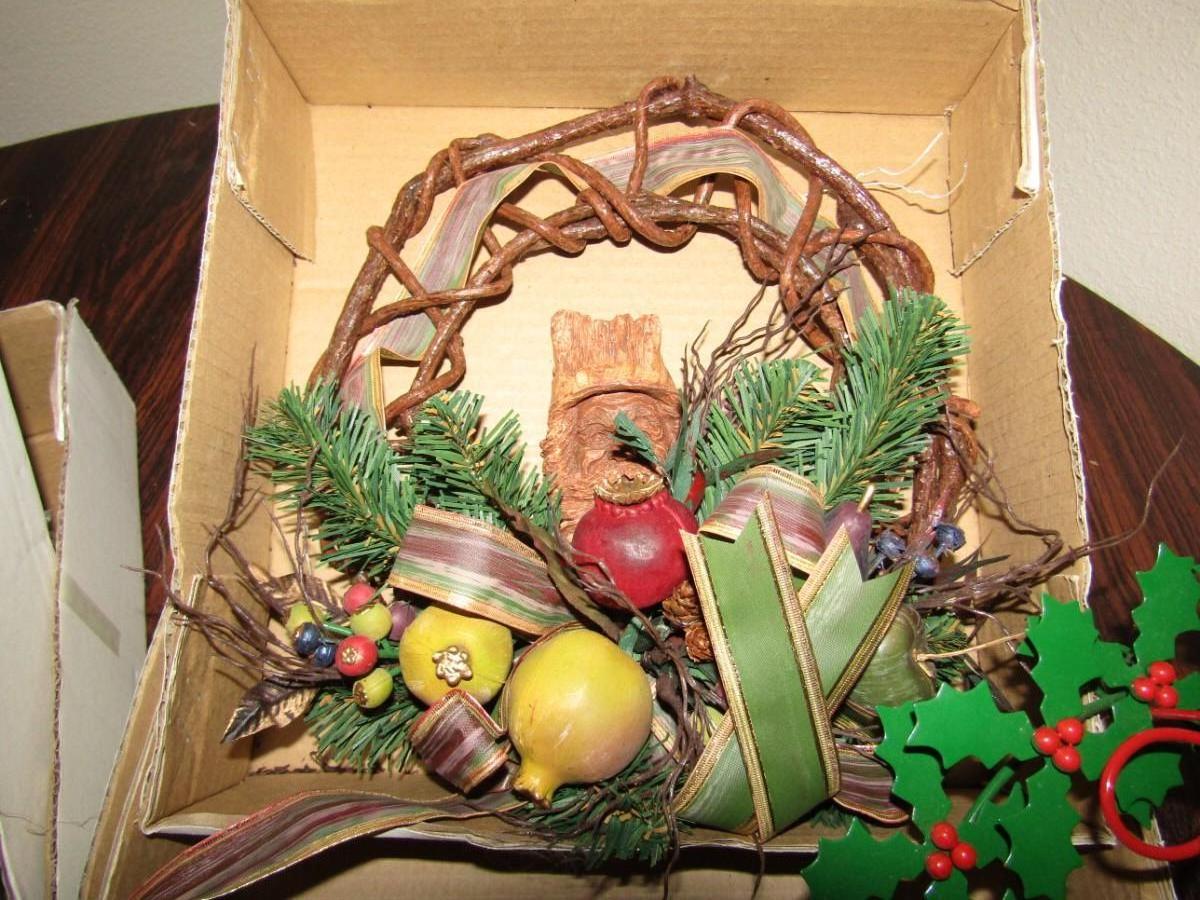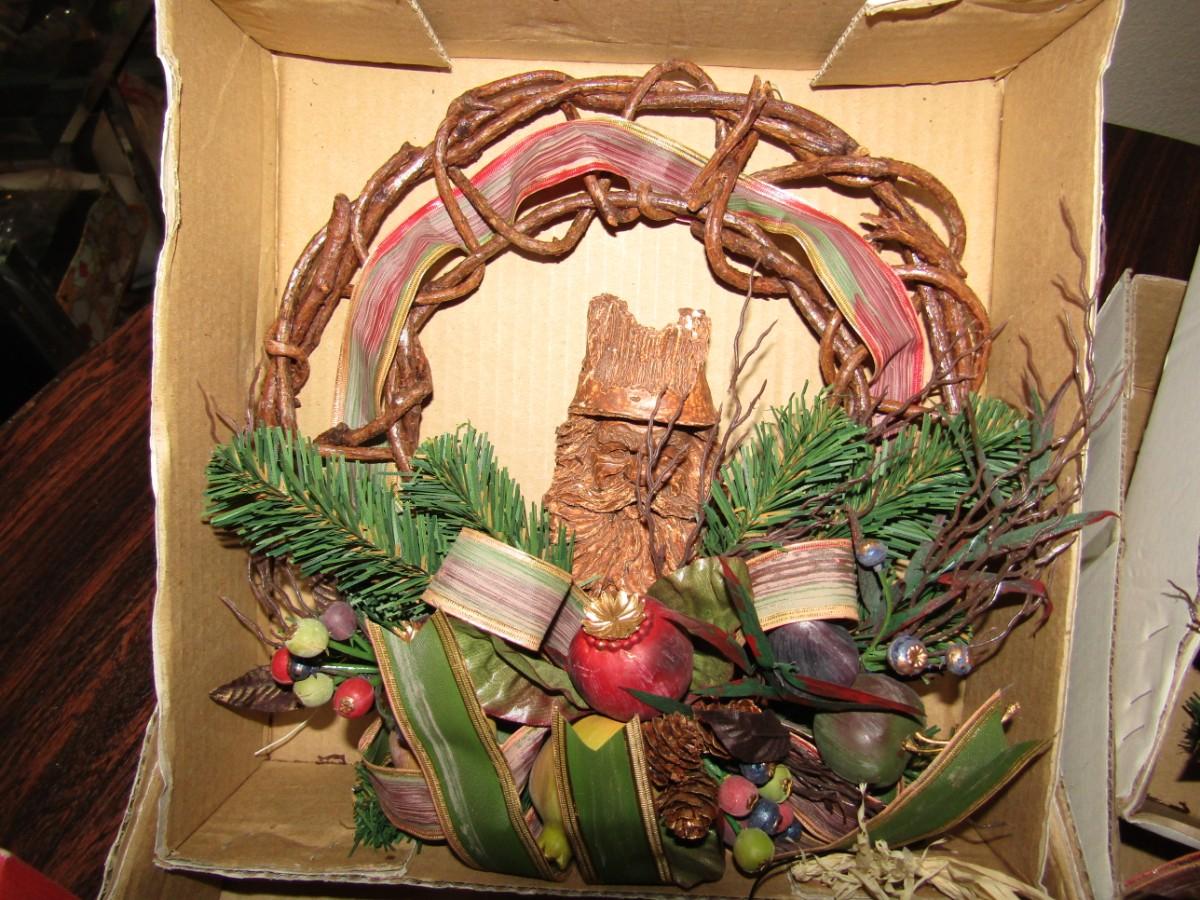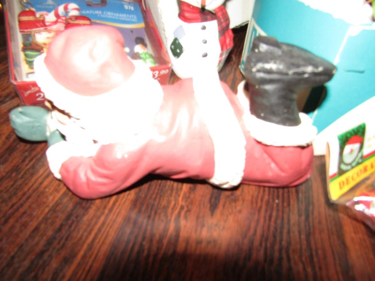 2 BAVARIAN SANTA WREATH IN ORIGINAL BOX, PLUTO CHRISTMAS DECORATIONS IN BAGS. NEW. CERAMIC DISH AND CERAMIC SANTA BY MIDWEST IMPORTS.