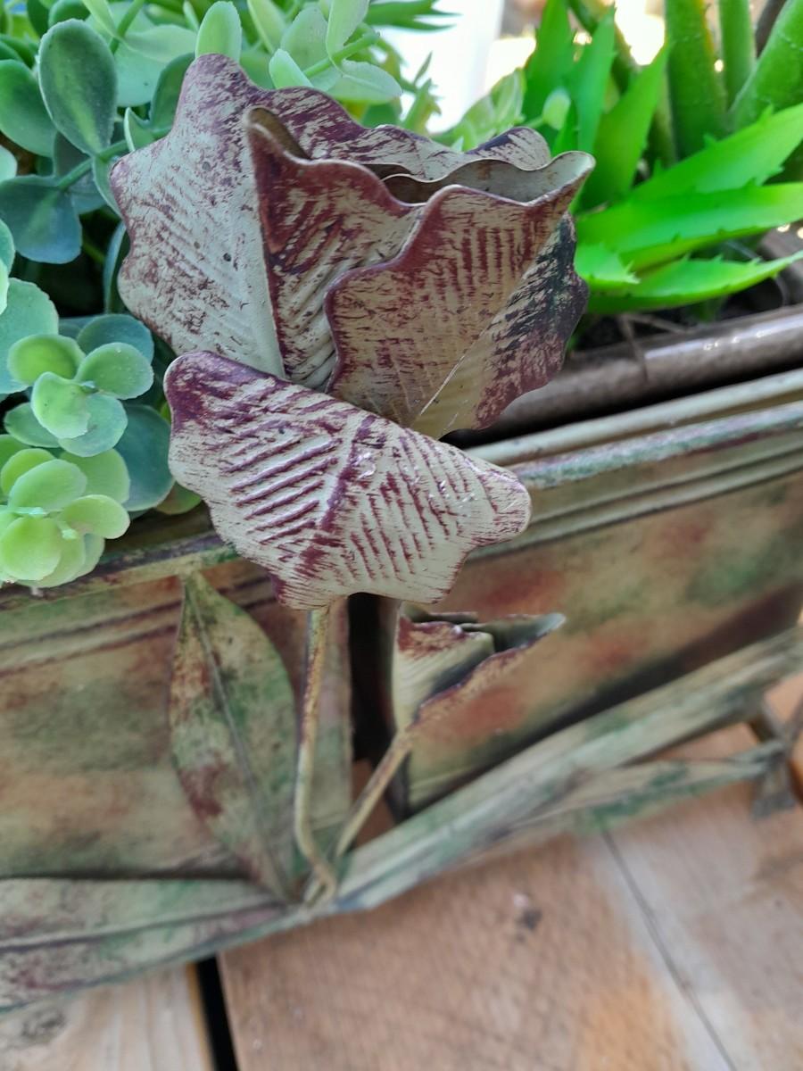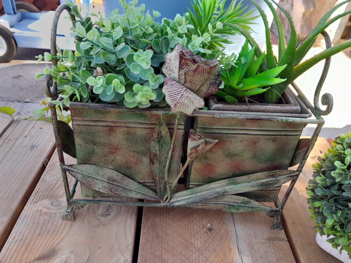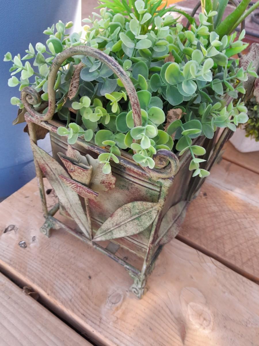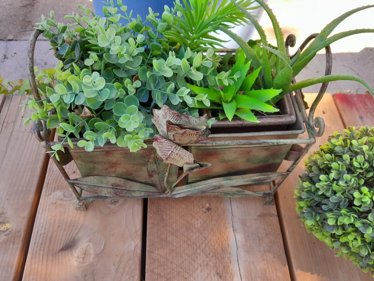 FAUX GREENERY IN METAL BASKET WITH ROSE ACCENT, FAUX GREENERY IN POT, AND A GIANT LEAF.
