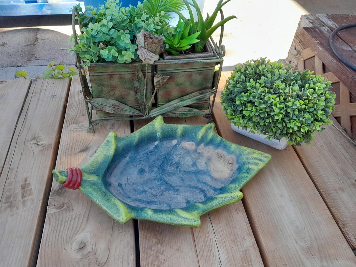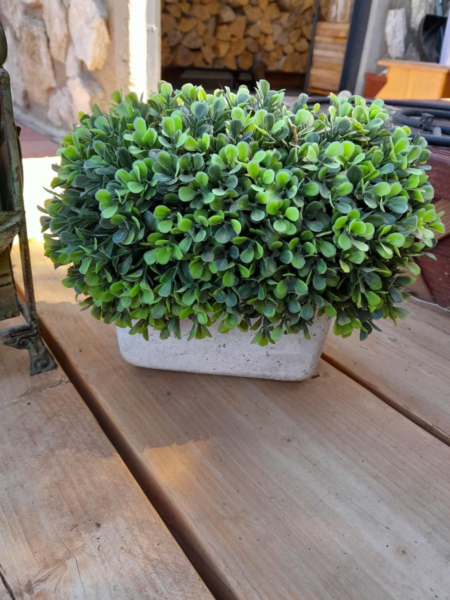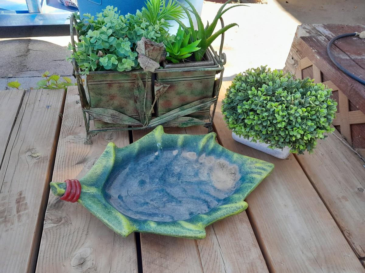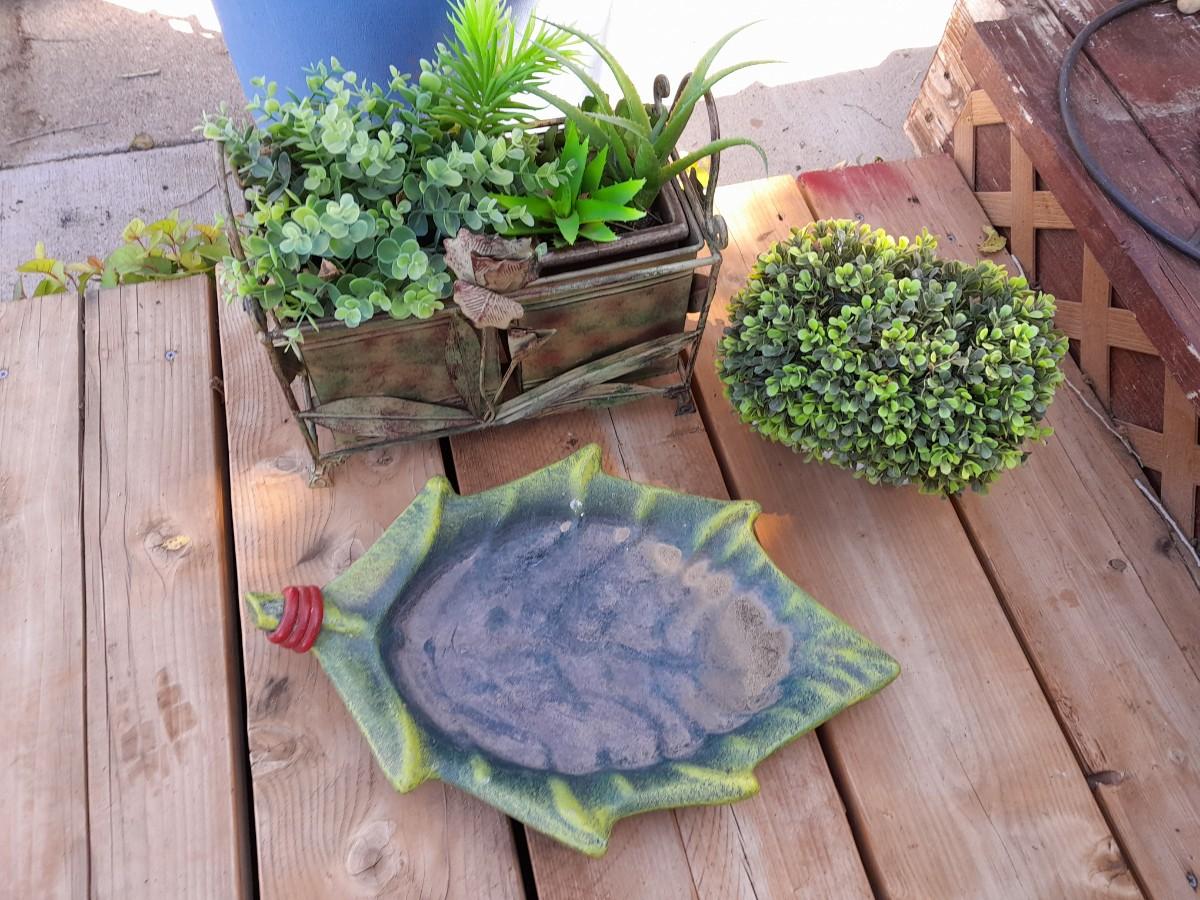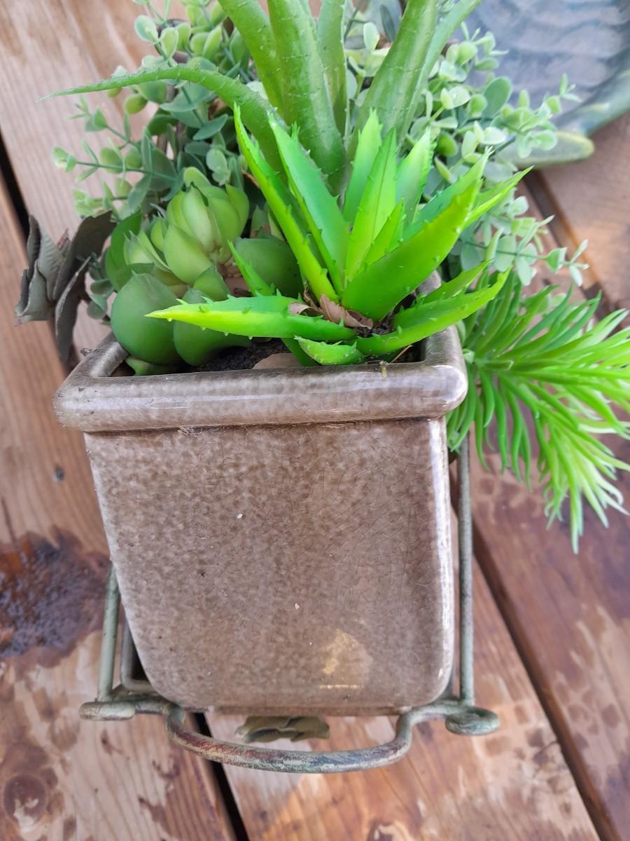 FAUX GREENERY IN METAL BASKET WITH ROSE ACCENT, FAUX GREENERY IN POT, AND A GIANT LEAF.