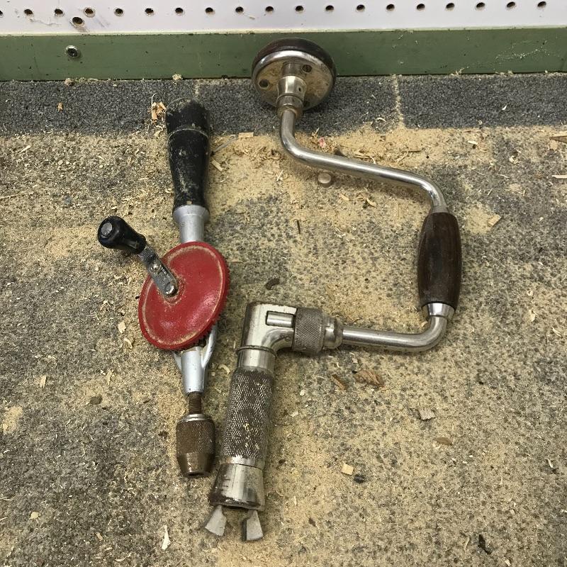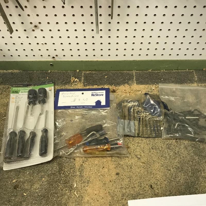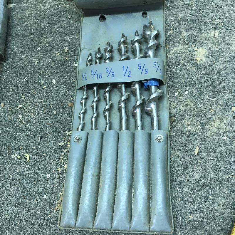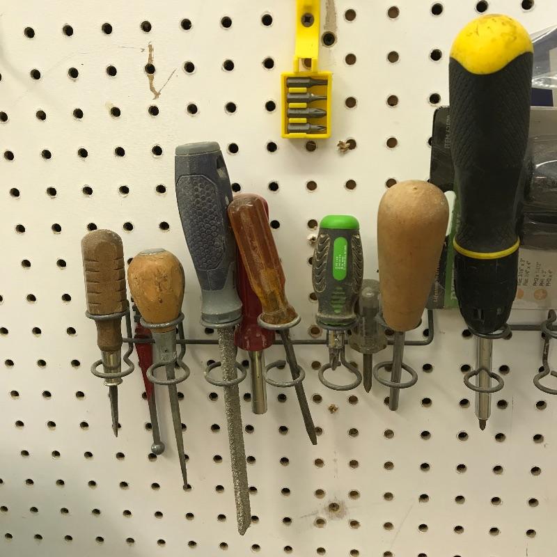 All shapes and sizes of screw drivers. Three vintage ones with a set of Auger Bits. Peg board hooks not included in Lot. Local pick up only.