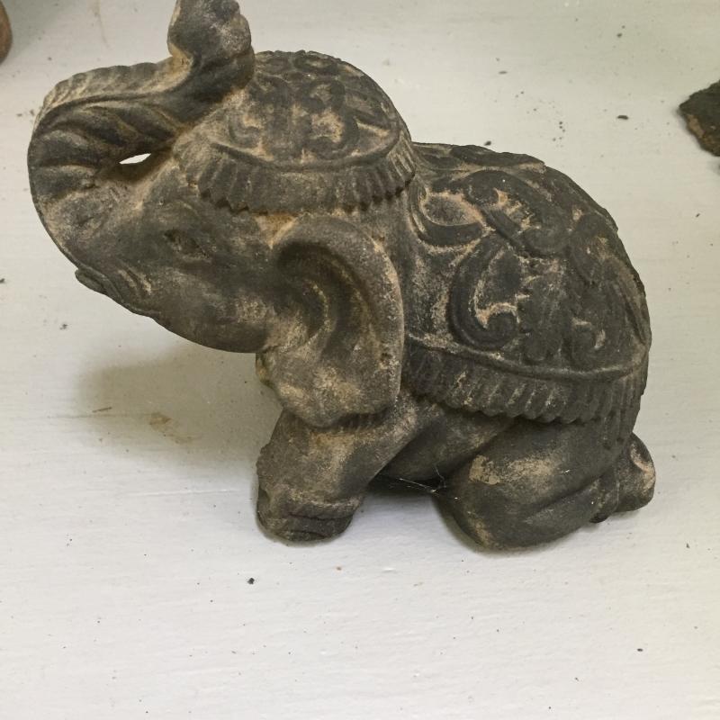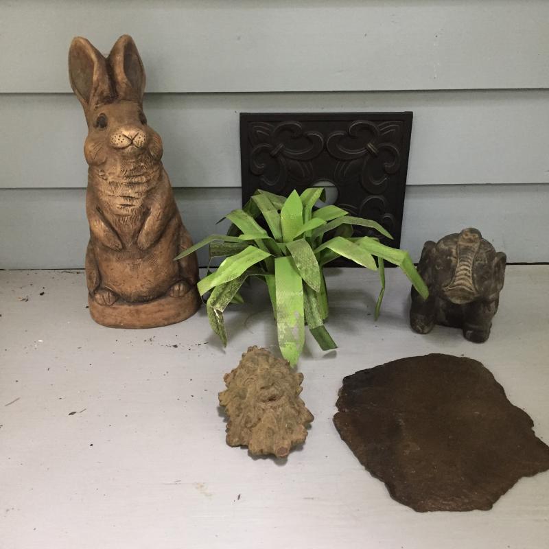 Assortment of decor. Includes concrete elephant and head are concrete. Rabbit measures 18” Tall. Fun green palm is made of metal. Local Pickup Only