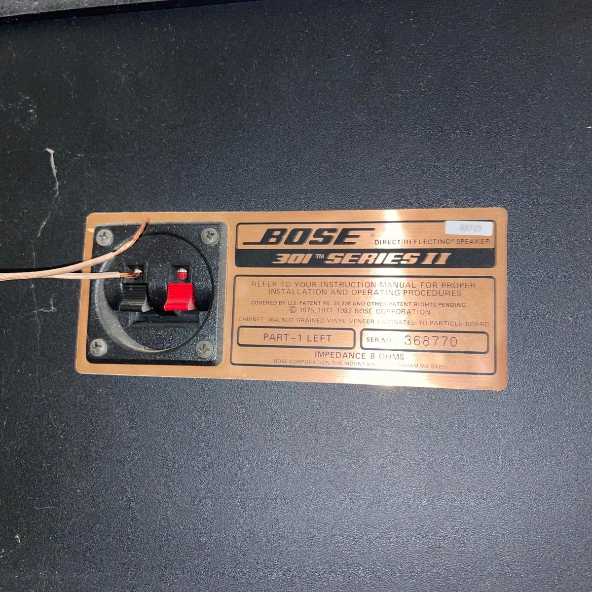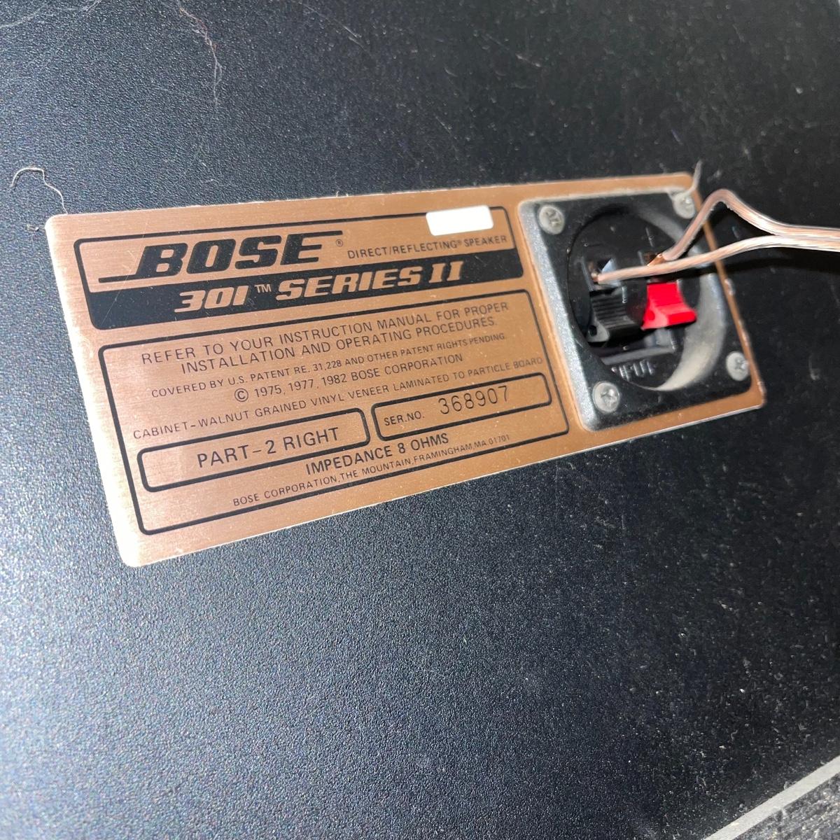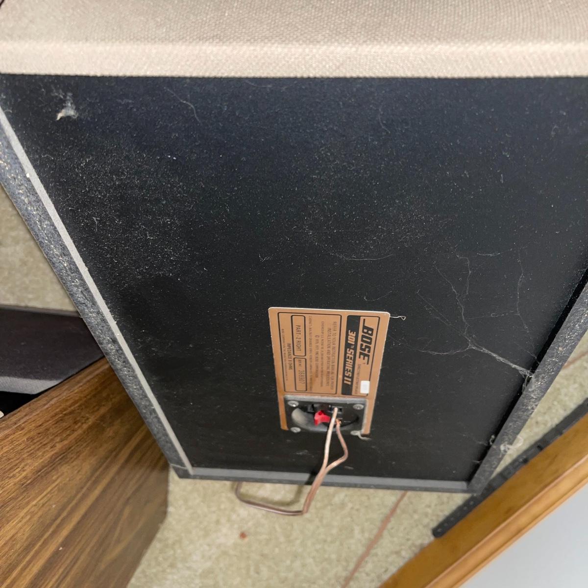 Two 301 Series 2 Bose speakers; model numbers 368770 for the left speaker and 368907 for the right. They have wooden frames and tan and black colored speaker fabric. They measure 10.5” x 9” x 17” and will need to be wiped down.