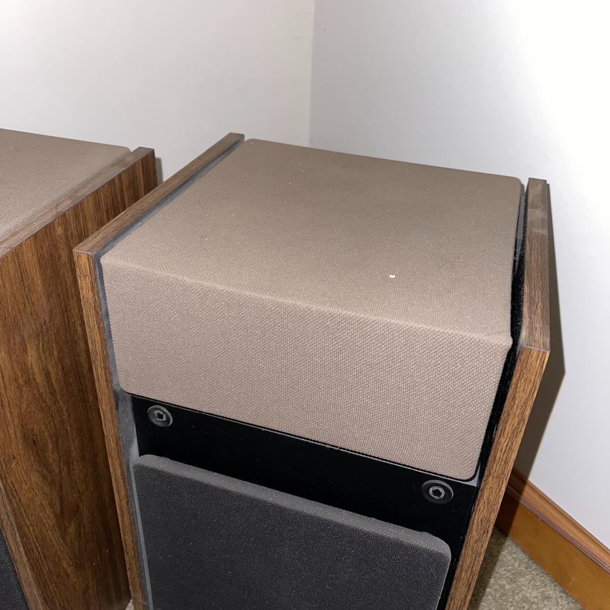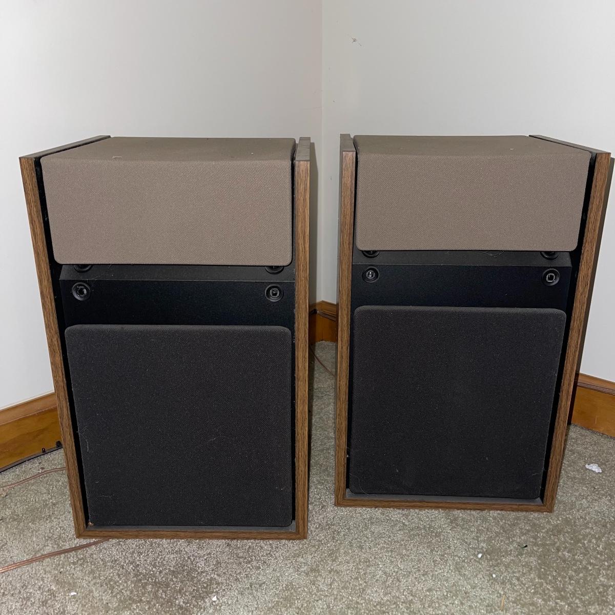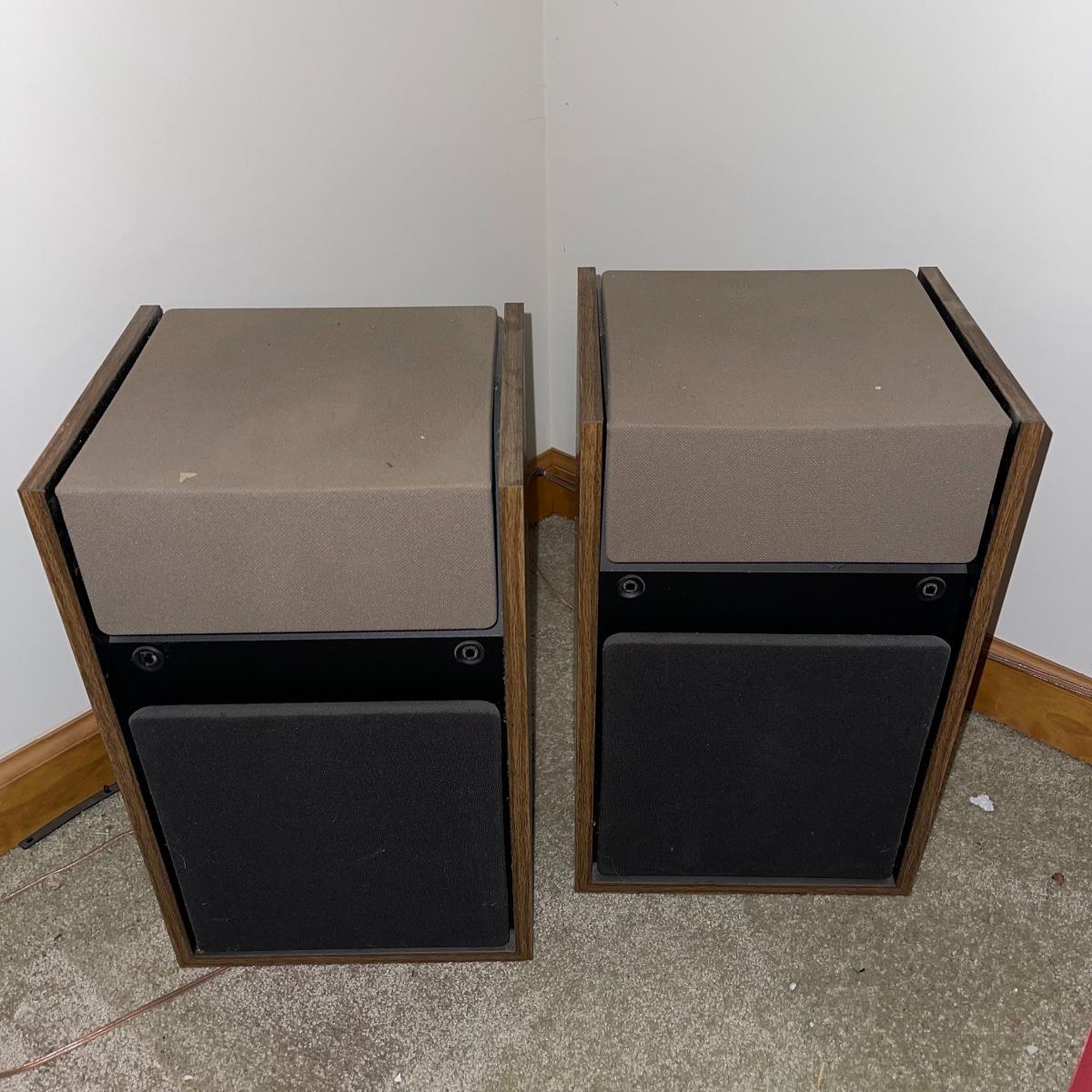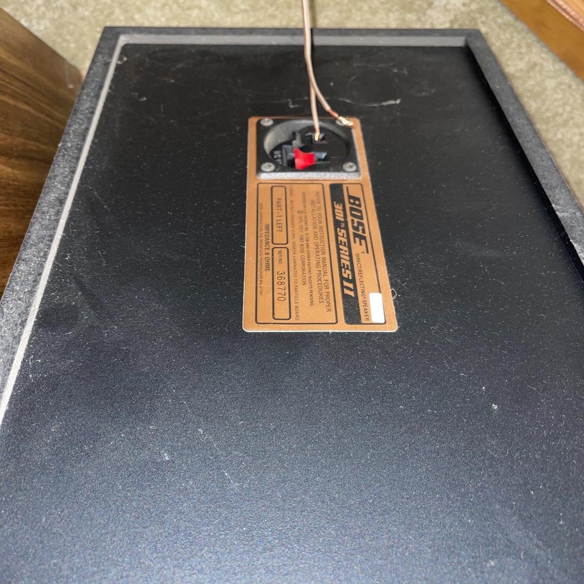 Two 301 Series 2 Bose speakers; model numbers 368770 for the left speaker and 368907 for the right. They have wooden frames and tan and black colored speaker fabric. They measure 10.5” x 9” x 17” and will need to be wiped down.