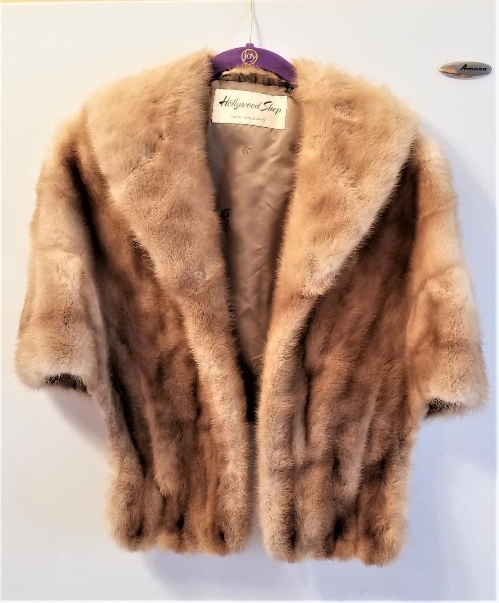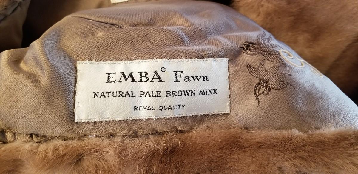 Emba Fawn Natural Pale Brown Mink stole from the Hollywood Shop in New Orleans. 21" long. Would fit up to a size 12 or so. Lining is good.