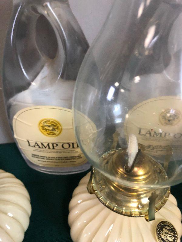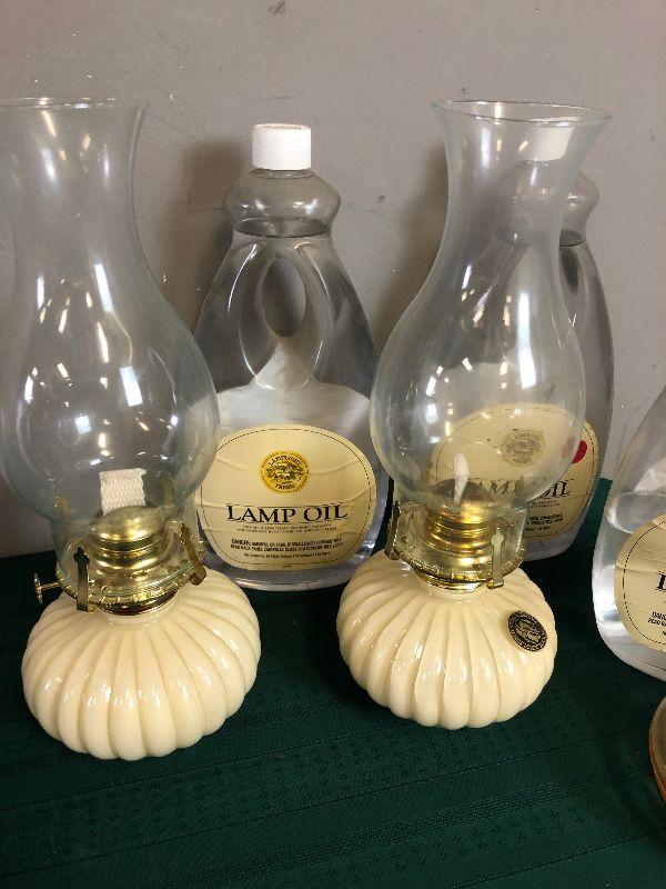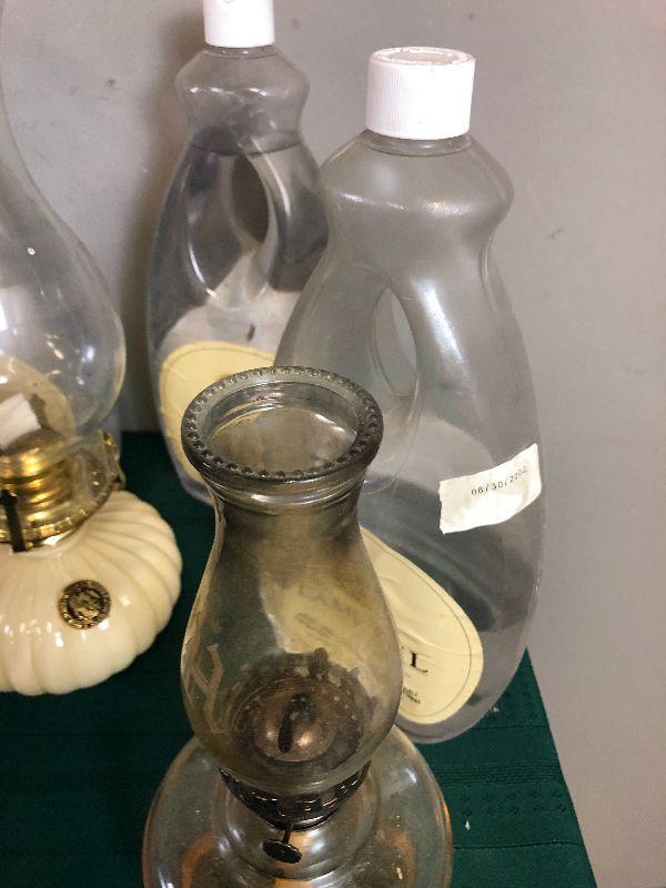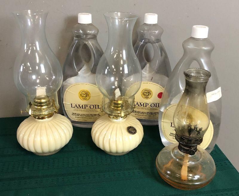 Lot # 291 3 Hurricane oil lamps & 3 jugs of oil
