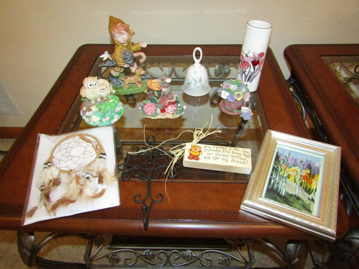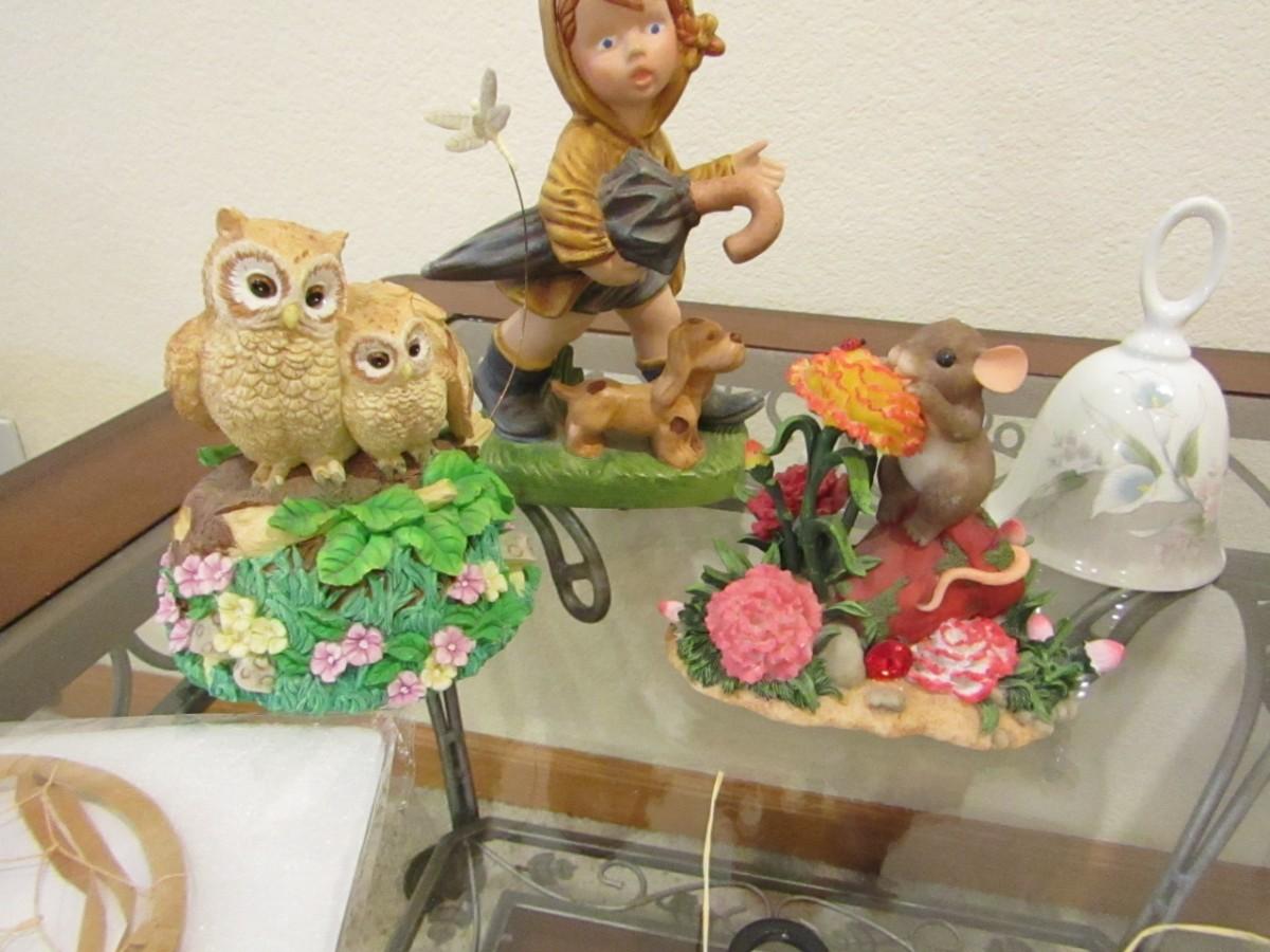 DREAM CATCHER, FRAMED PICTURE, IRON HOOKED WALL HANGER, MUSICAL OWLS WITH SAN FRANCISCO MUSIC BOX COMPANY, MOUSE IN FLOWERS BY CHARMING TAILS, BELL AND FIGURE
