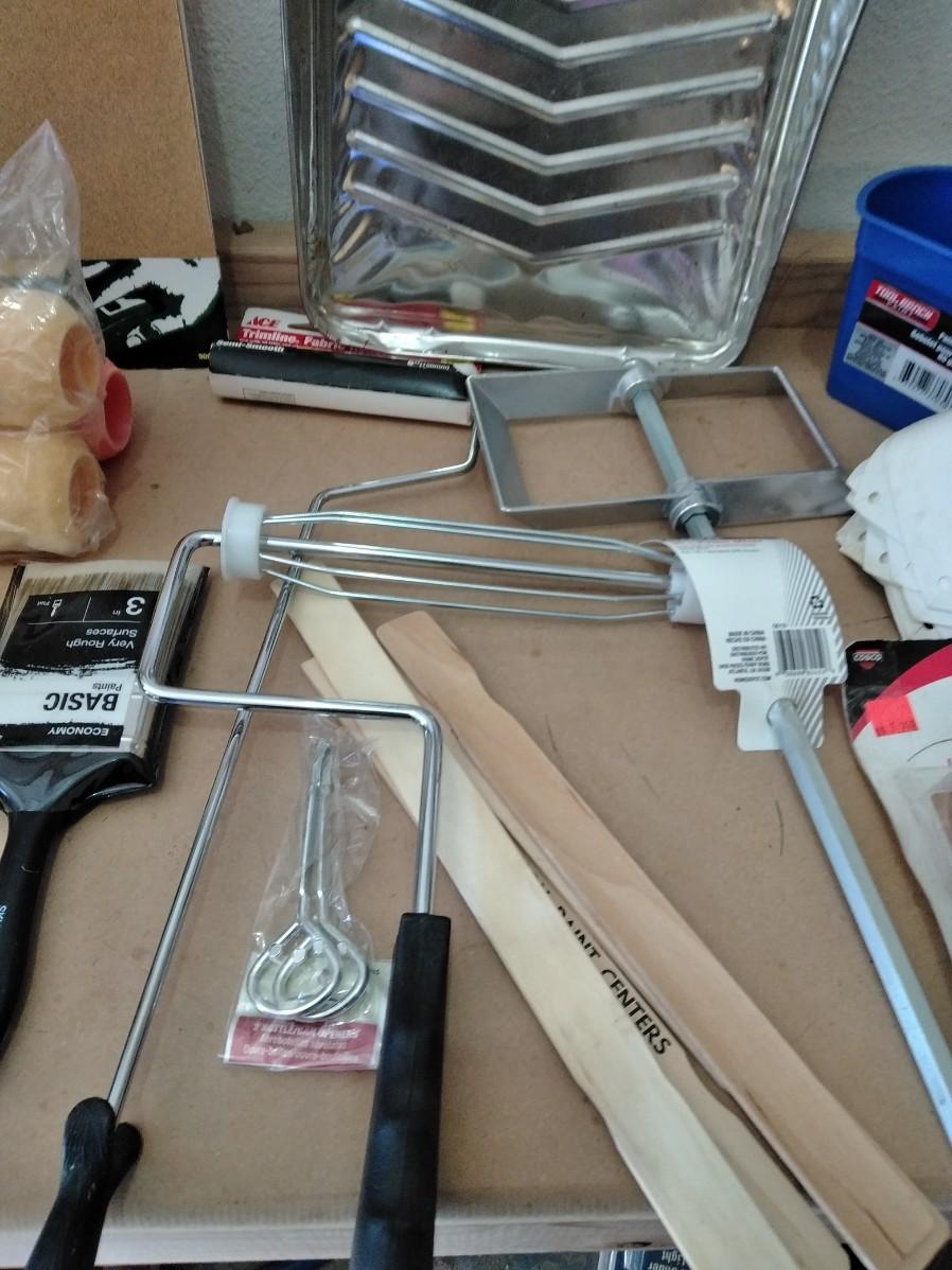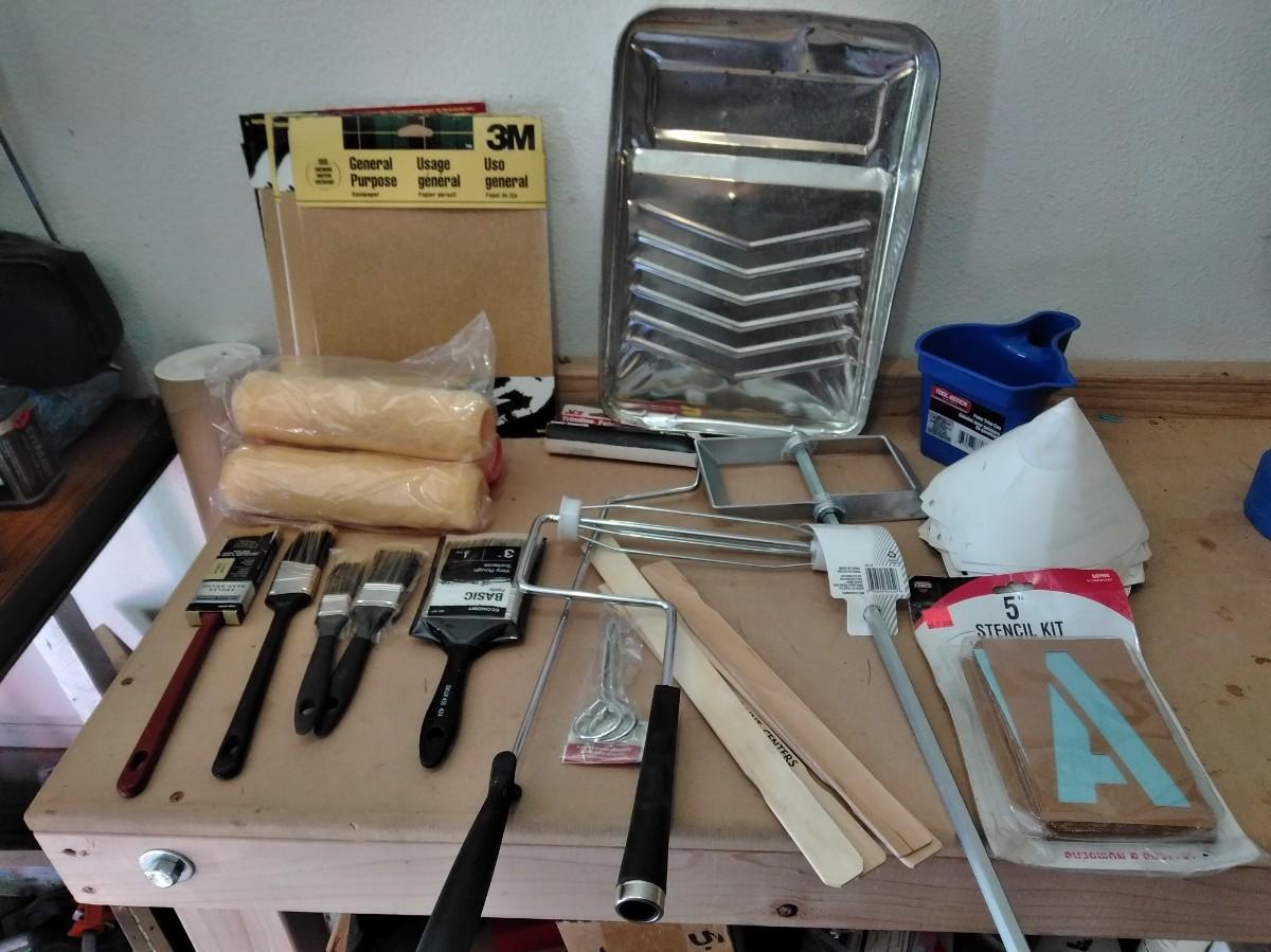 SANDPAPER, PAINT BRUSHES, PAINT PAN, PAINT FILTERS, STENCIL KIT, 30" POWER MIXER AND MORE