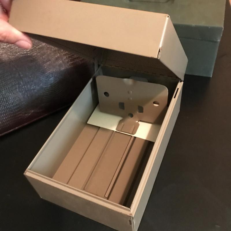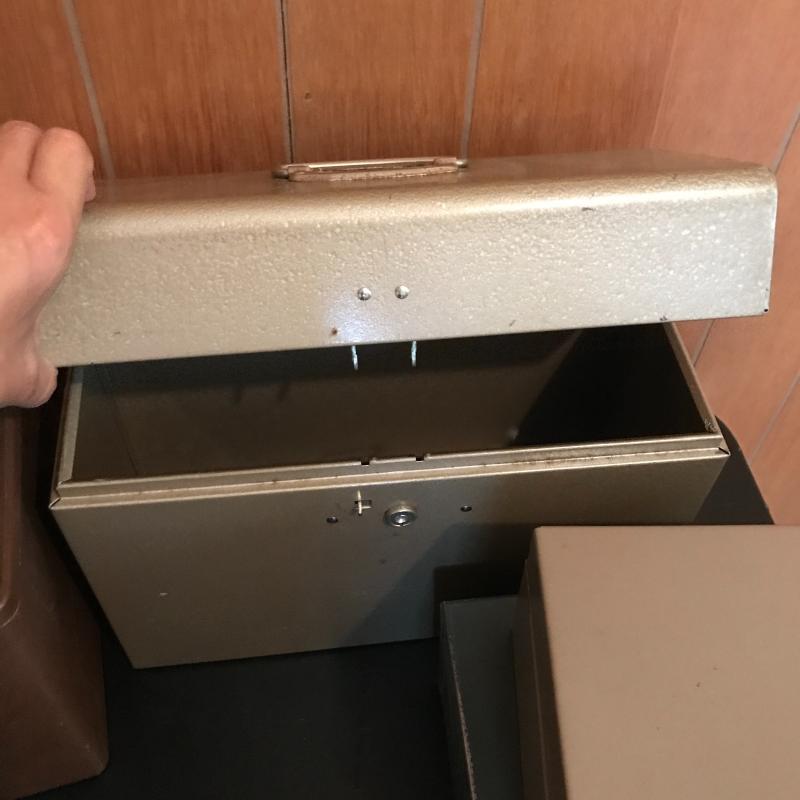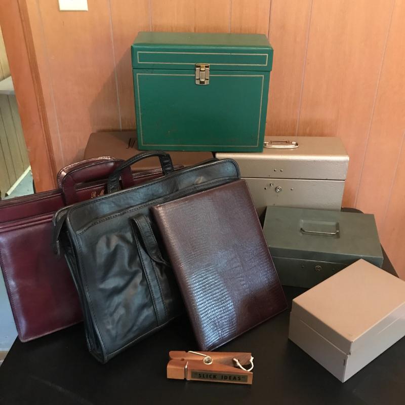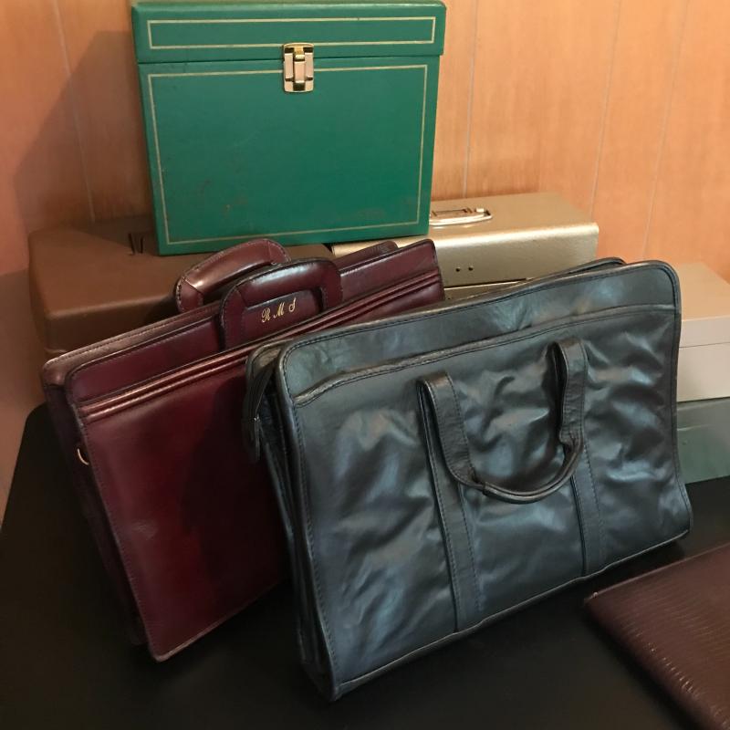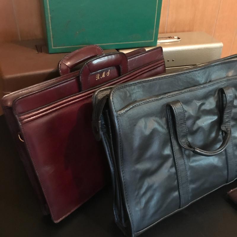 Look professional with one of these briefcases for work or give it to that new college grad. Also includes storage boxes to keep your items secure. The reddish leather briefcase has initials imprinted on top. Largest brown plastic box measures 12” x 9” x 11”. No Shipping. Local pick up only
