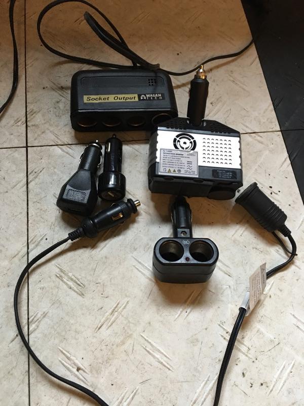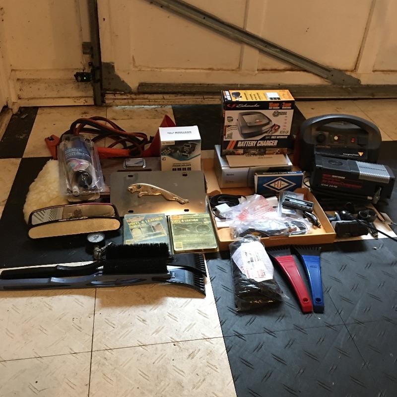 Car folks will love this selection of car and car related accessories that include power inverter, 12v extensions, battery charger, Sears 12v air inflator, Pioneer model # CDX-FM1289 12 disc CD changer , ice scrapers, jumper cables, cargo net, old school wooden cup holder and more.