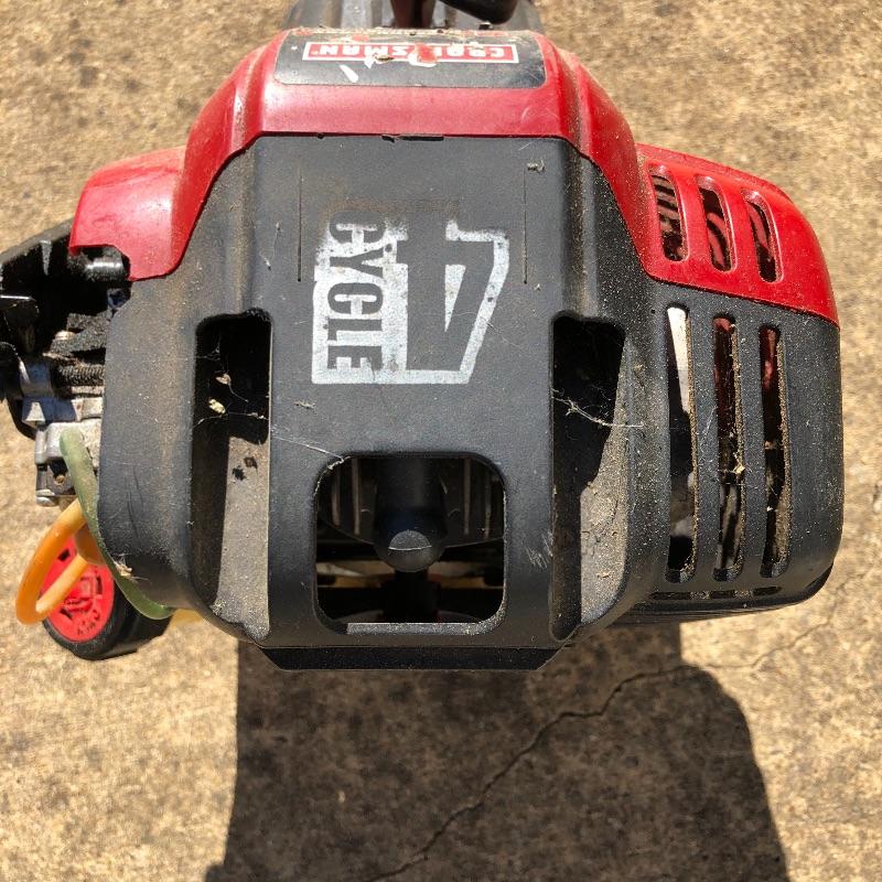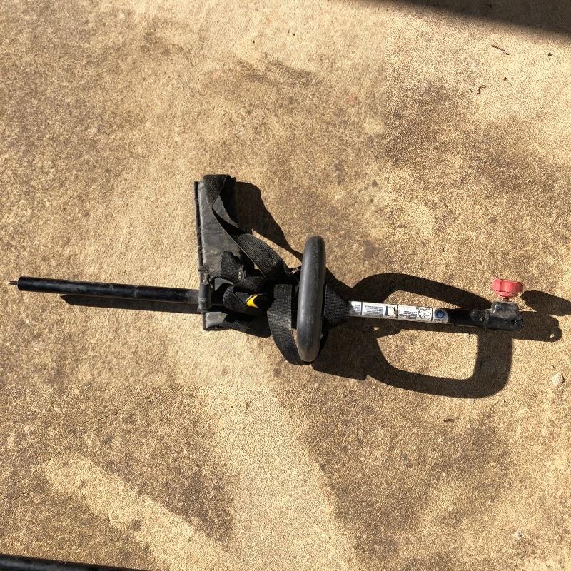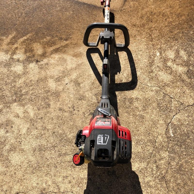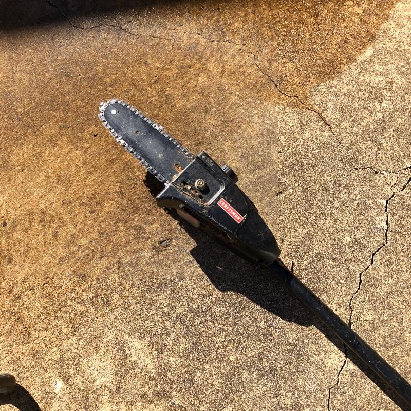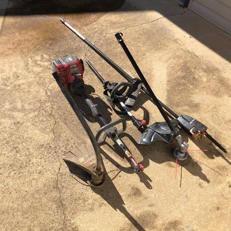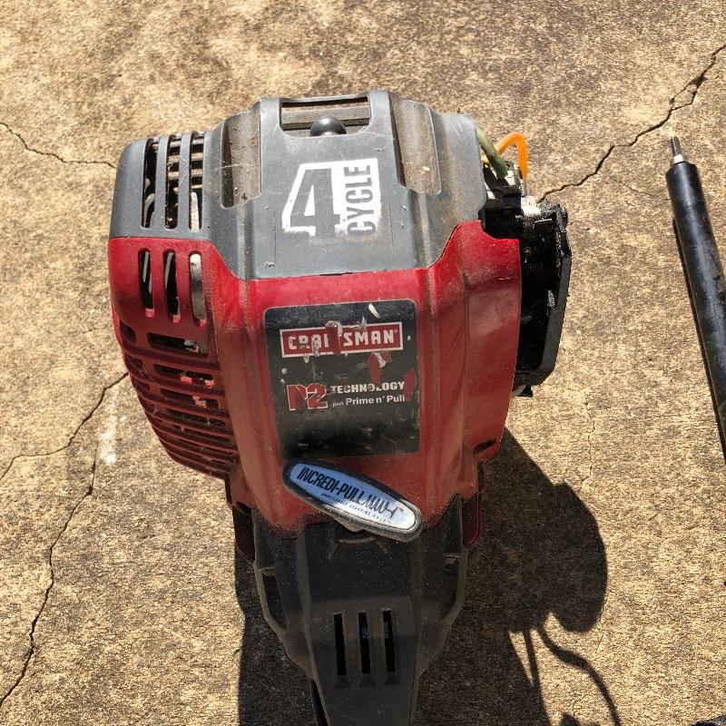 Get you yard tidied with this versatile tool. Lot includes Craftsman four cycle power head, one strait and one curved grass trimmer, pole saw and a extension. Engine was not started as it has no gas.