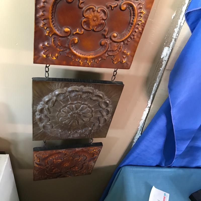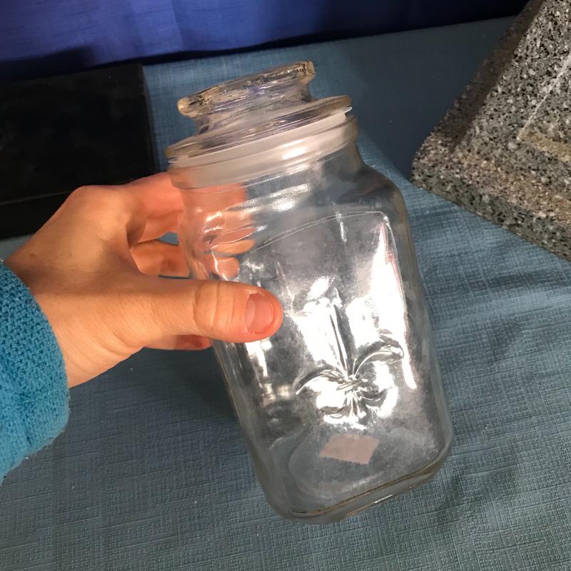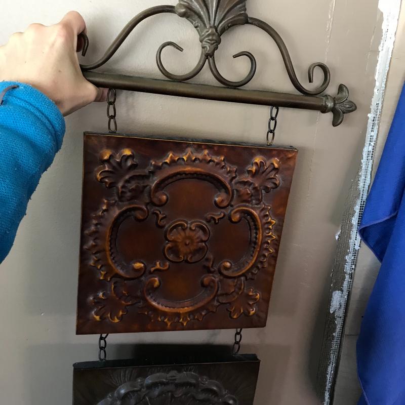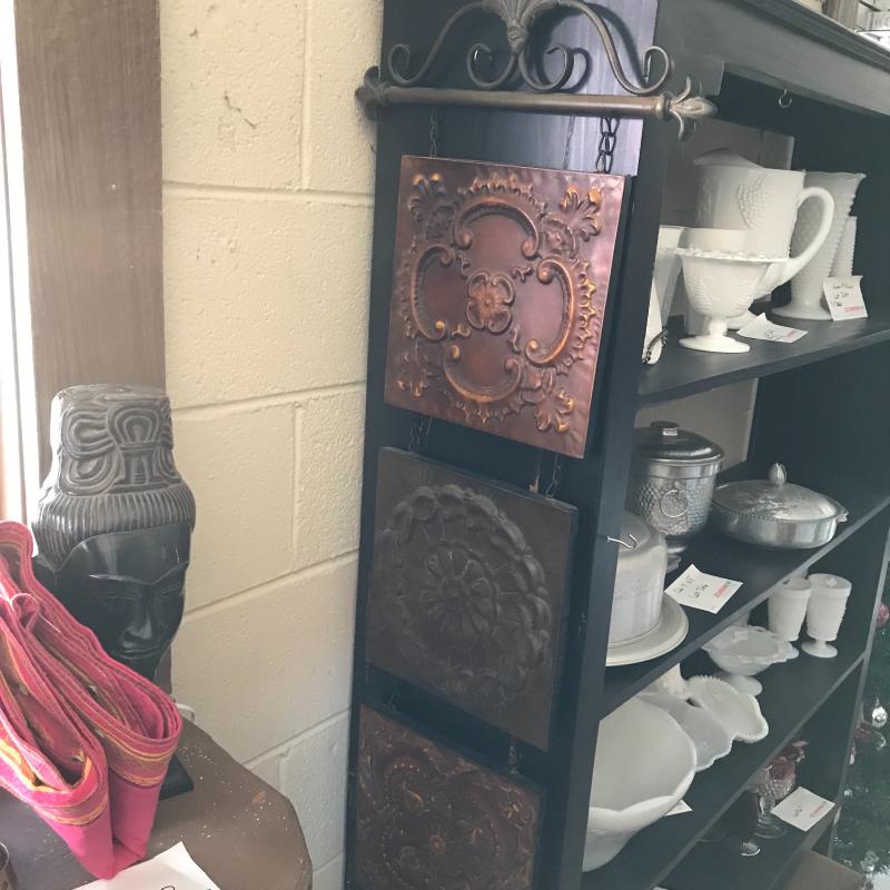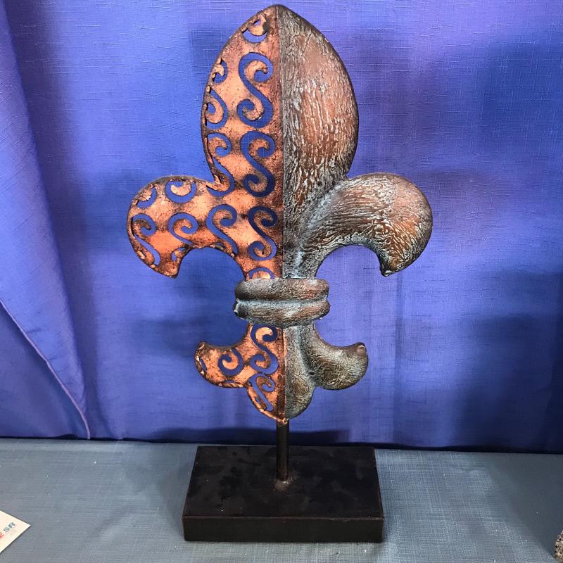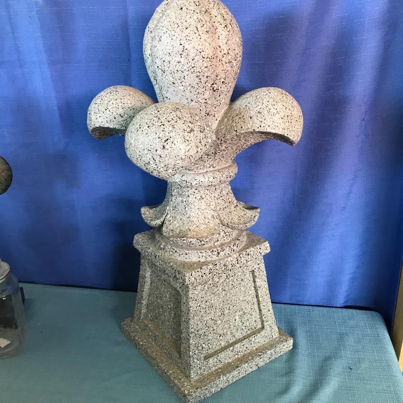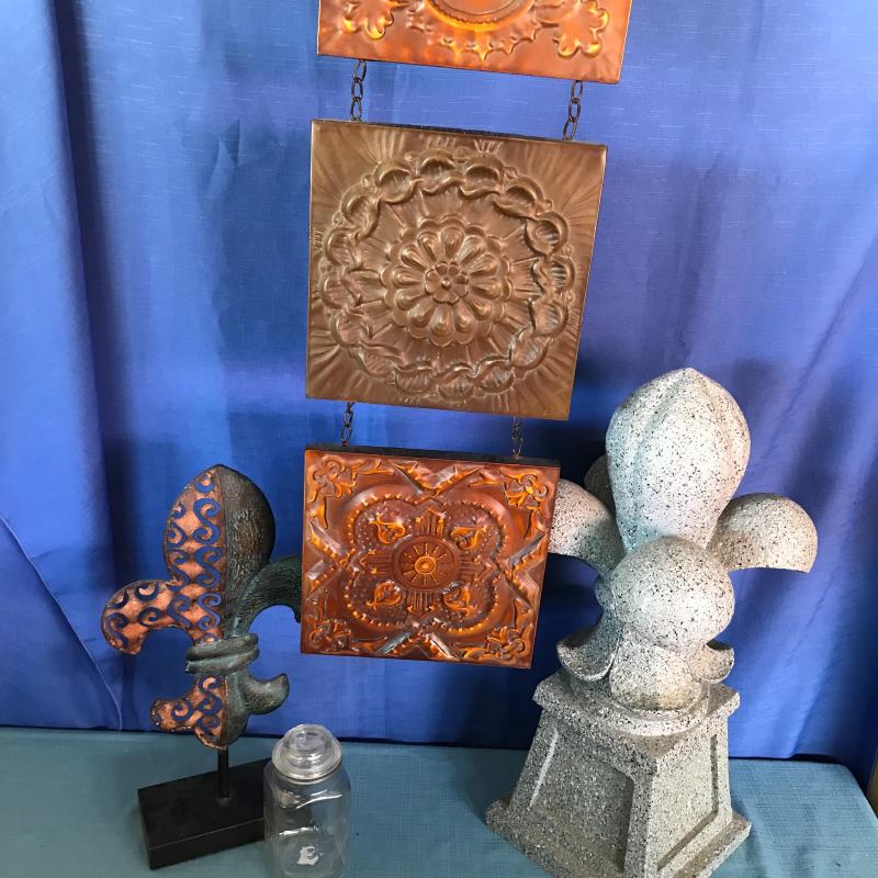 Lot includes three decorative pieces and a lidded jar. Largest Fleur-de-lis piece measures approx. 24” tall and appears to be made of lightweight plaster. Does not include items in photograph on black shelf. No shipping available. Local pickup only in Maggie Valley, NC.