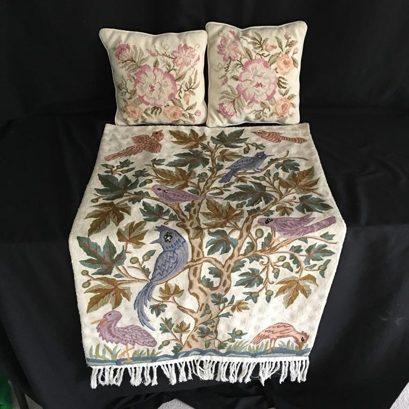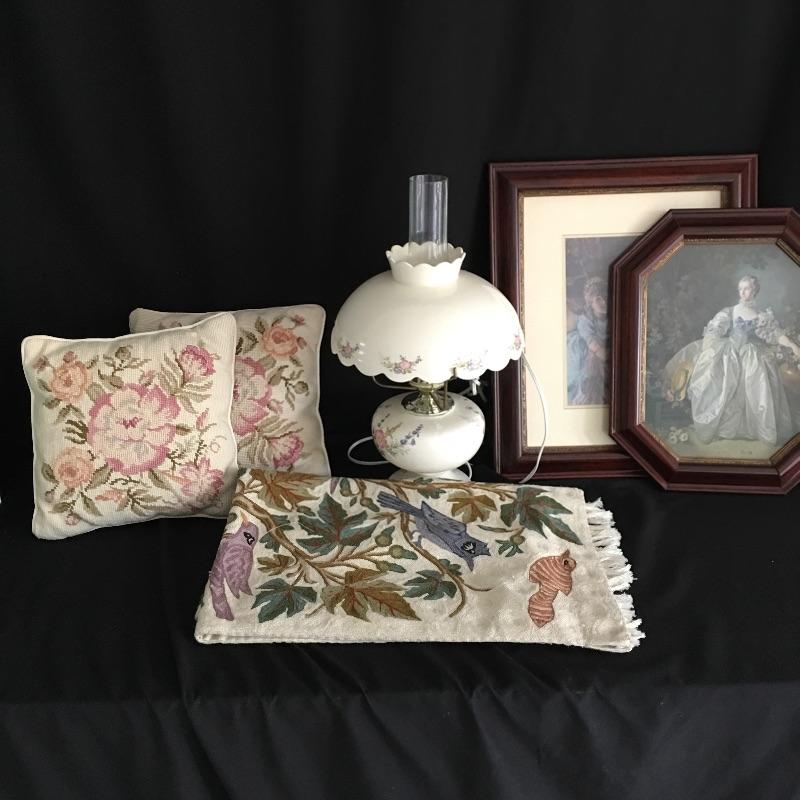 Beautify your space with this array of botanical and bird related items. Included here are two framed pieces of artwork, two small embroidered pillows, a charming porcelain table lamp and a lovely bird themed wall hanging that measures 26.5” x 39”. Largest framed artwork measures 15.5” x 18.5”.