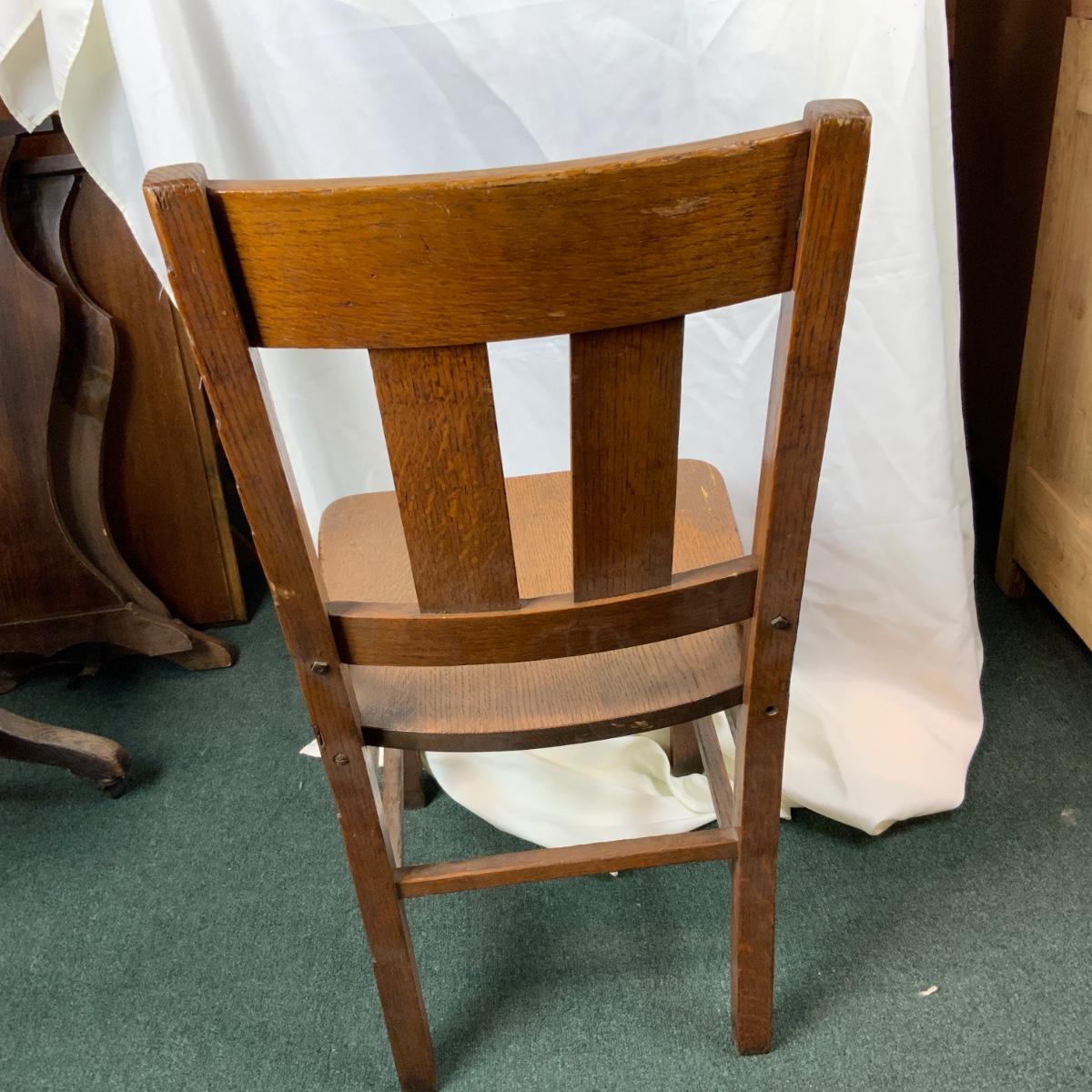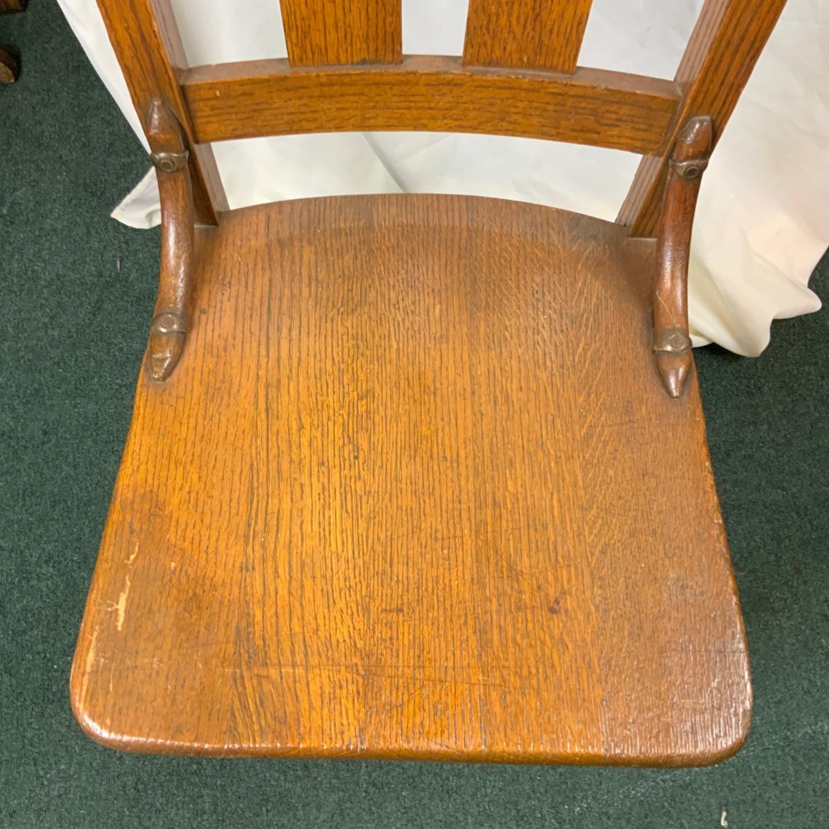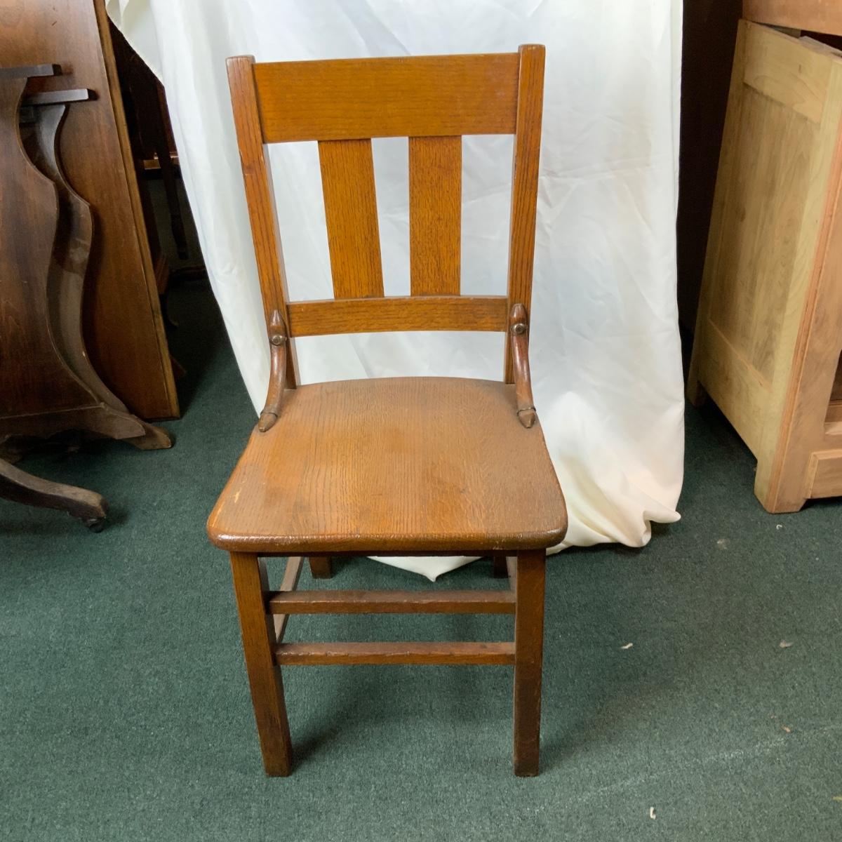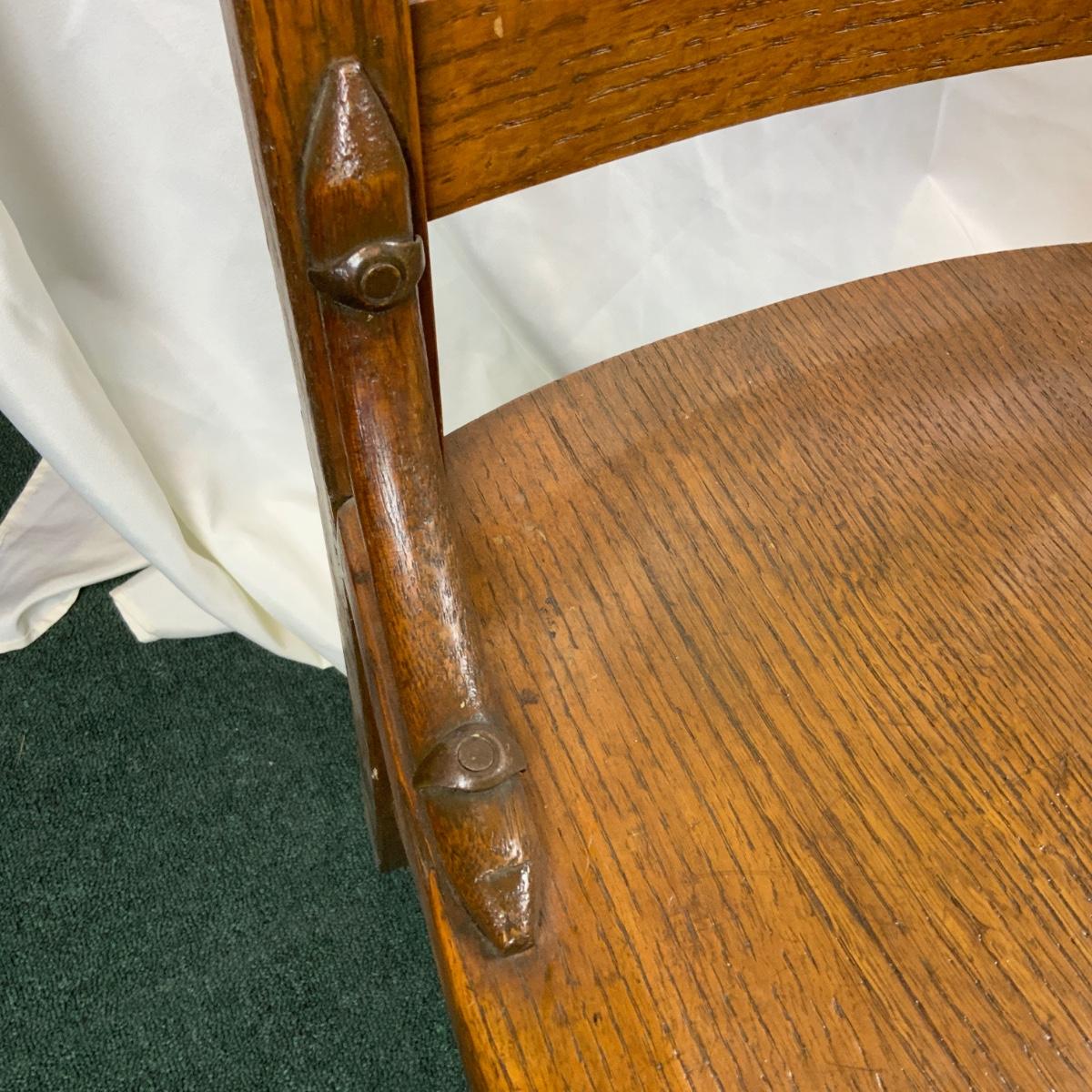 Solid, oak chair. Very sturdy and would work well with a desk. Has metal cigar band protectors on the screws. Please see photos for details and condition. //::\\ Please see photos for details and condition. No attempt has been made to hide any imperfections. All items listed in this auction are warehouse items, and need to be cleaned. A majority of the items need restoration as well. All items are sold AS IS and WITHOUT GUARANTEE. If you are uncertain about an item, DO NOT BID. Due to the nature of this online auction in-person inspection is HIGHLY recommended. All Sales are FINAL. Pick Up Times are FIRM. Please confirm with your own schedule that you can pick up in the scheduled times listed in the Terms and Conditions. Any questions please message the auctioneer. DO NOT Contact The Harp Gallery.