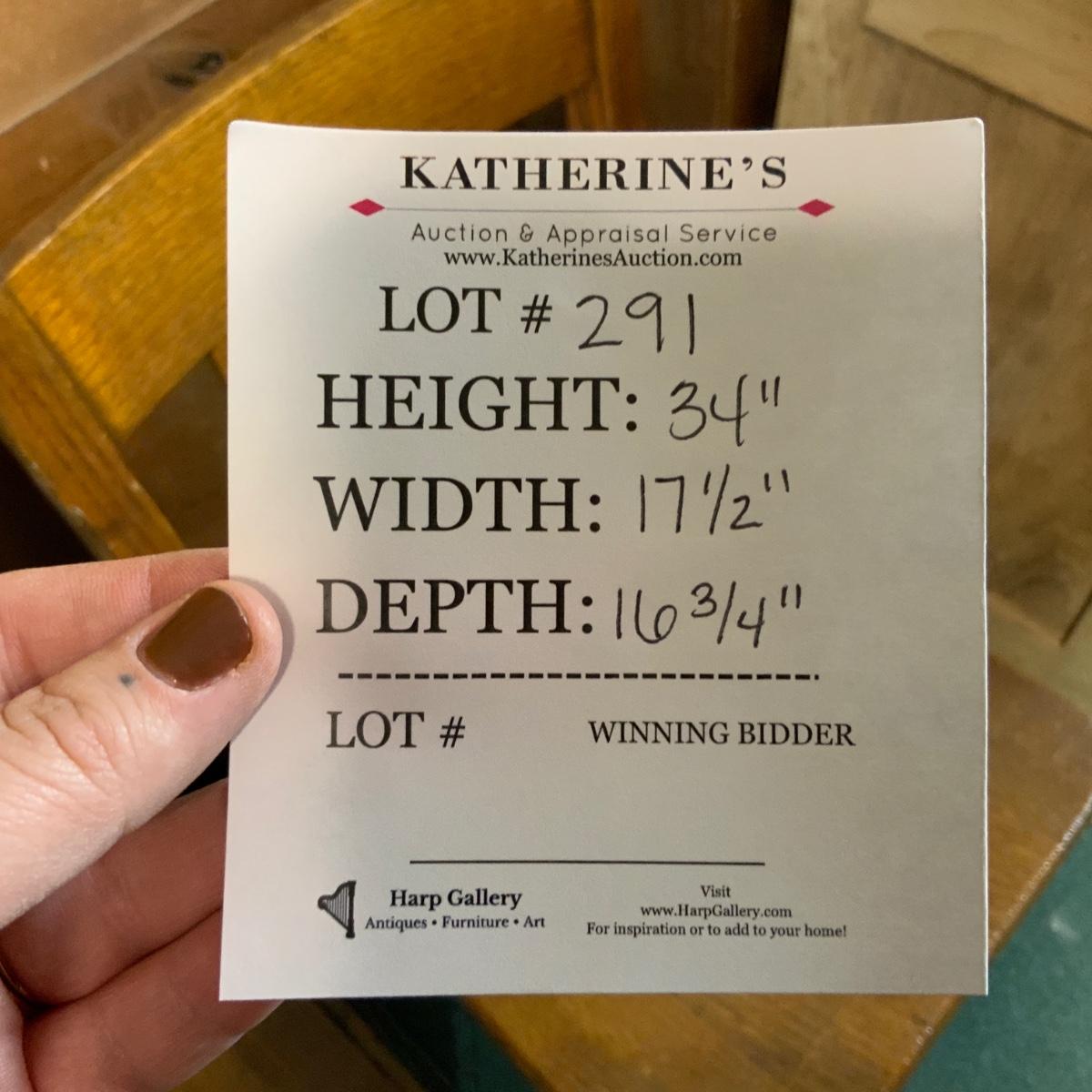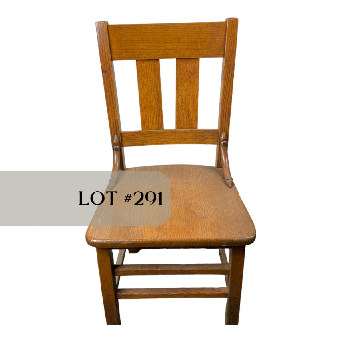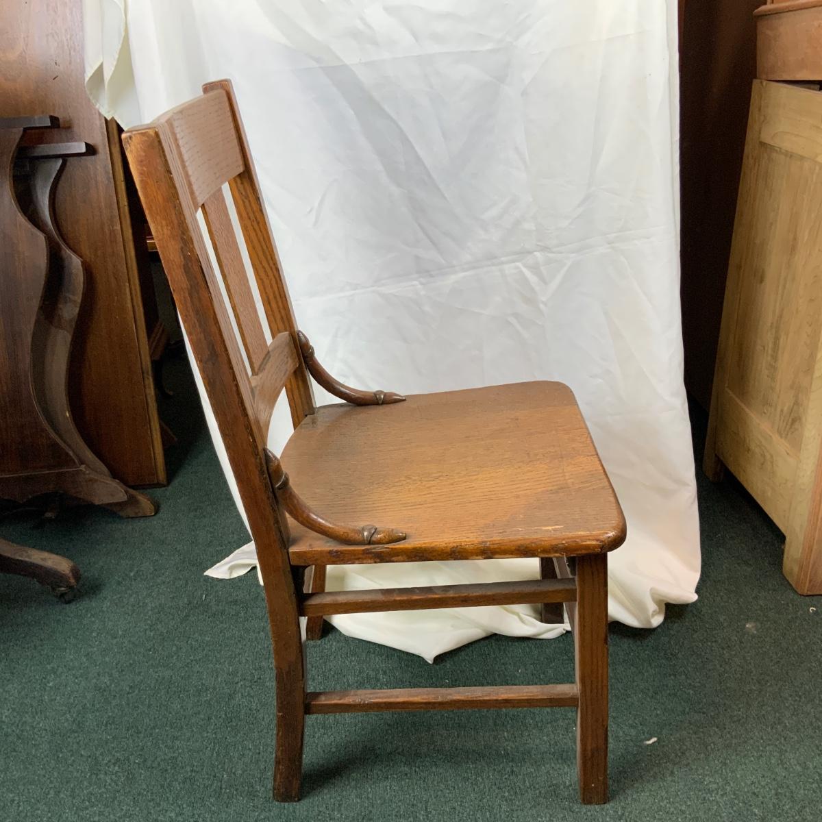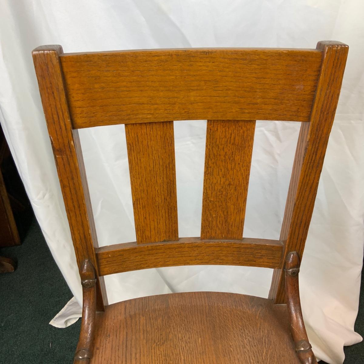 Solid, oak chair. Very sturdy and would work well with a desk. Has metal cigar band protectors on the screws. Please see photos for details and condition. //::\\ Please see photos for details and condition. No attempt has been made to hide any imperfections. All items listed in this auction are warehouse items, and need to be cleaned. A majority of the items need restoration as well. All items are sold AS IS and WITHOUT GUARANTEE. If you are uncertain about an item, DO NOT BID. Due to the nature of this online auction in-person inspection is HIGHLY recommended. All Sales are FINAL. Pick Up Times are FIRM. Please confirm with your own schedule that you can pick up in the scheduled times listed in the Terms and Conditions. Any questions please message the auctioneer. DO NOT Contact The Harp Gallery.
