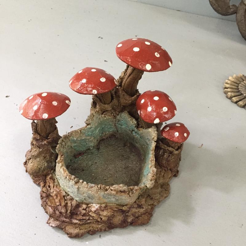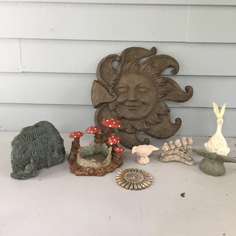 Assortment of Garden Decorations. Mostly resin. Lot includes a fun mushroom planter and wall plaques. Sun measures 20” tall.