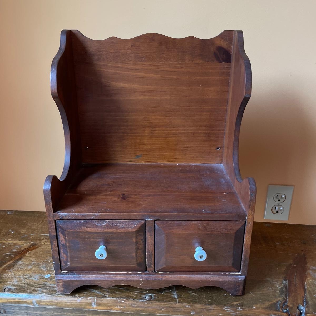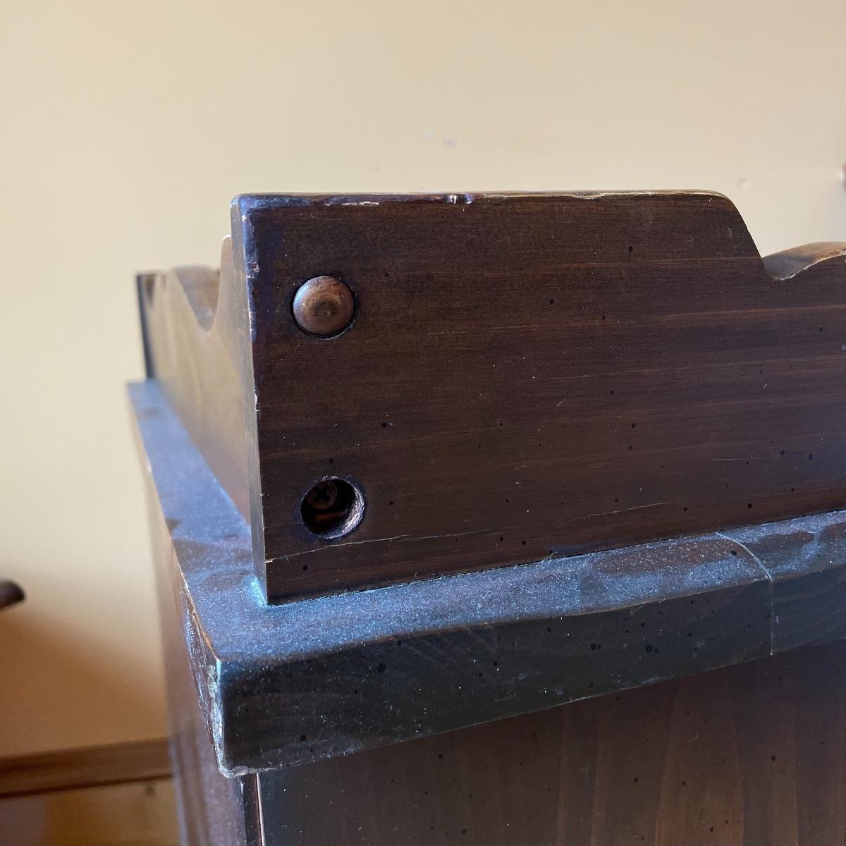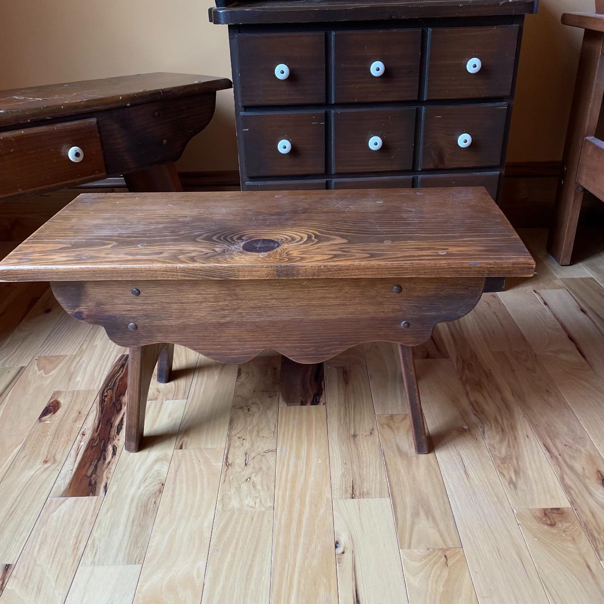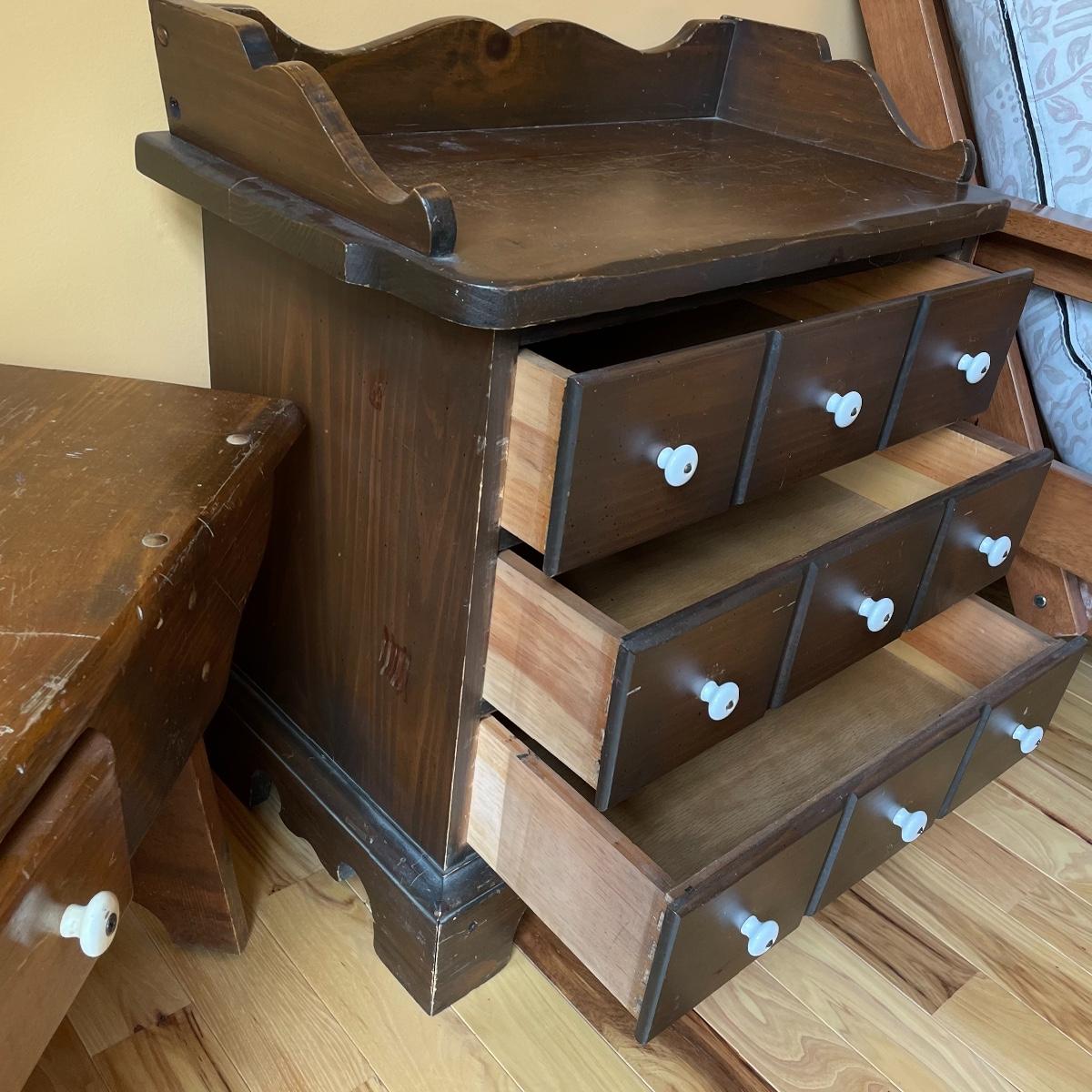 This lot offers four nice, sturdy pieces of fine crafted wooden furniture. There is a pair of benches perfect for sitting or displays by Georgia based B & B Woodcrafters. The smaller one is in very nice shape with a faux drawer, the larger measures 36” x 11” x 17”. The larger has some blemishes as seen in photos and a working drawer. This bench doesn’t appear to be stamped by the manufacturer. Next we have a couple darker wooden items including a faux curio chest of drawers and a desk organizer. The chest of three dovetail drawers has nine pulls and and elegant look. This item measures 24” x 14” x 25.75”. See images. Local pick up only.