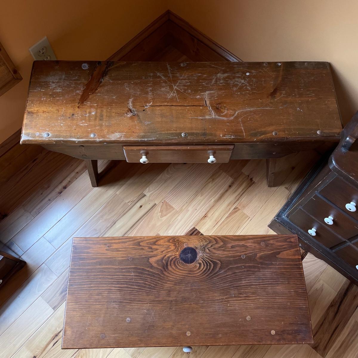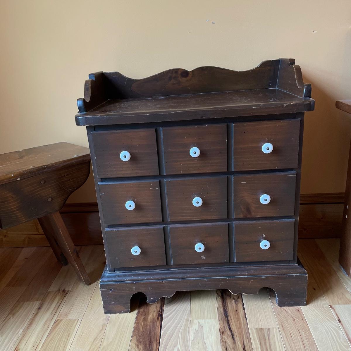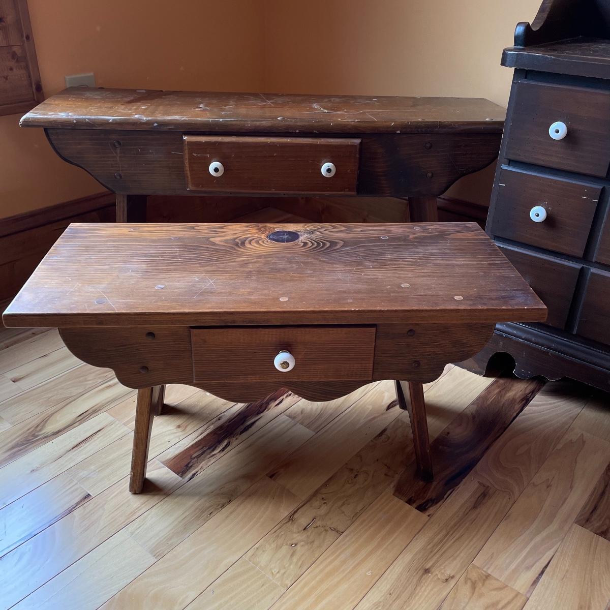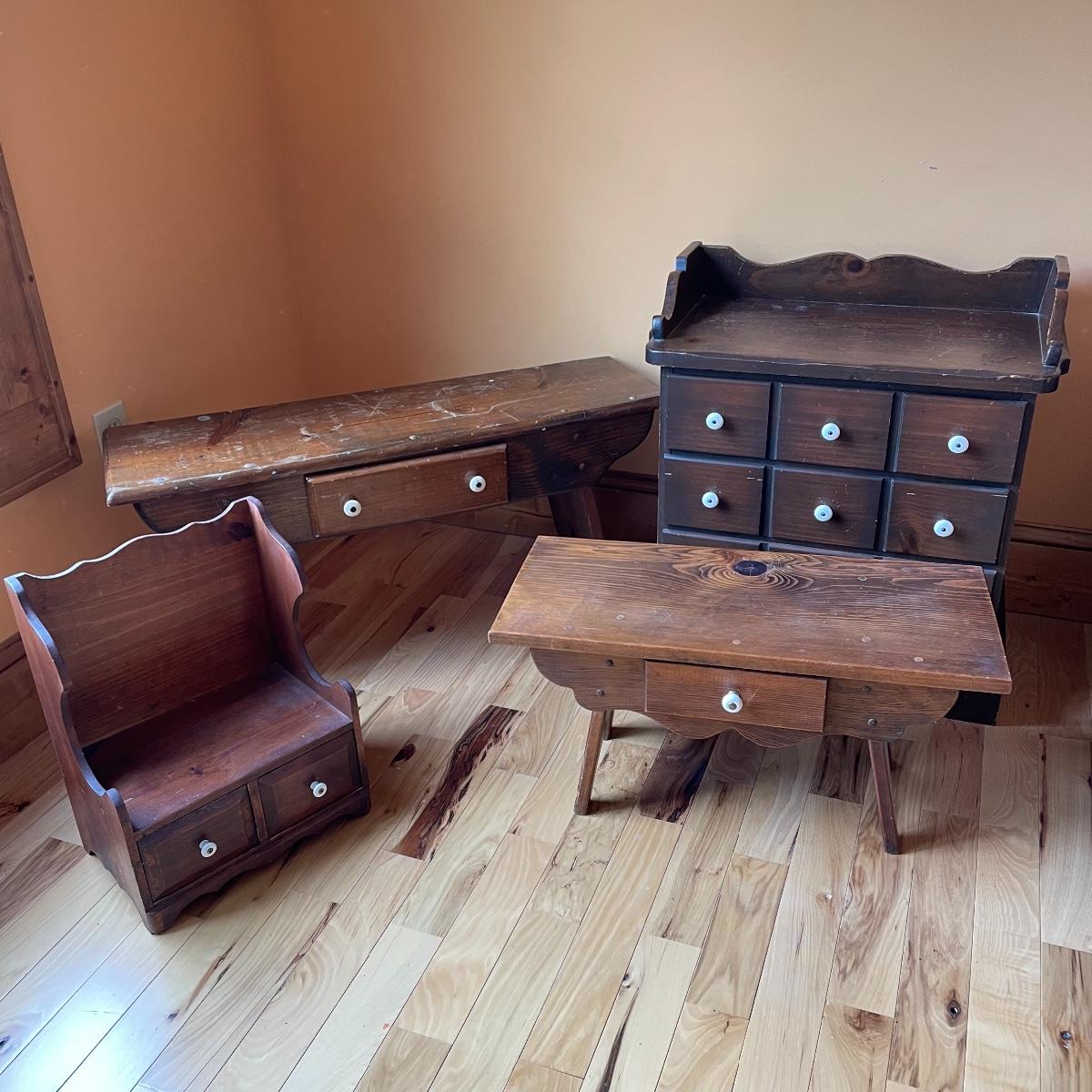 This lot offers four nice, sturdy pieces of fine crafted wooden furniture. There is a pair of benches perfect for sitting or displays by Georgia based B & B Woodcrafters. The smaller one is in very nice shape with a faux drawer, the larger measures 36” x 11” x 17”. The larger has some blemishes as seen in photos and a working drawer. This bench doesn’t appear to be stamped by the manufacturer. Next we have a couple darker wooden items including a faux curio chest of drawers and a desk organizer. The chest of three dovetail drawers has nine pulls and and elegant look. This item measures 24” x 14” x 25.75”. See images. Local pick up only.
