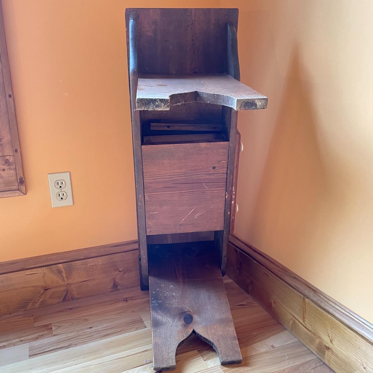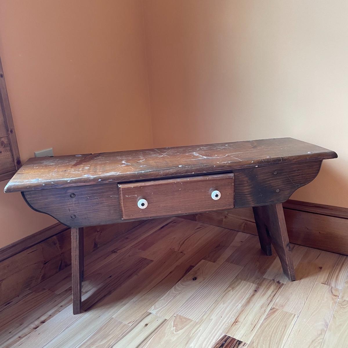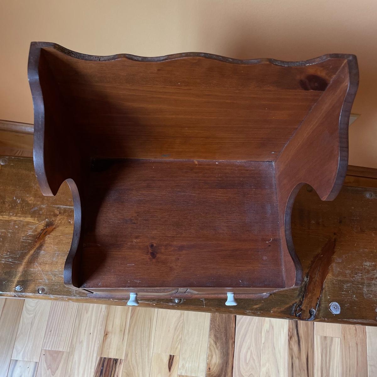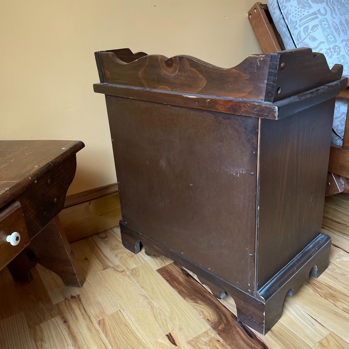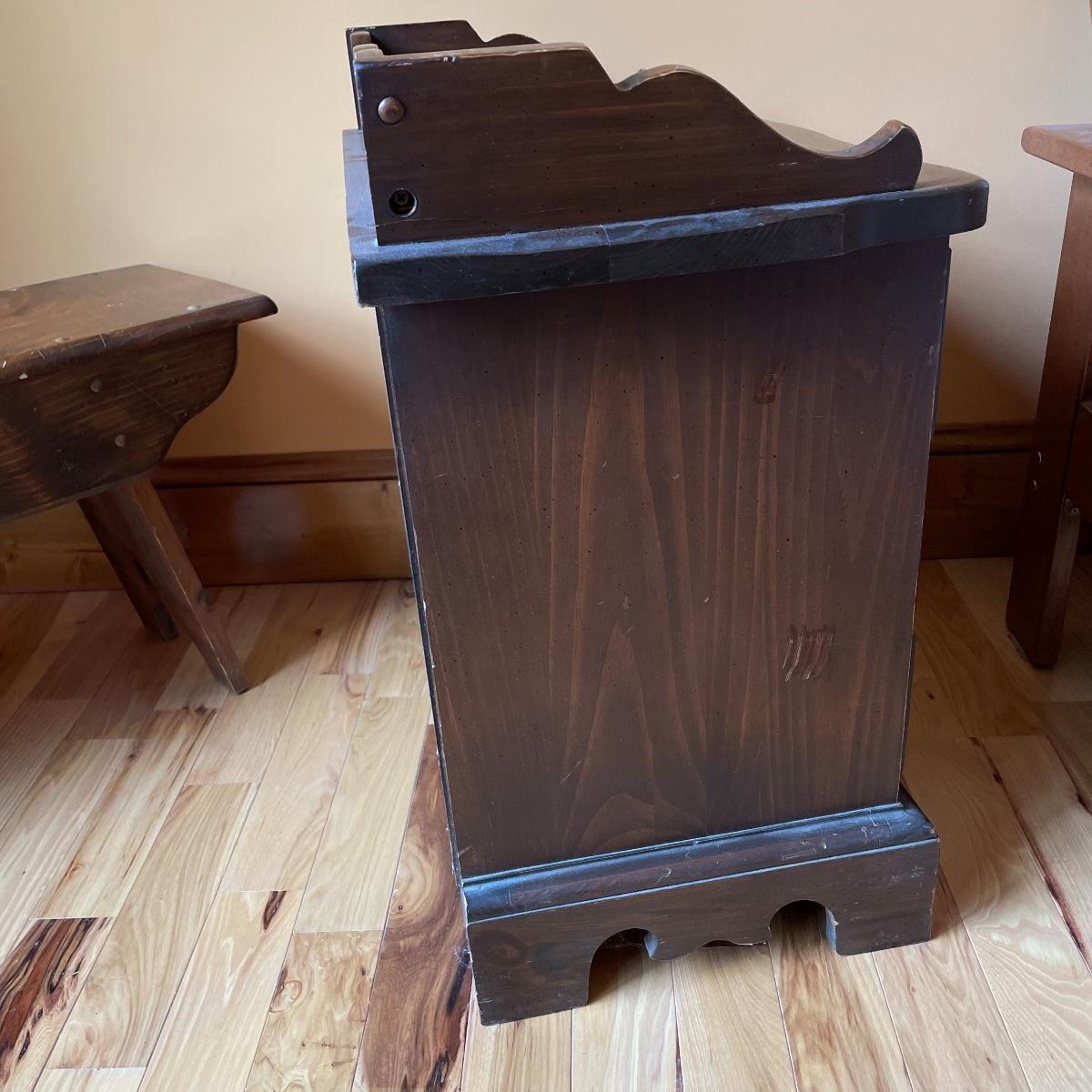 This lot offers four nice, sturdy pieces of fine crafted wooden furniture. There is a pair of benches perfect for sitting or displays by Georgia based B & B Woodcrafters. The smaller one is in very nice shape with a faux drawer, the larger measures 36” x 11” x 17”. The larger has some blemishes as seen in photos and a working drawer. This bench doesn’t appear to be stamped by the manufacturer. Next we have a couple darker wooden items including a faux curio chest of drawers and a desk organizer. The chest of three dovetail drawers has nine pulls and and elegant look. This item measures 24” x 14” x 25.75”. See images. Local pick up only.