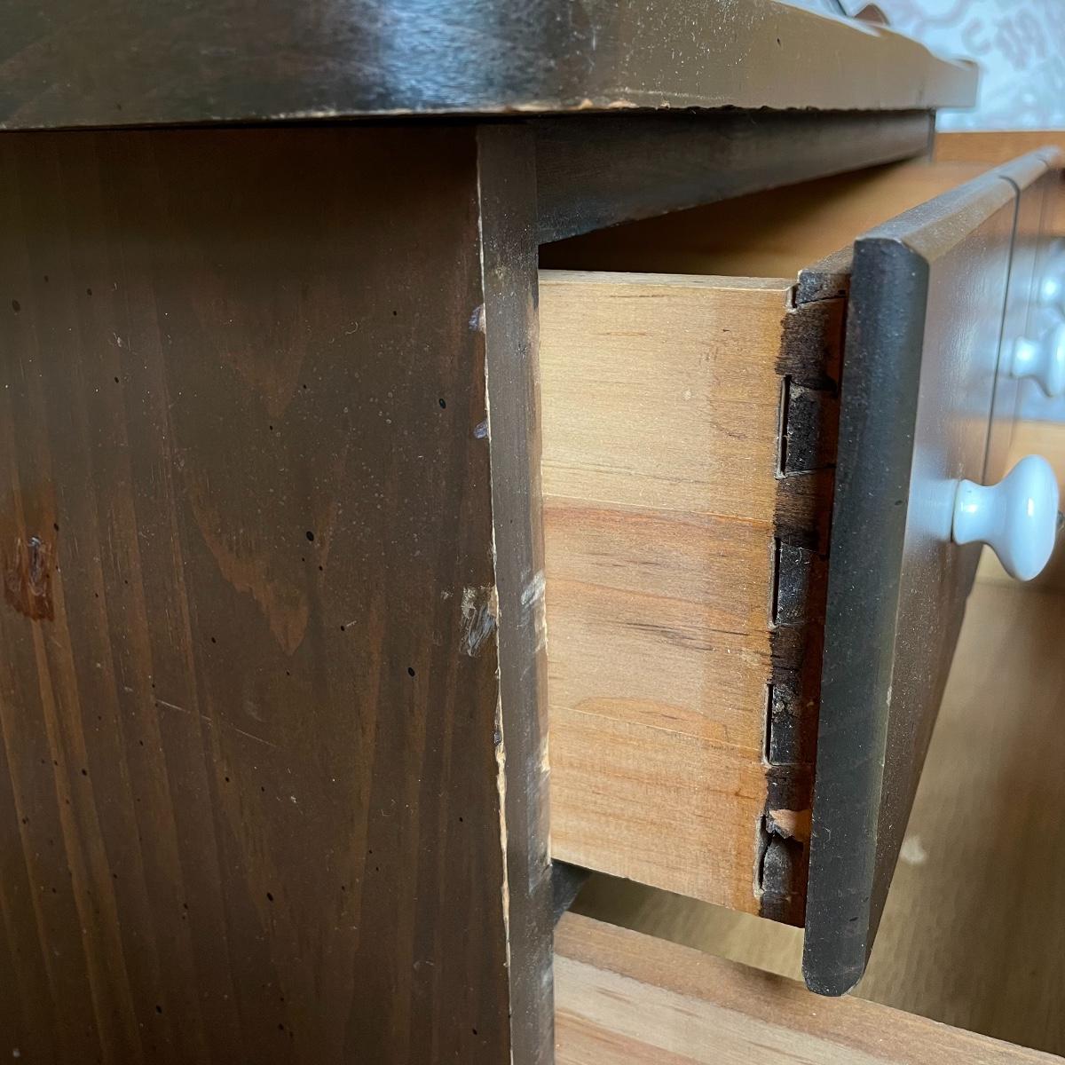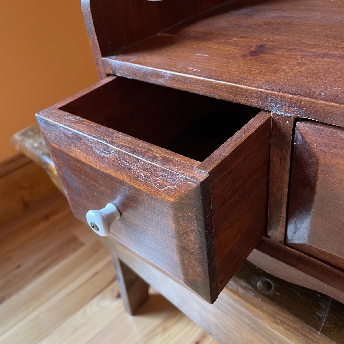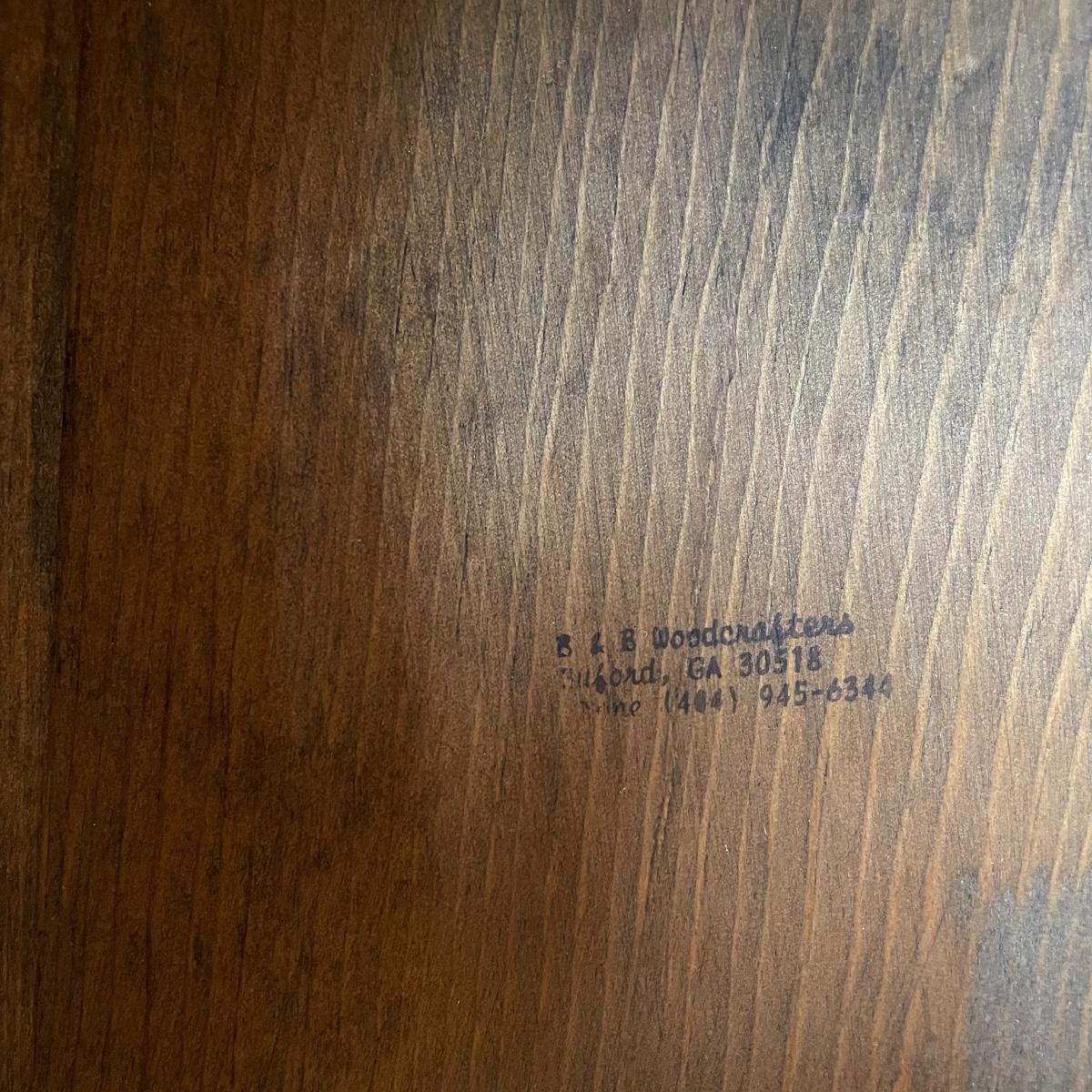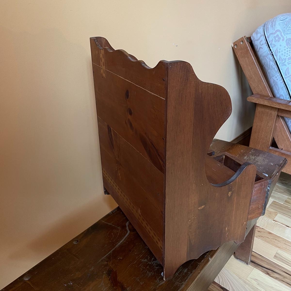 This lot offers four nice, sturdy pieces of fine crafted wooden furniture. There is a pair of benches perfect for sitting or displays by Georgia based B & B Woodcrafters. The smaller one is in very nice shape with a faux drawer, the larger measures 36” x 11” x 17”. The larger has some blemishes as seen in photos and a working drawer. This bench doesn’t appear to be stamped by the manufacturer. Next we have a couple darker wooden items including a faux curio chest of drawers and a desk organizer. The chest of three dovetail drawers has nine pulls and and elegant look. This item measures 24” x 14” x 25.75”. See images. Local pick up only.