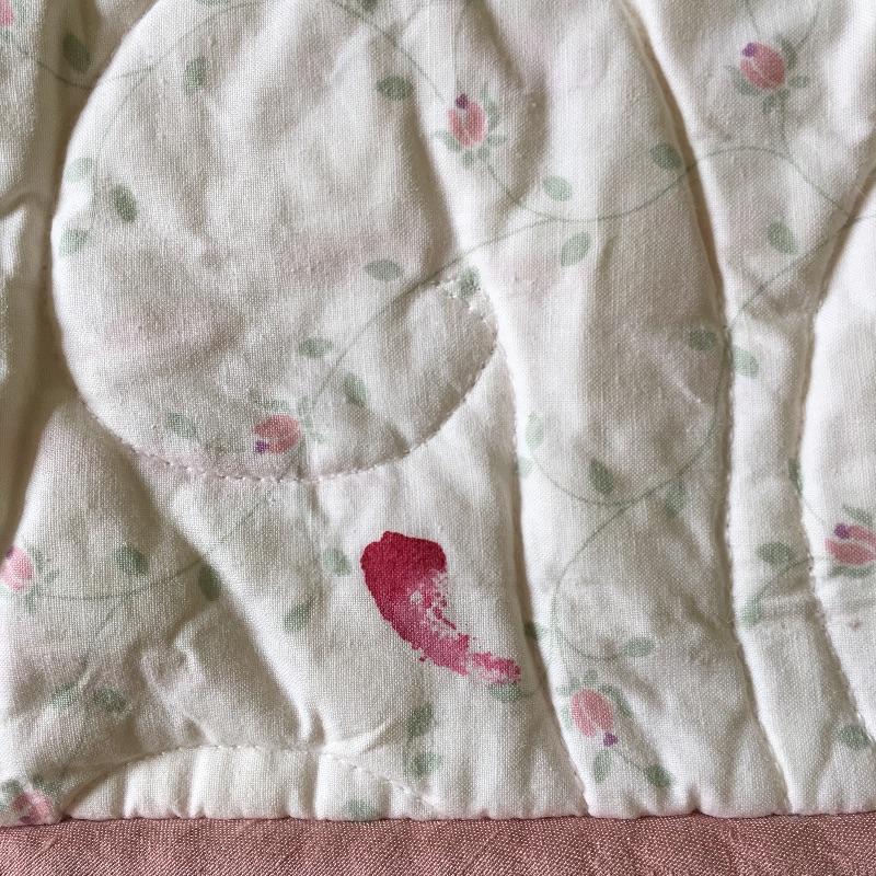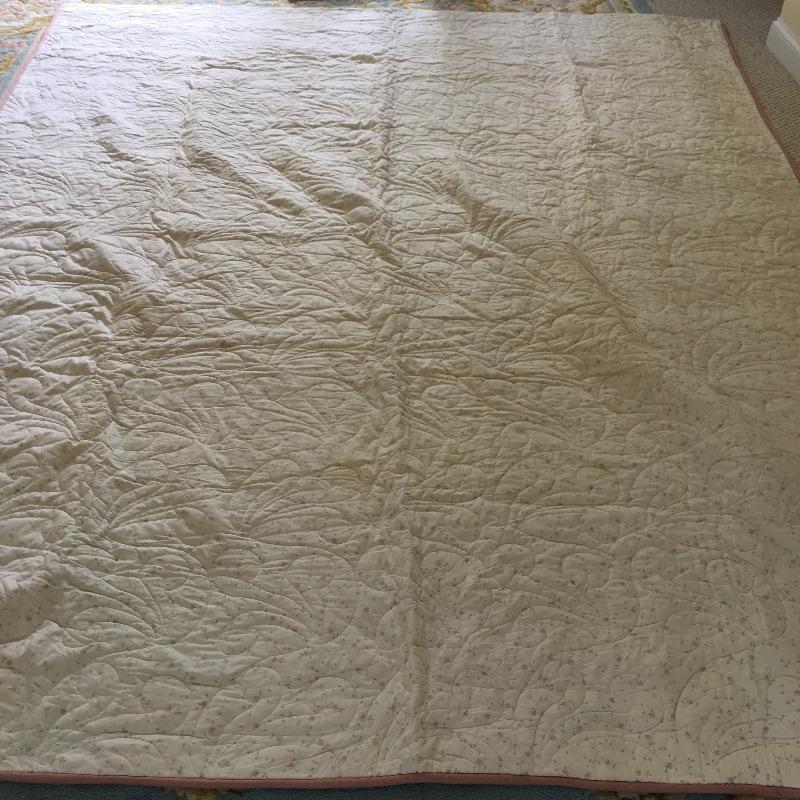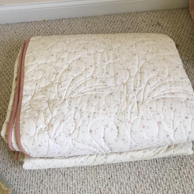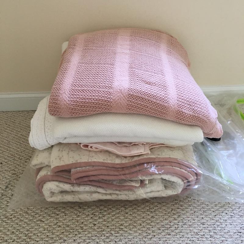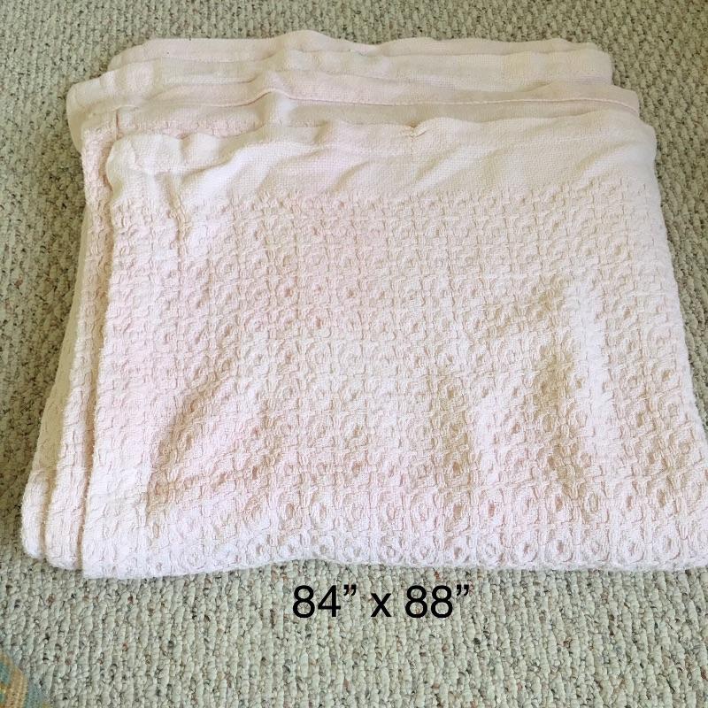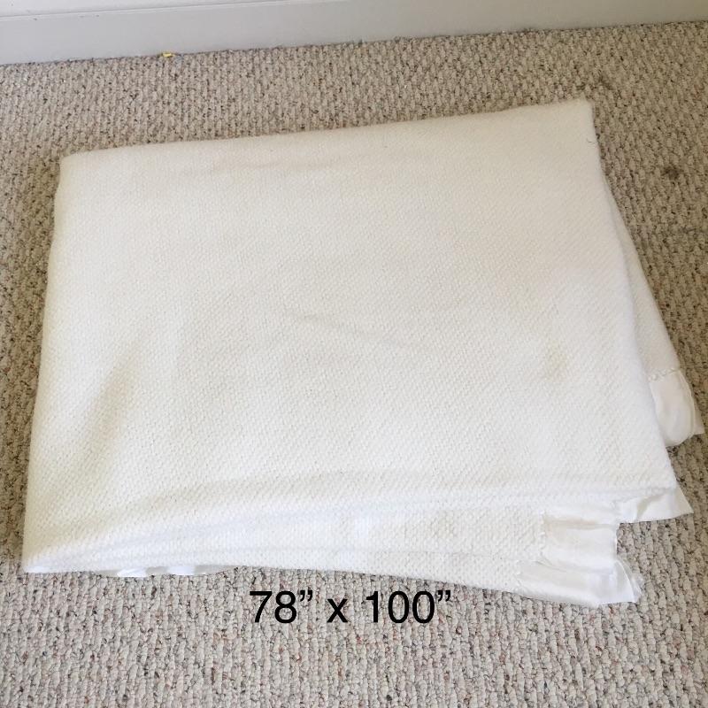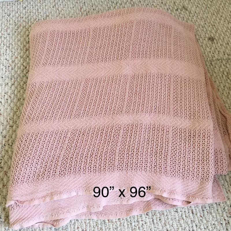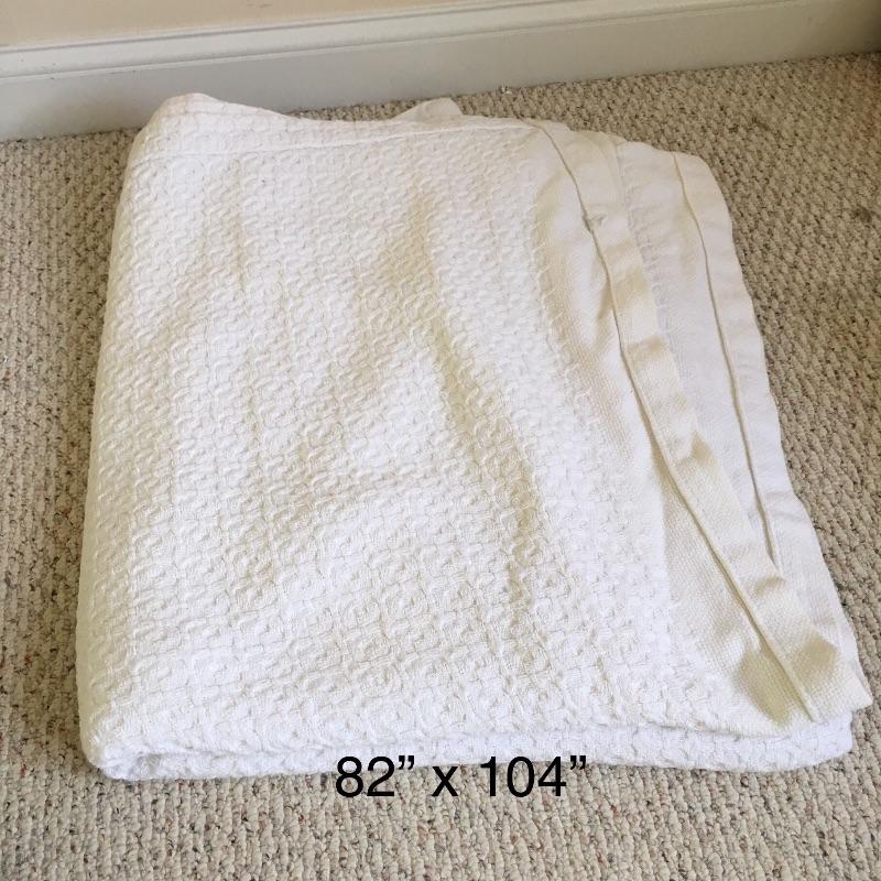 Four blankets and one quilted bedspread. Quilted bedspread measures 102” x 126” and has a mark and a few light stains, see images.
