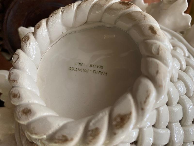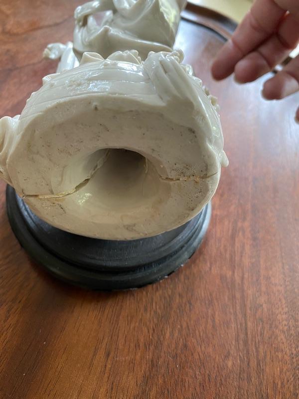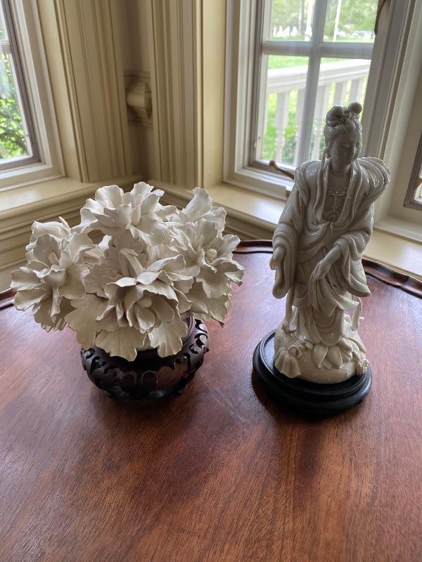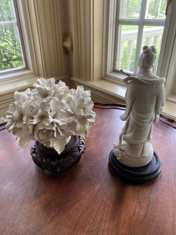 Italian floral ceramic white decorative piece with brakes on the petals measuring approximately 5 inches round then there is a Japanese porcelain figure measuring approximately 9 inches tall