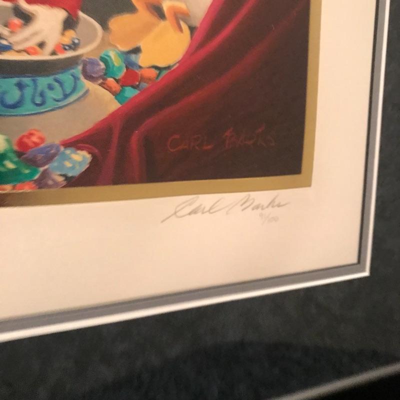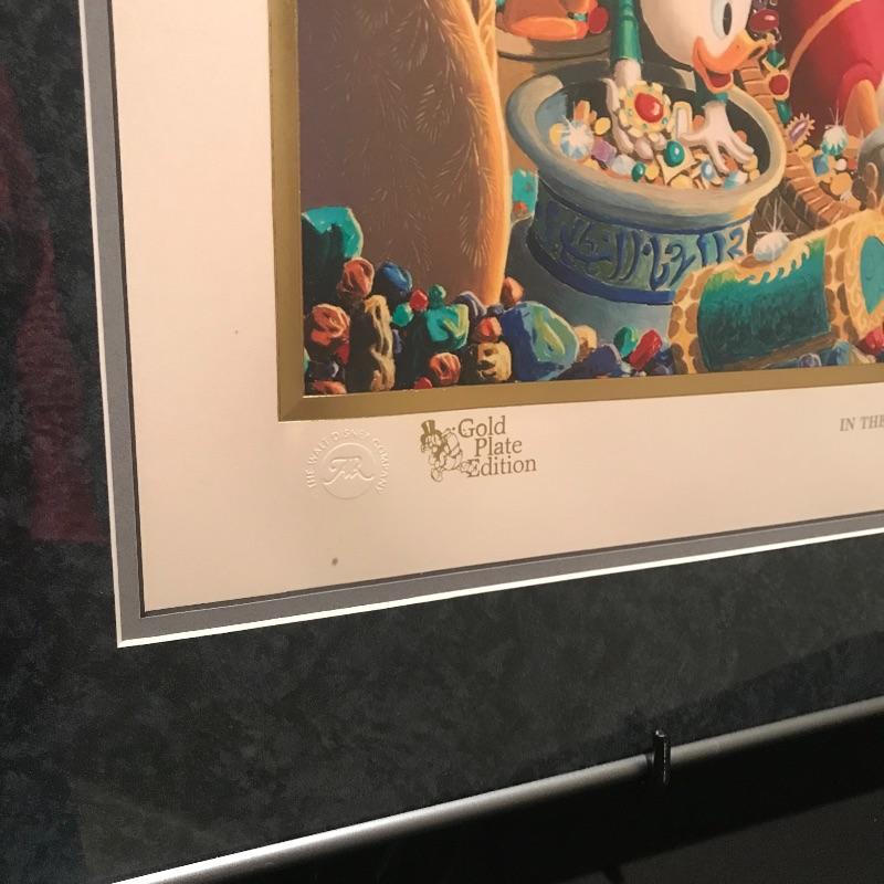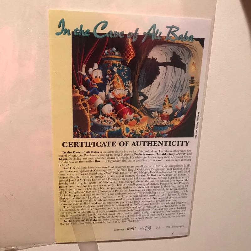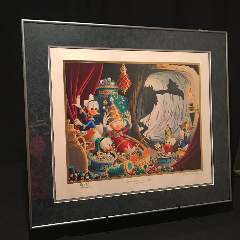Framed and Matted gold plate edition number 91/100 “In the Cave of Ali Baba” Lithograph by Carl Barks measures 30” x 27” with COA. Frame measures 30” x 27” Shipping available. Please call UPS for shipping quote prior to bidding at 828-252-6930