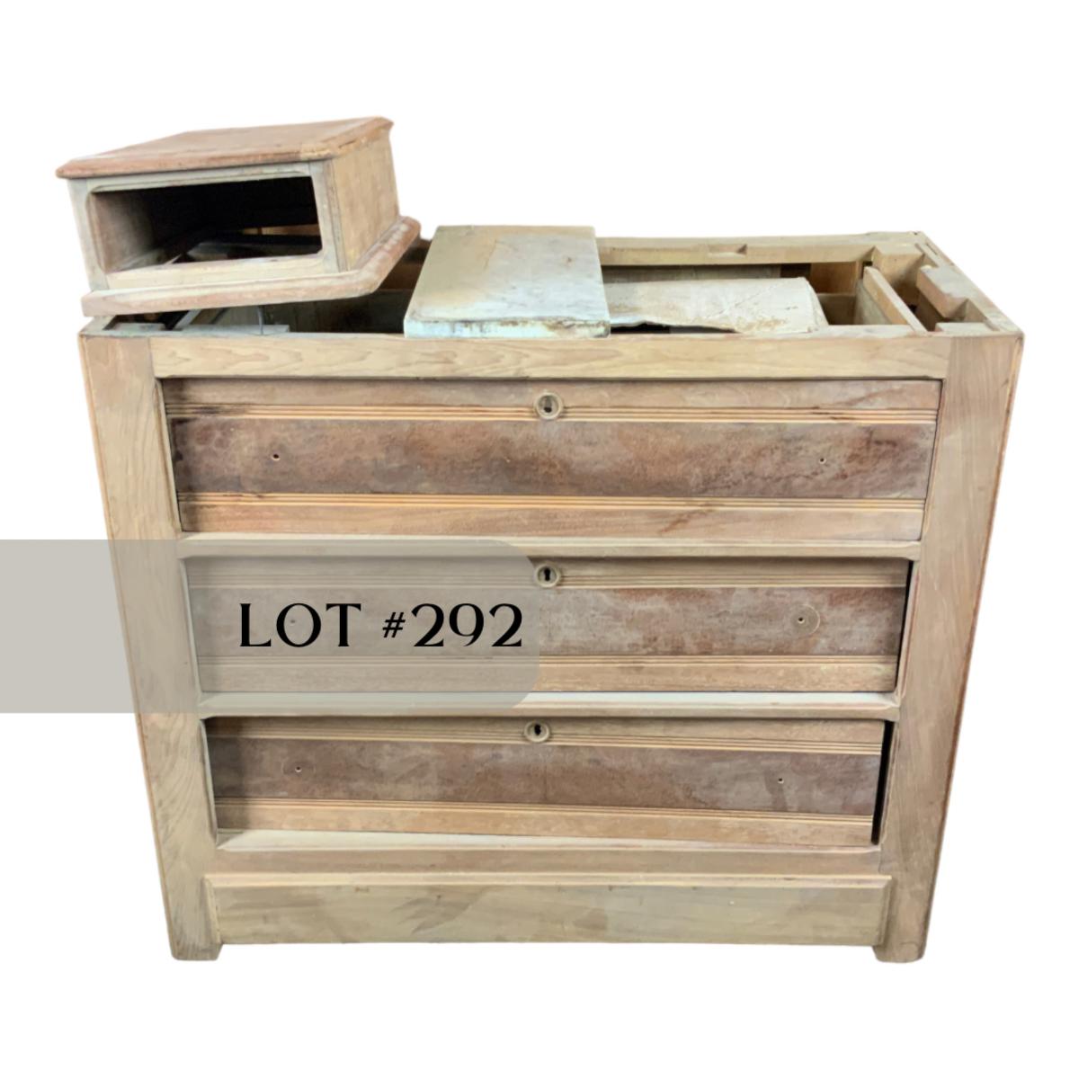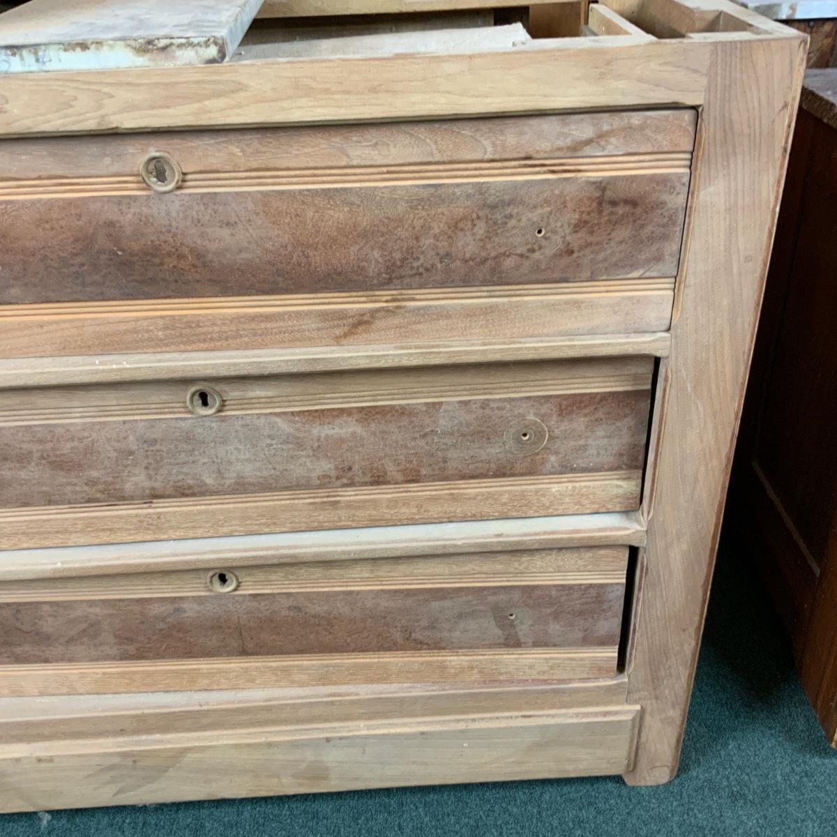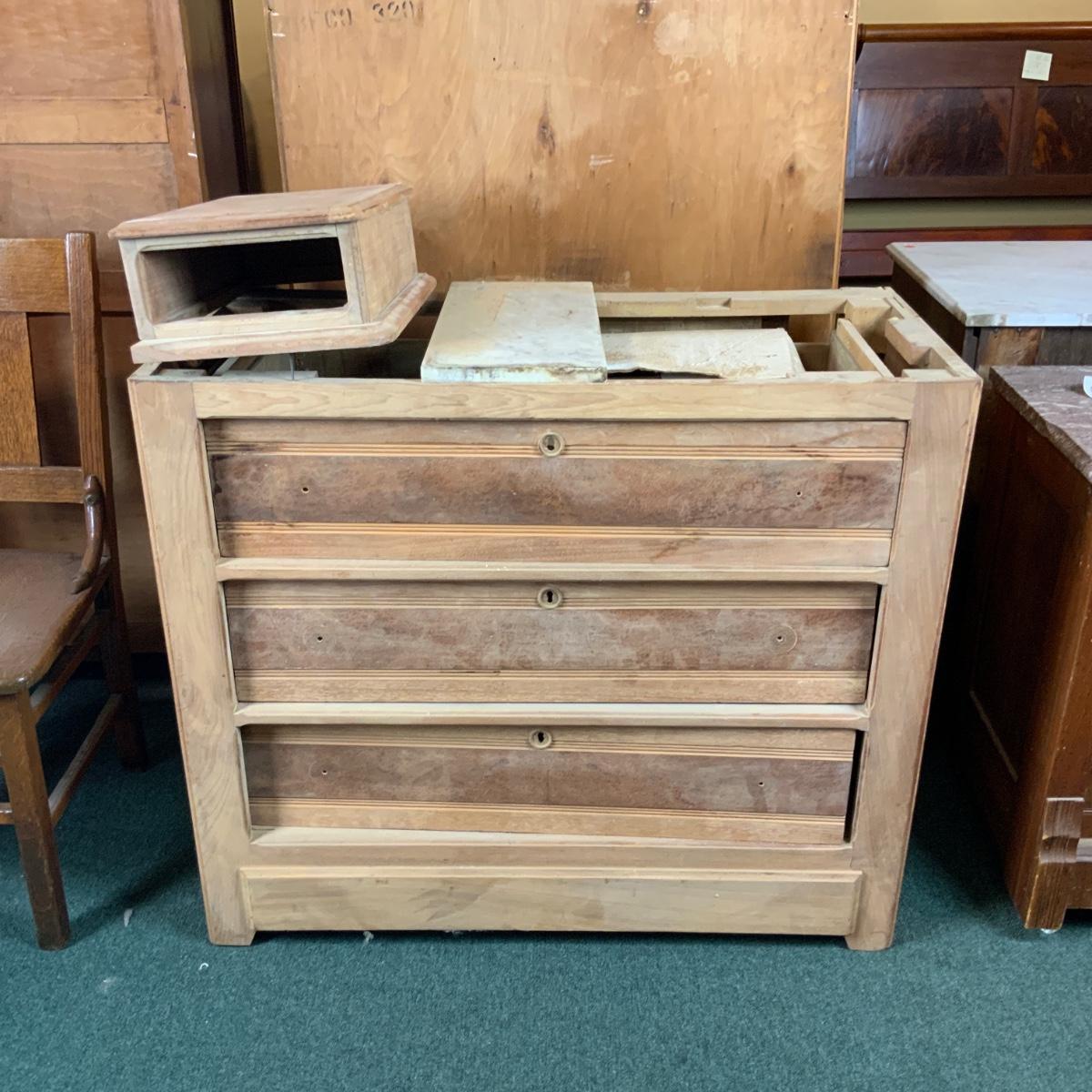 Stripped-Down 3-Drawer Chest. The hard work has been done for you. Additional pieces can be found in the top drawer. You could easily add a top and some stain to this piece and make it functional. //::\\ Please see photos for details and condition. No attempt has been made to hide any imperfections. All items listed in this auction are warehouse items, and need to be cleaned. A majority of the items need restoration as well. All items are sold AS IS and WITHOUT GUARANTEE. If you are uncertain about an item, DO NOT BID. Due to the nature of this online auction in-person inspection is HIGHLY recommended. All Sales are FINAL. Pick Up Times are FIRM. Please confirm with your own schedule that you can pick up in the scheduled times listed in the Terms and Conditions. Any questions please message the auctioneer. DO NOT Contact The Harp Gallery.