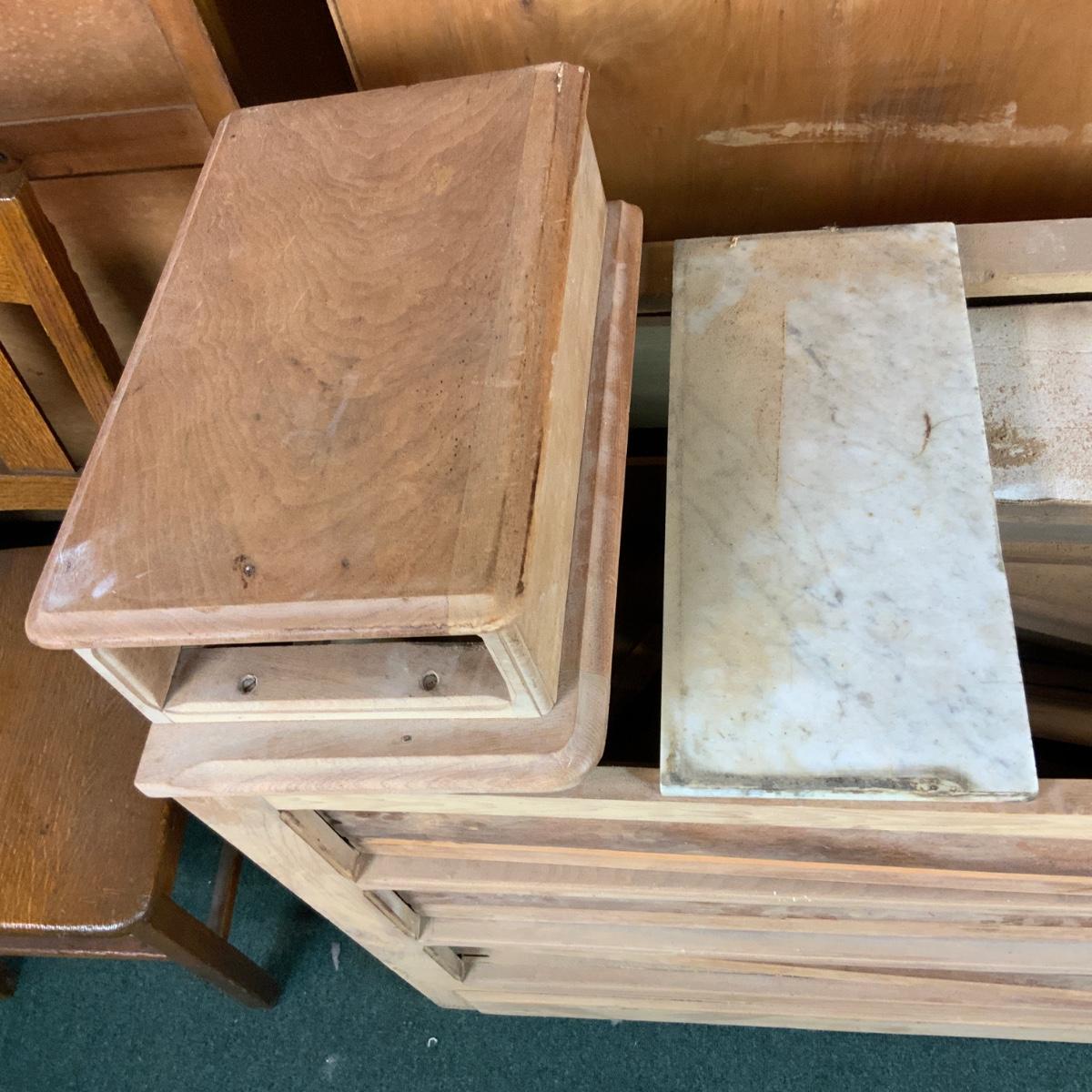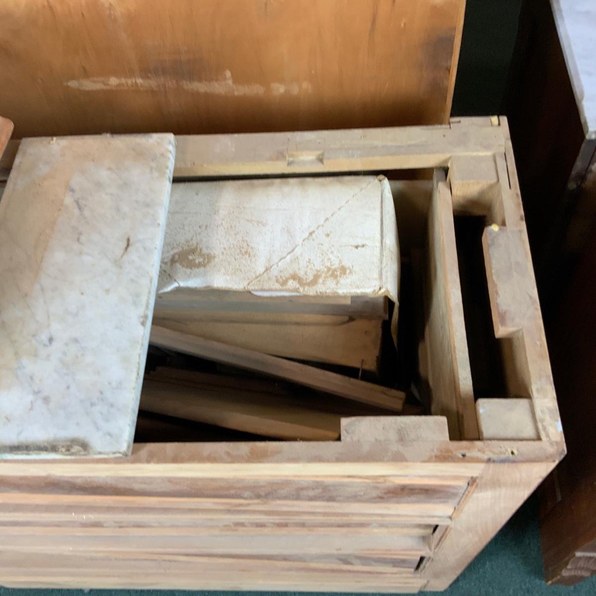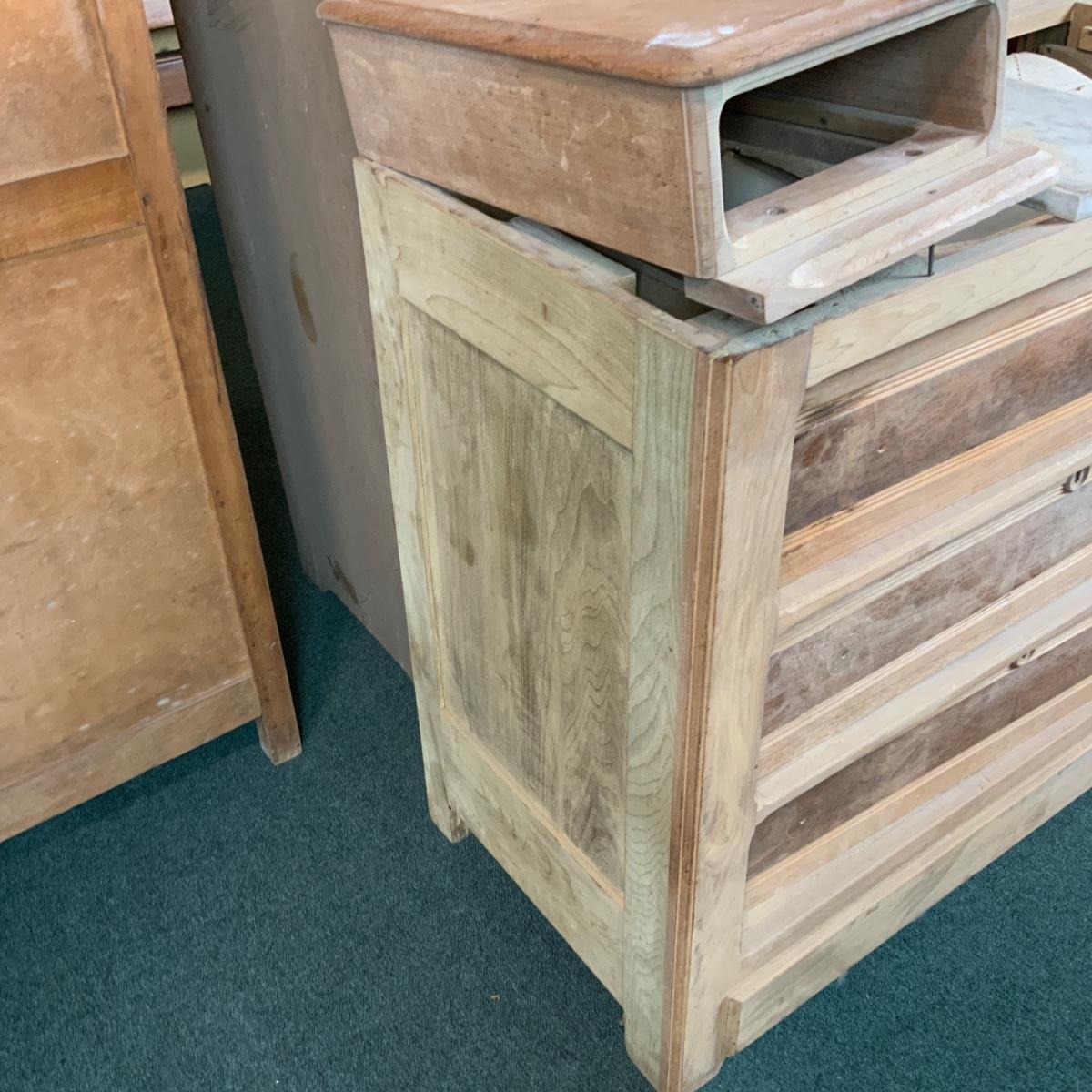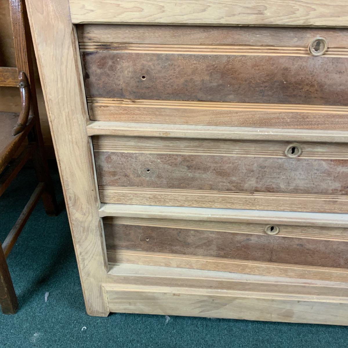 Stripped-Down 3-Drawer Chest. The hard work has been done for you. Additional pieces can be found in the top drawer. You could easily add a top and some stain to this piece and make it functional. //::\\ Please see photos for details and condition. No attempt has been made to hide any imperfections. All items listed in this auction are warehouse items, and need to be cleaned. A majority of the items need restoration as well. All items are sold AS IS and WITHOUT GUARANTEE. If you are uncertain about an item, DO NOT BID. Due to the nature of this online auction in-person inspection is HIGHLY recommended. All Sales are FINAL. Pick Up Times are FIRM. Please confirm with your own schedule that you can pick up in the scheduled times listed in the Terms and Conditions. Any questions please message the auctioneer. DO NOT Contact The Harp Gallery.