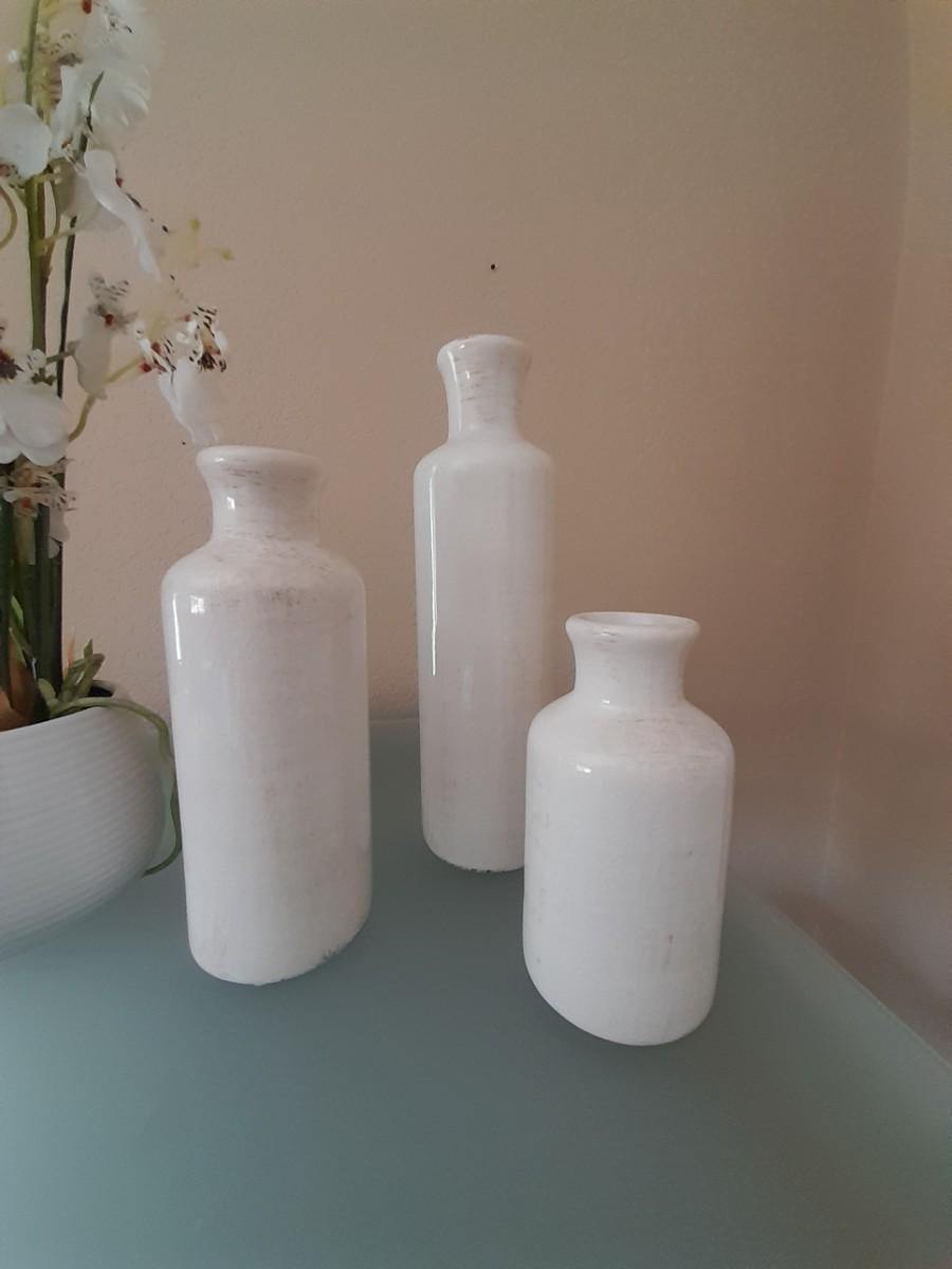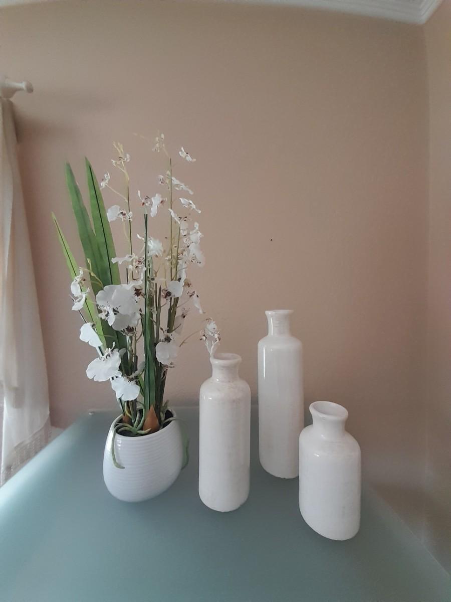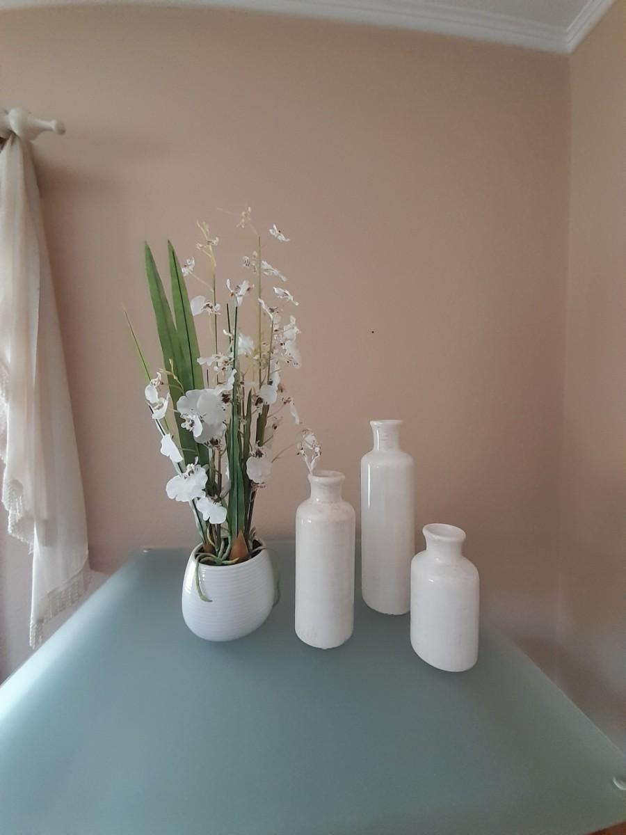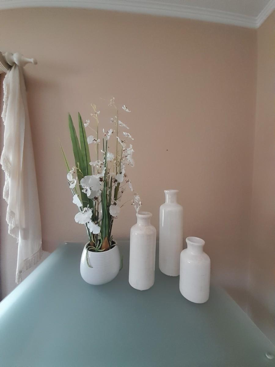 THREE MILK JUG STYLE POTTERY PIECES AND FAUX FLOWERS