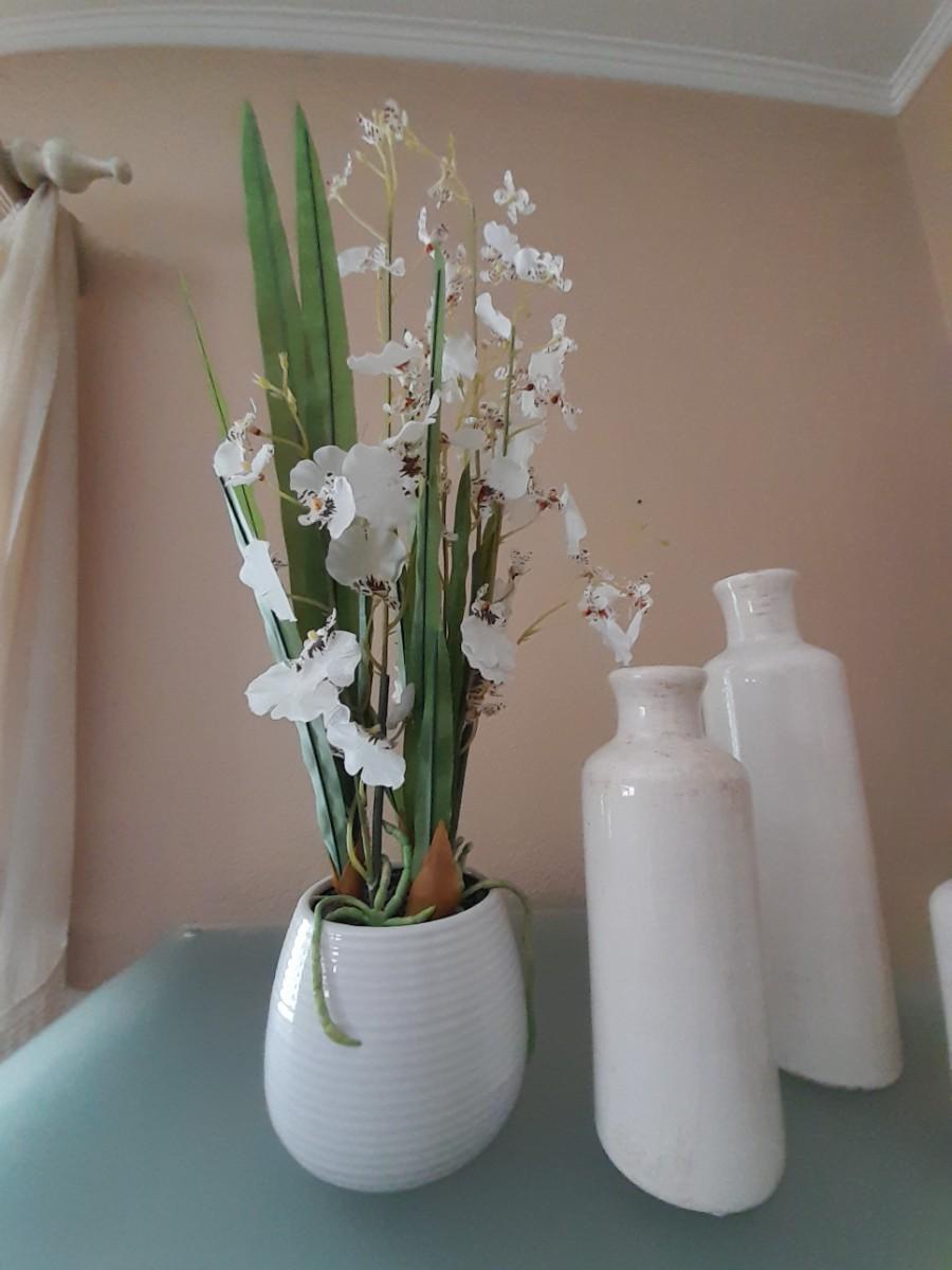 LOT 292 THREE MILK JUG STYLE POTTERY PIECES AND FAUX FLOWERS