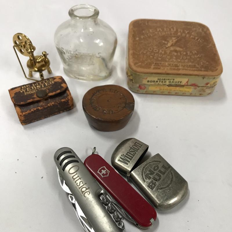 Misc items include pocket knives, Winston match box, Seabury’s box, tiny Webster, Sheaffer’s Skrip Bottle and a couple other items. See photos for details Bottle is 3”h and box is 4”square. Shipping or local pick up in Asheville