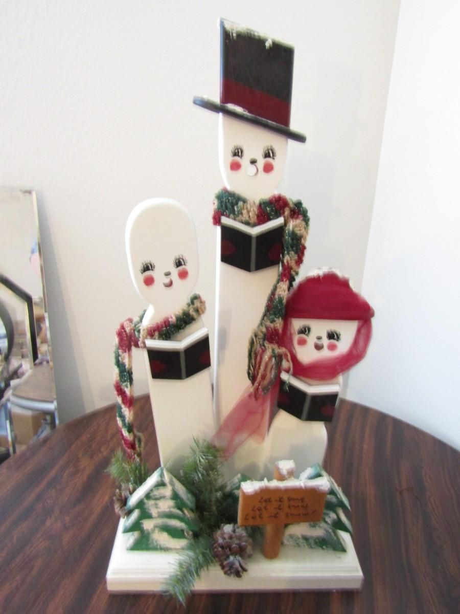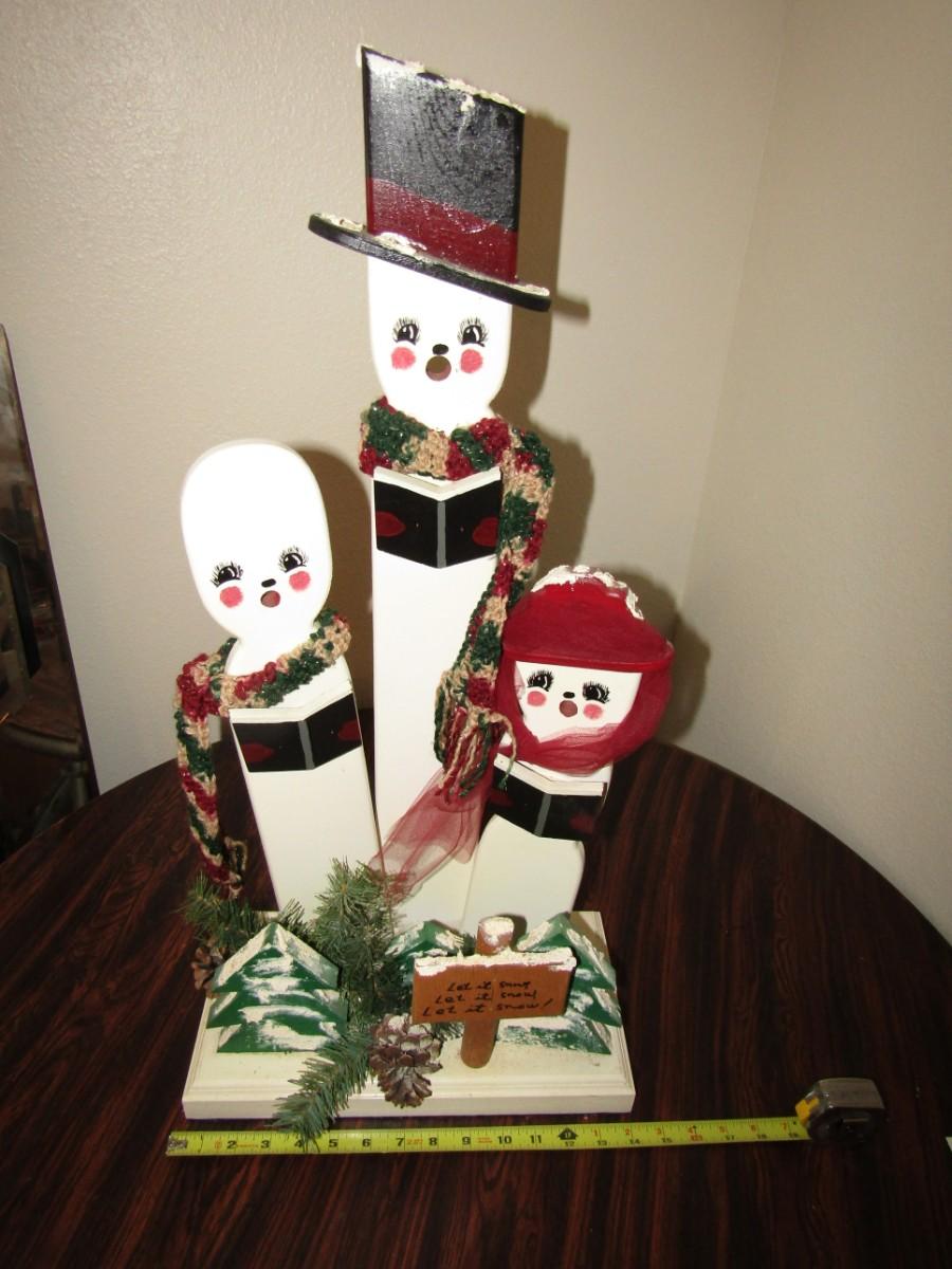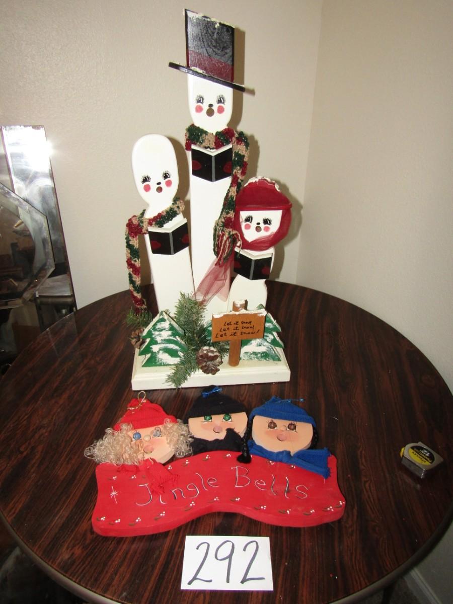 WOODEN CHRISTMAS CAROLERS (THE HAT WAS FOUND FOR THE 3RD CAROLER), STANDS 29" TALL. ALSO A WOOD WALL HANGING.