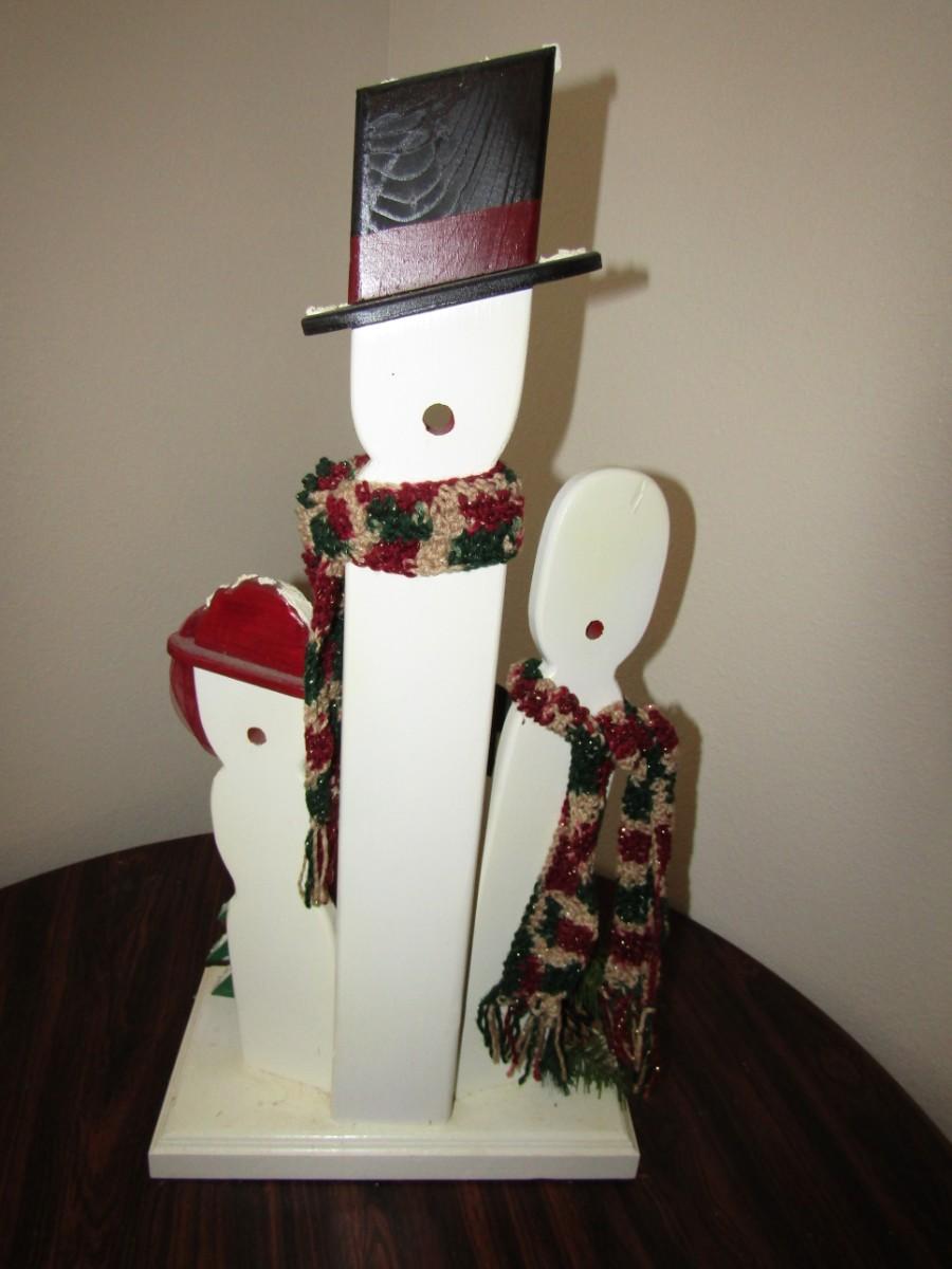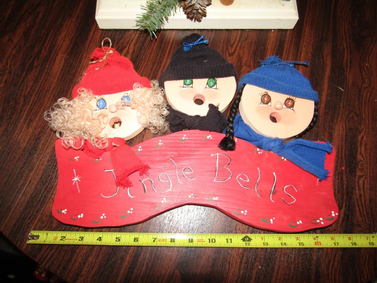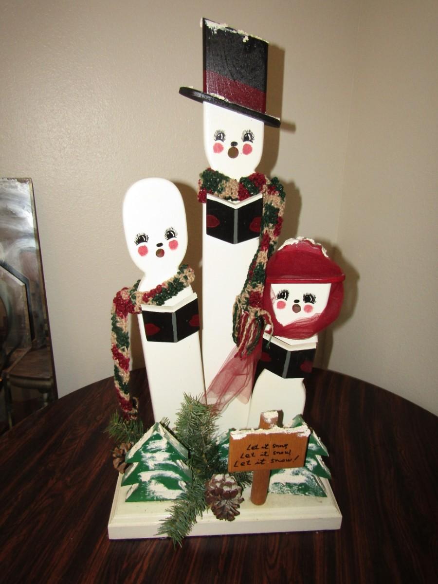 WOODEN CHRISTMAS CAROLERS (THE HAT WAS FOUND FOR THE 3RD CAROLER), STANDS 29" TALL. ALSO A WOOD WALL HANGING.