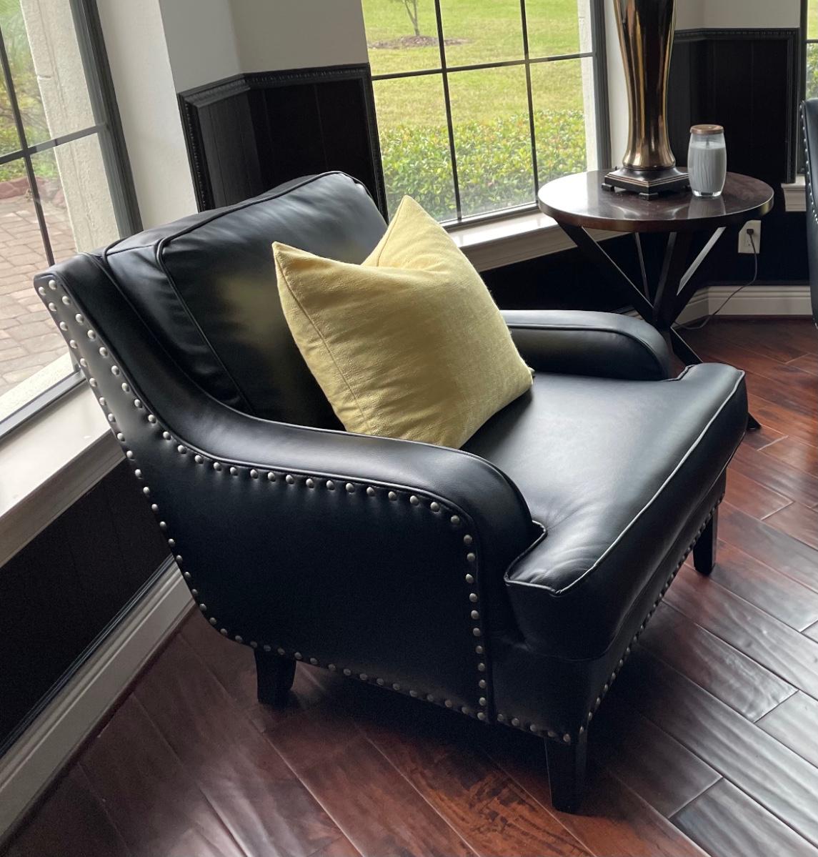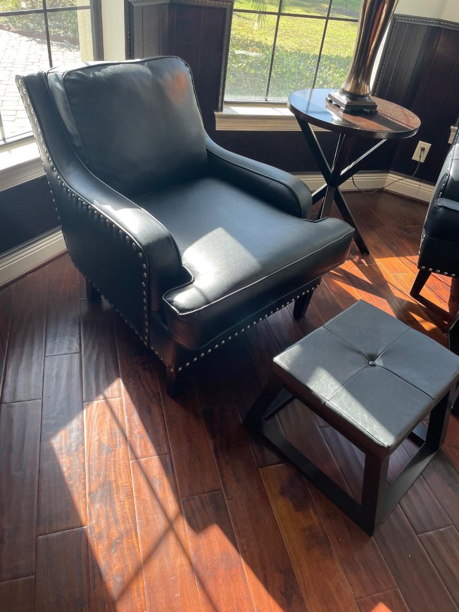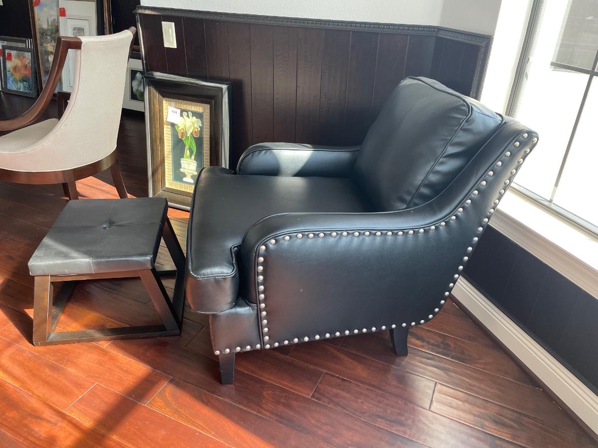 Black faux leather with silver-tone nailhead trim. 32" wide x 38" deep. Like new condition. Can deliver for a fee. Includes wood frame ottoman