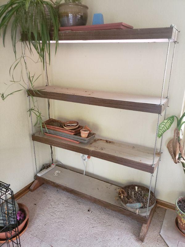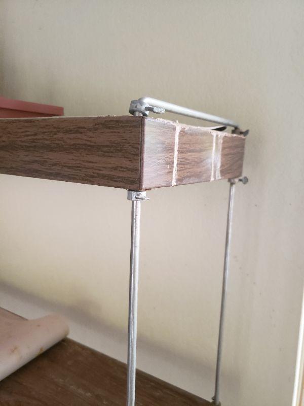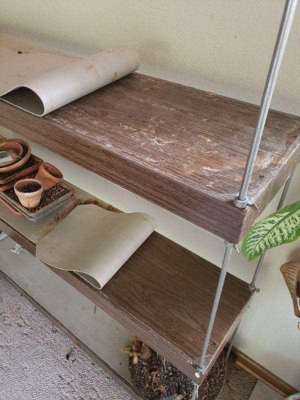 Has been used as a plant stand. Could use a good cleaning. Pads are on the tops of each shelf.