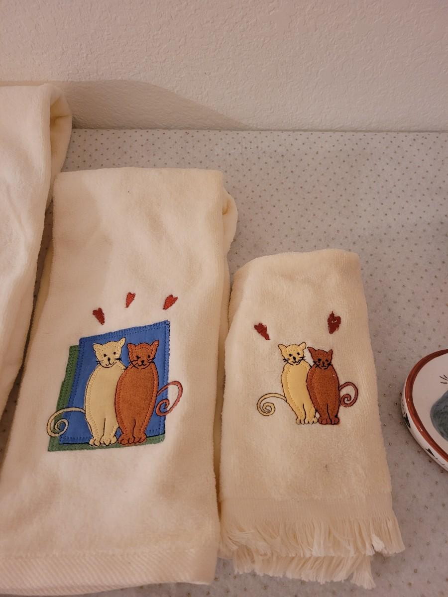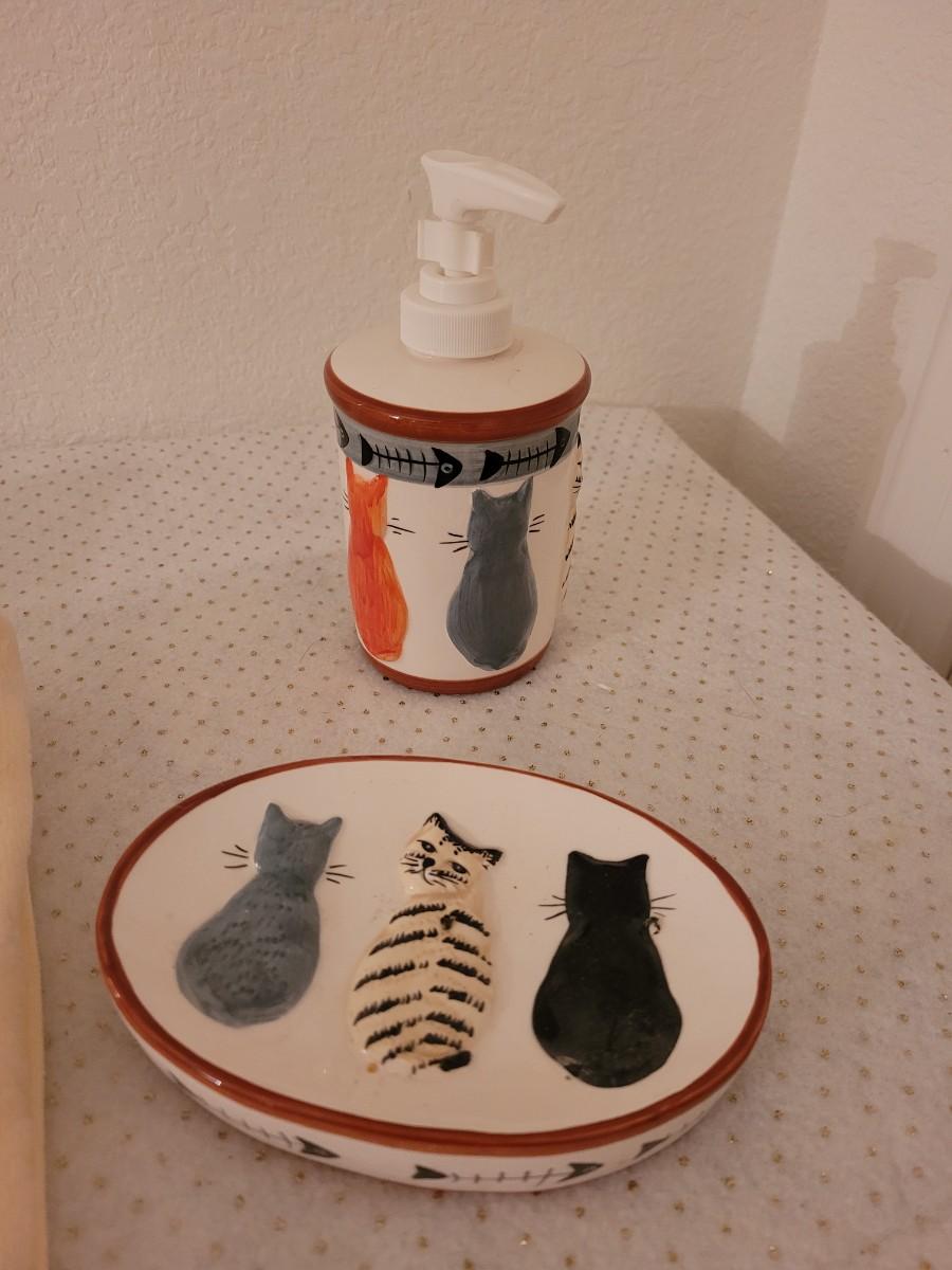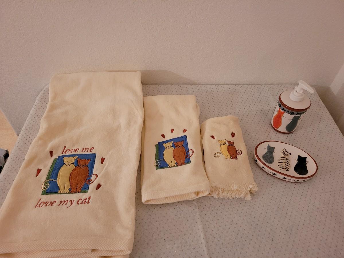 Lot 293: Cat Towel Set, Soap Dish and Soap Pump