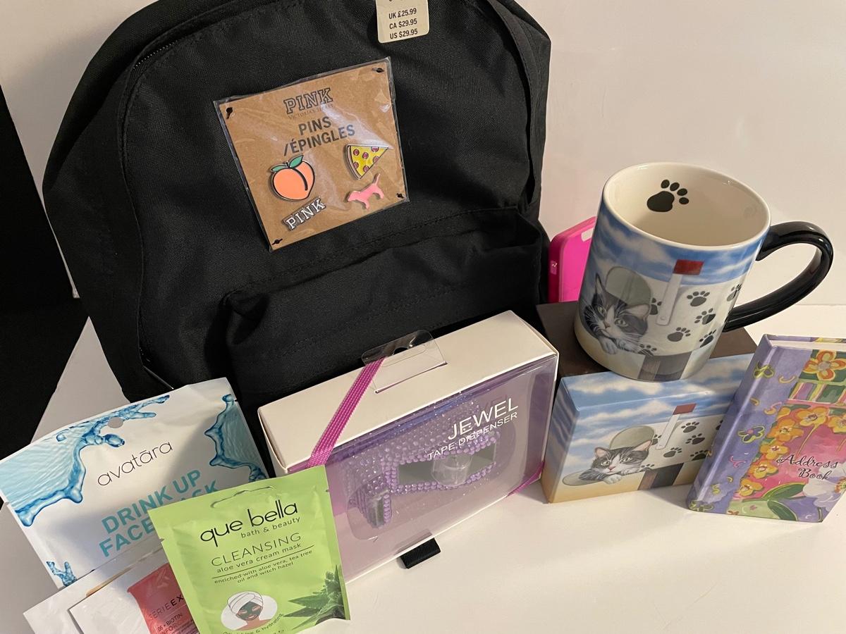 Lot 293  New Pink Backpack, Cat Mug, Face Beauty Masks, Tape Dispenser and Address Book