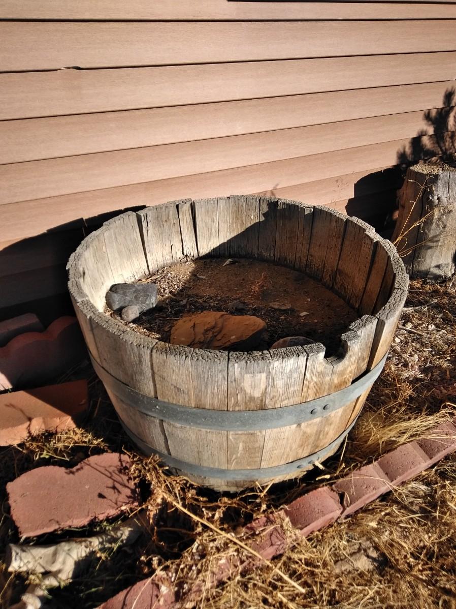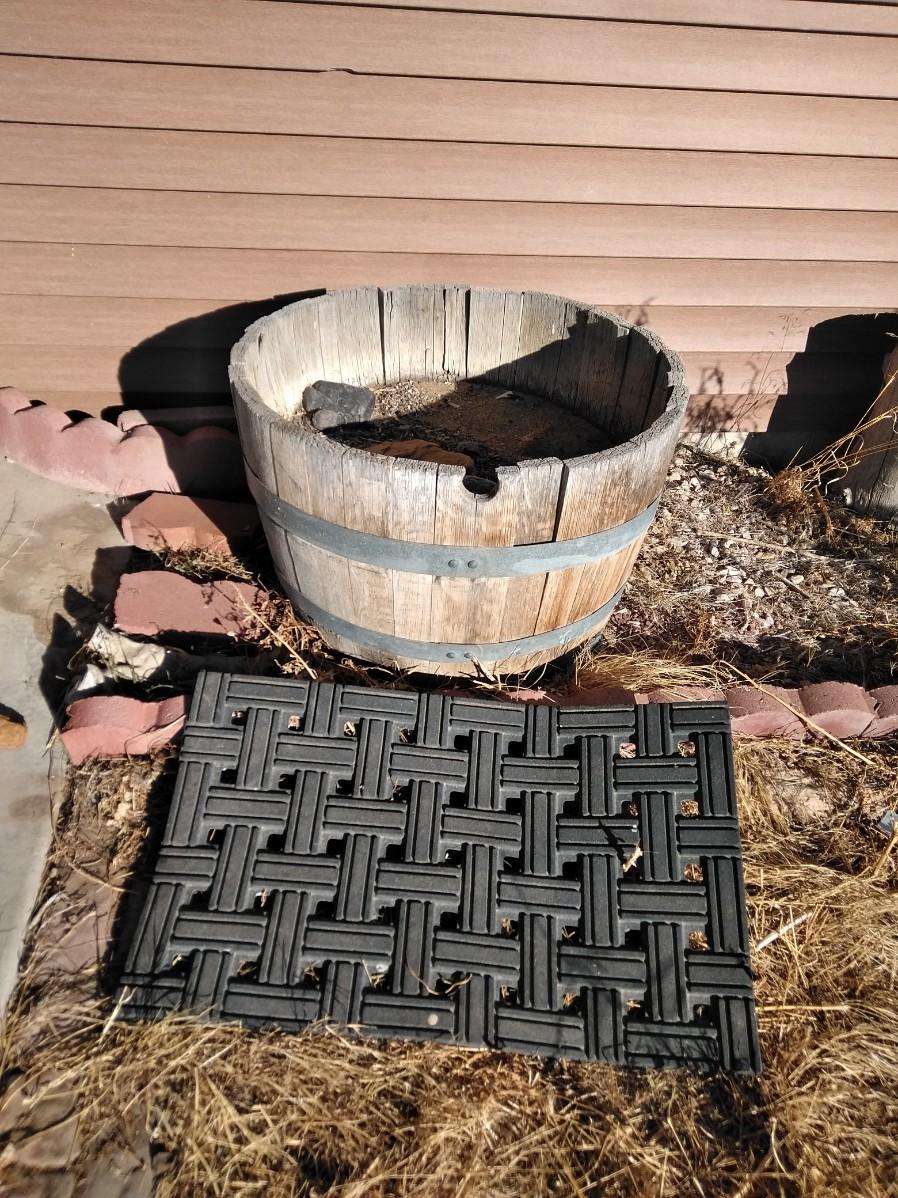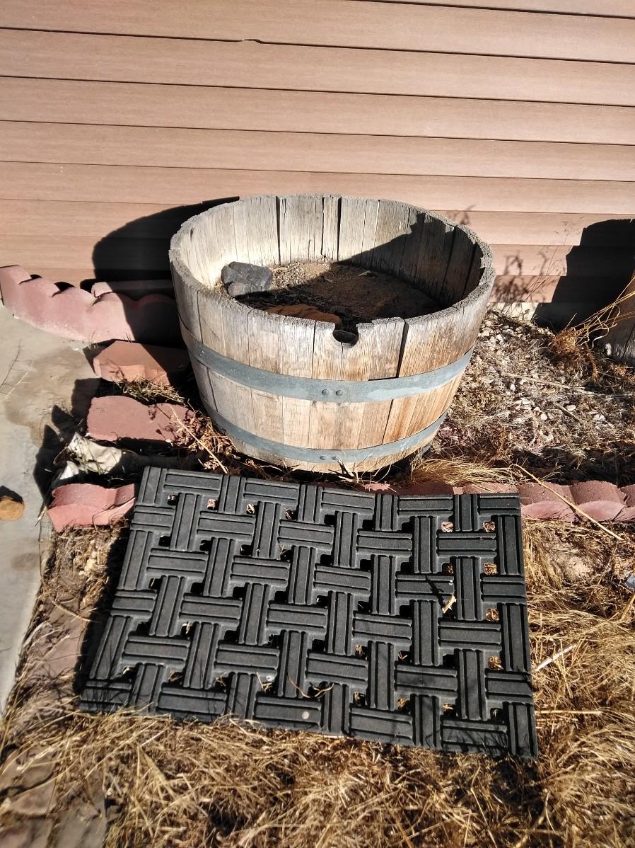 WHISKY BARREL PLANTER AND A NICE RUBBER DOOR MAT