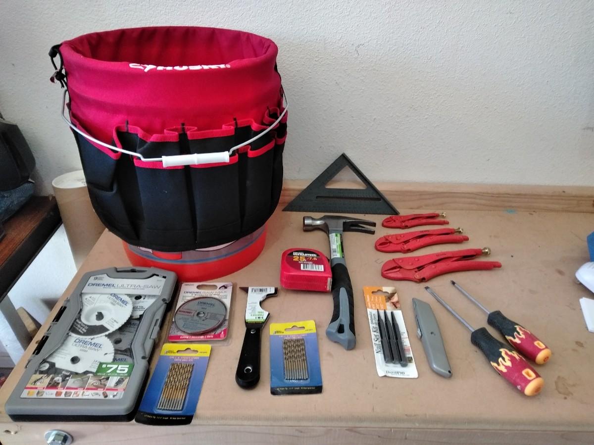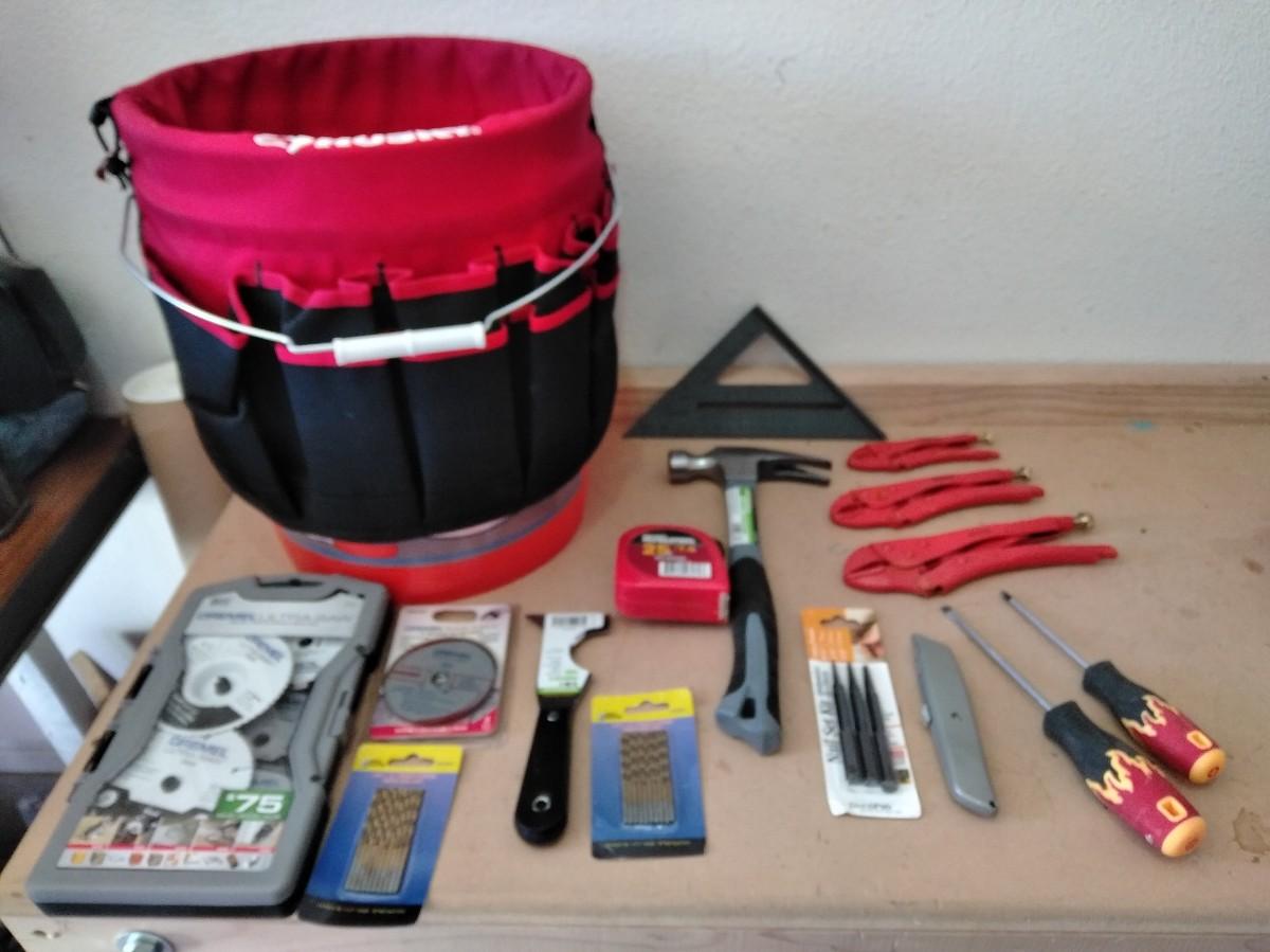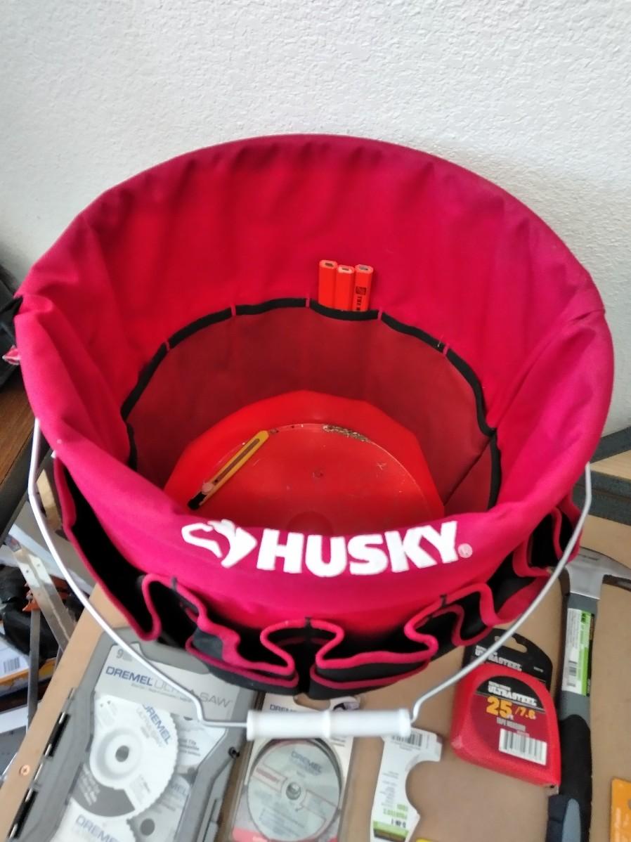 HUSKY BUCKET BAG WITH BUCKET, HAMMER, DREMEL BLADES, PUNCHES, SCREWDRIVERS, DRILL BITS AND MORE
