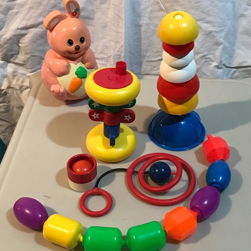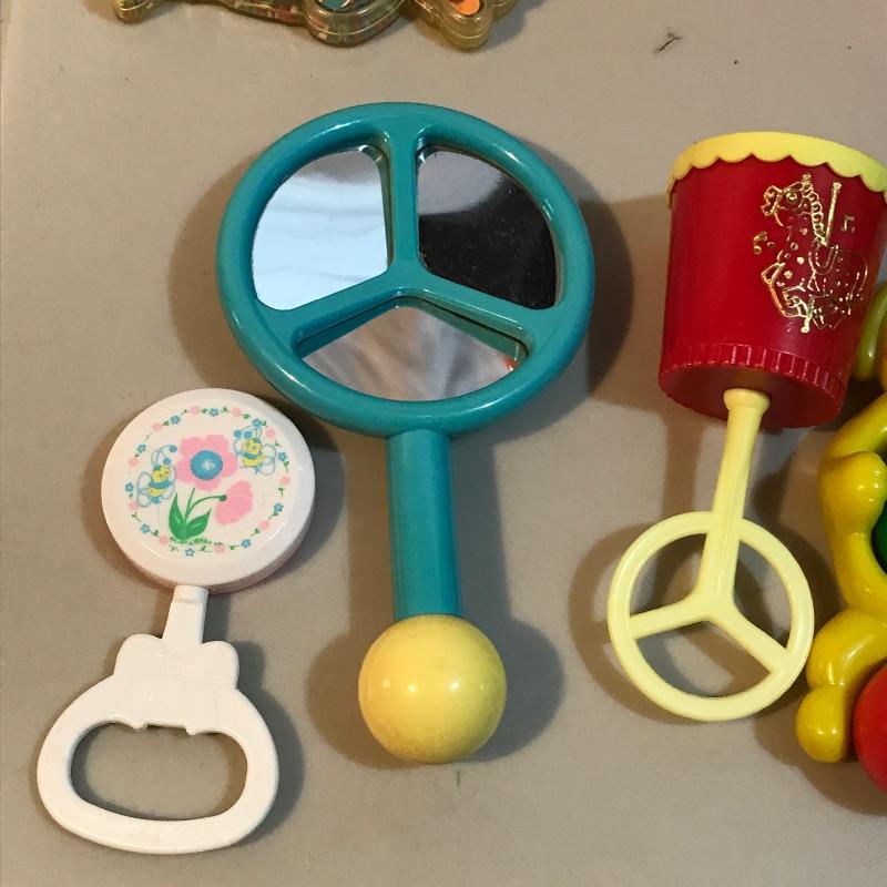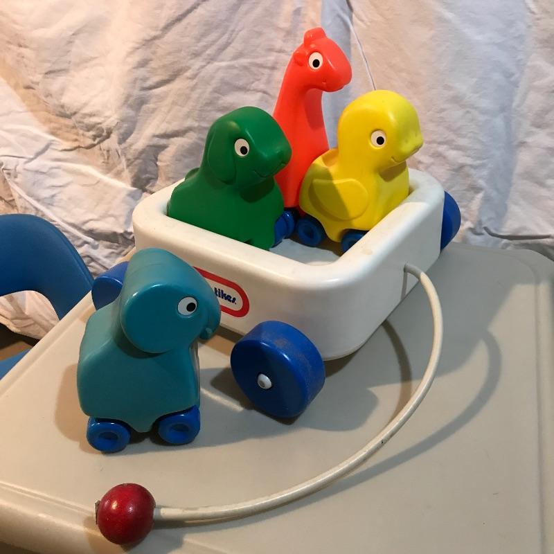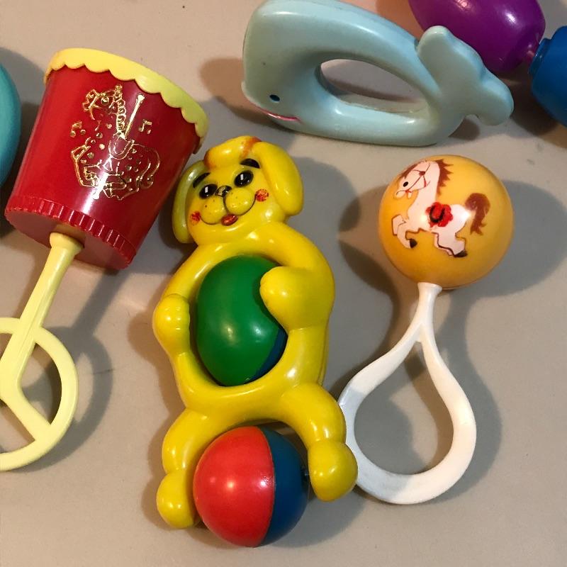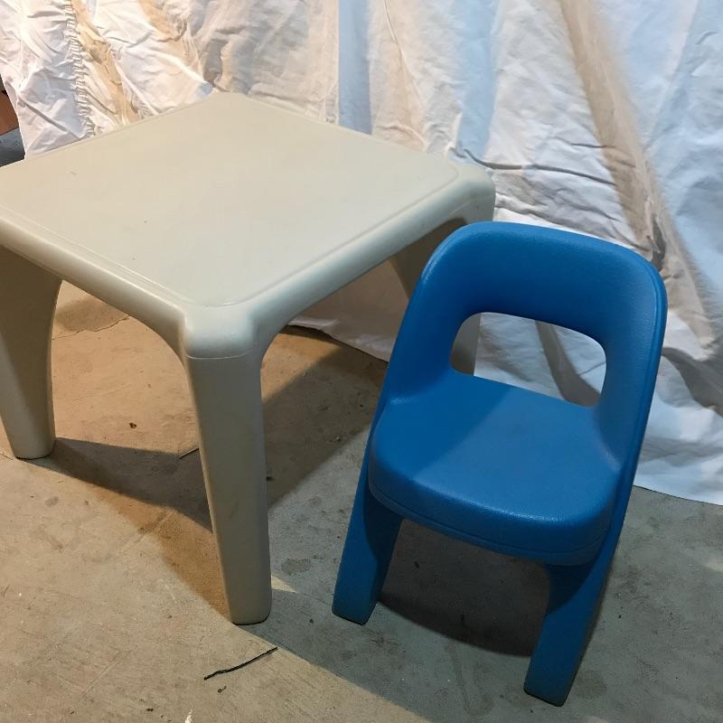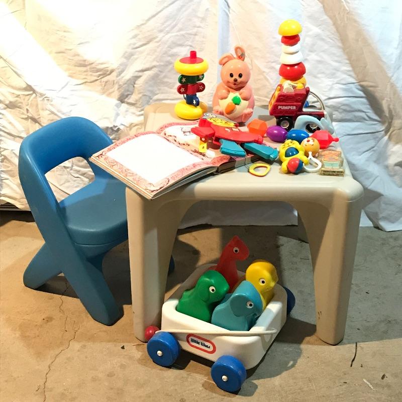 Cute newer and vintage baby toys include a Little Tikes pull toy, some plastic rattles and stacking or wobble toys. Lot also includes a Shirley Temple Storybook and a kid size table (24” square and 19.5” high) with one chair. No shipping.