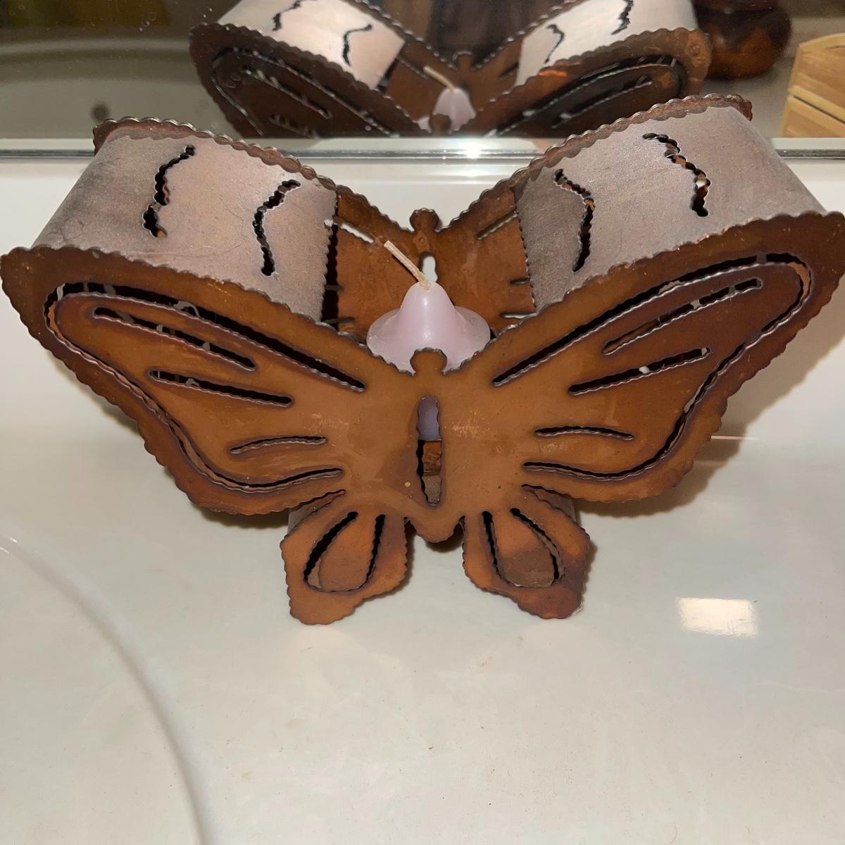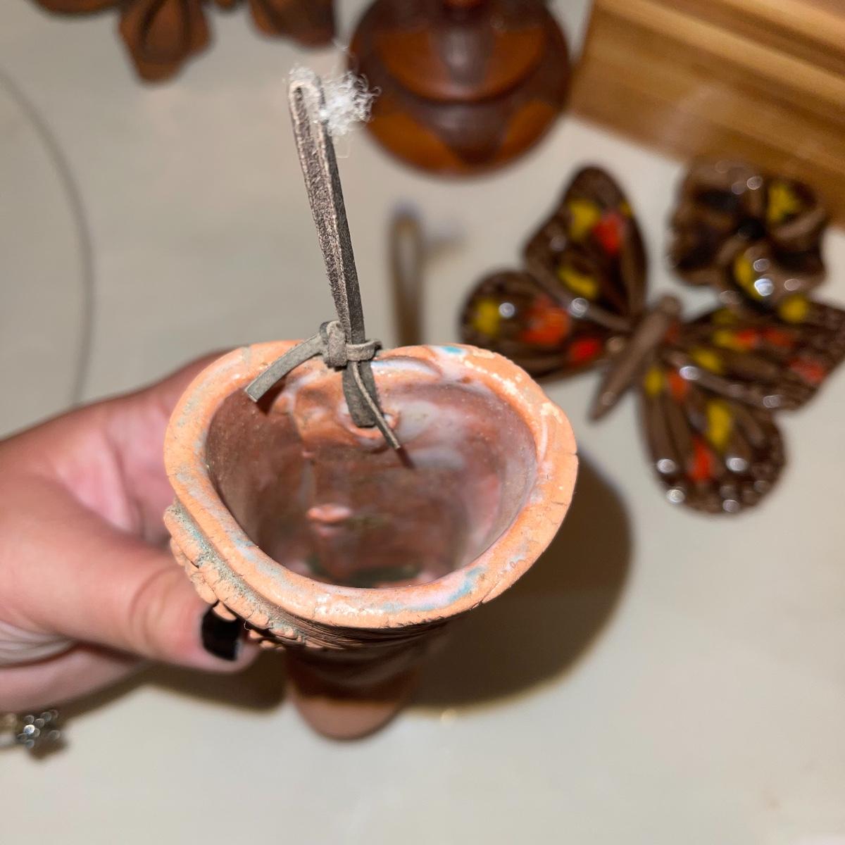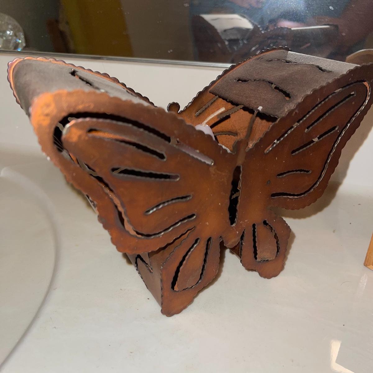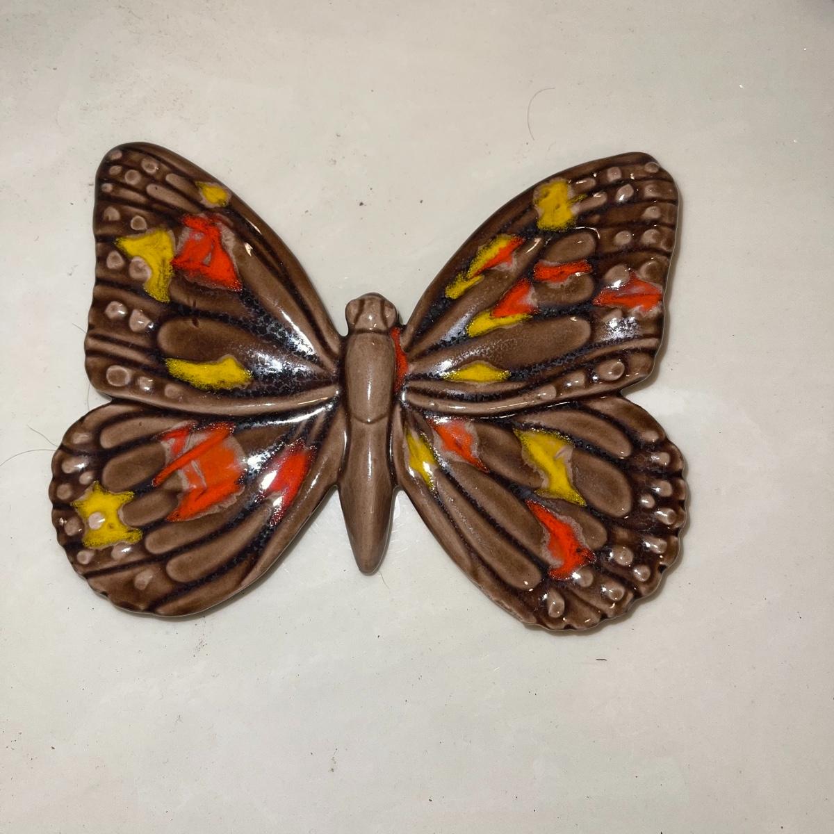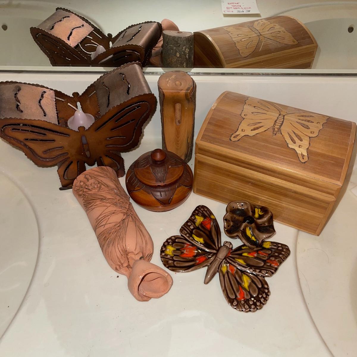 A metal bronze-colored butterfly candle holder, a wooden box with an incised butterfly, a piece of wood pencil holder, a small ceramic flower, a ceramic butterfly, a small wooden lidded jar, and a ceramic hanging vase make up this cute lot. All are a range of brown colored wood/glaze/clay/metal. The hanging clay vase is glazed on the interior to allow for water. Both glazed ceramic items, the butterfly and flower, appear to have been hand glazed.