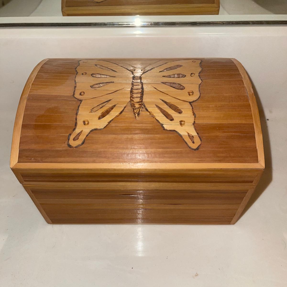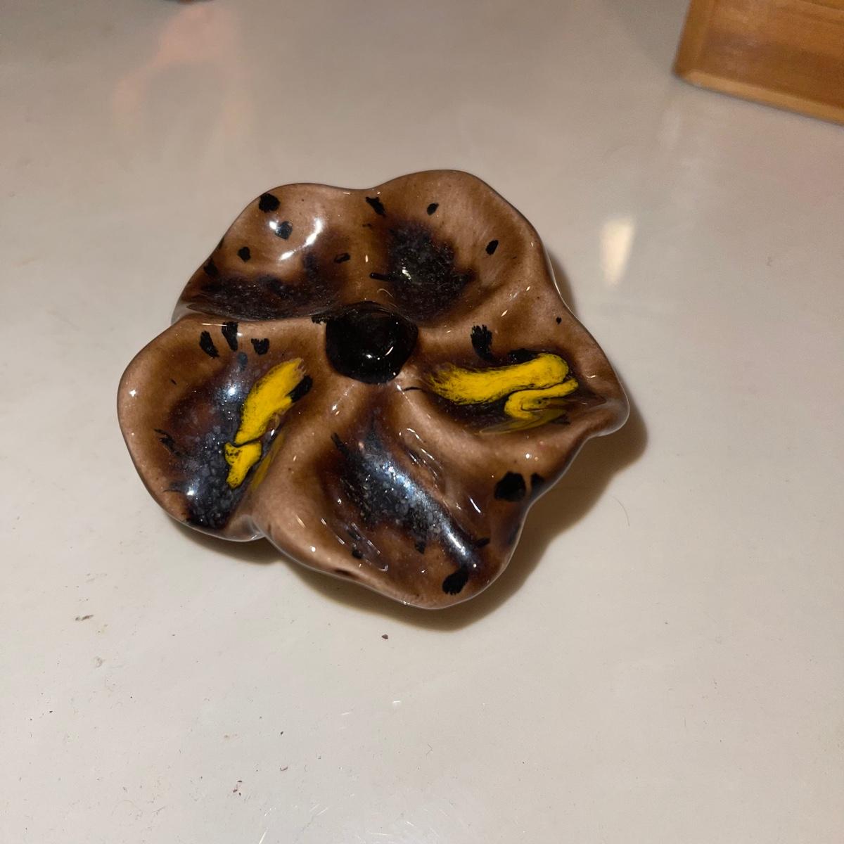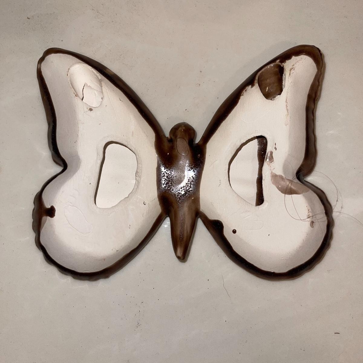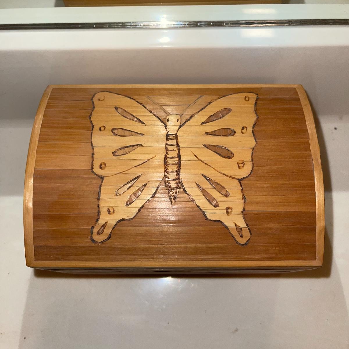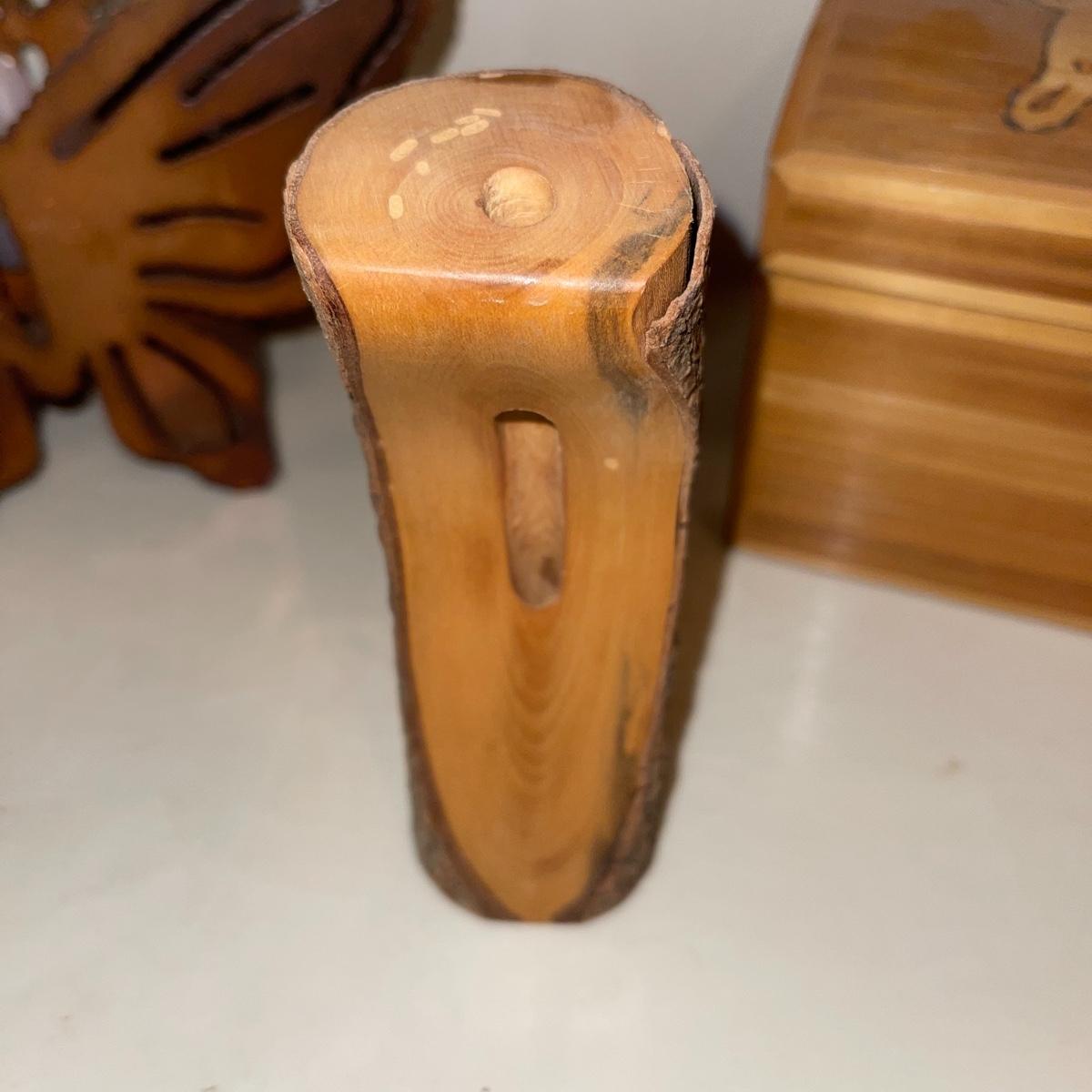 A metal bronze-colored butterfly candle holder, a wooden box with an incised butterfly, a piece of wood pencil holder, a small ceramic flower, a ceramic butterfly, a small wooden lidded jar, and a ceramic hanging vase make up this cute lot. All are a range of brown colored wood/glaze/clay/metal. The hanging clay vase is glazed on the interior to allow for water. Both glazed ceramic items, the butterfly and flower, appear to have been hand glazed.