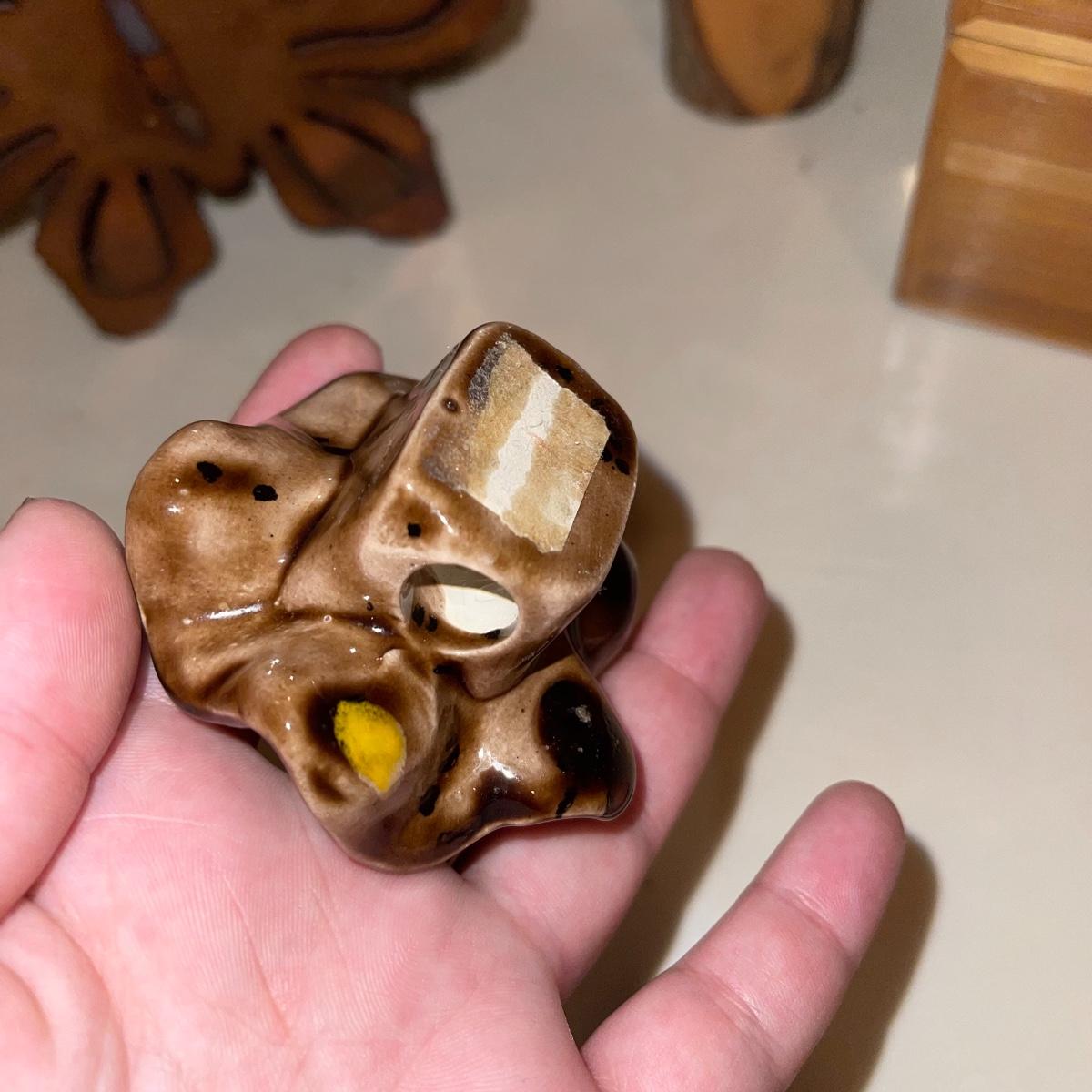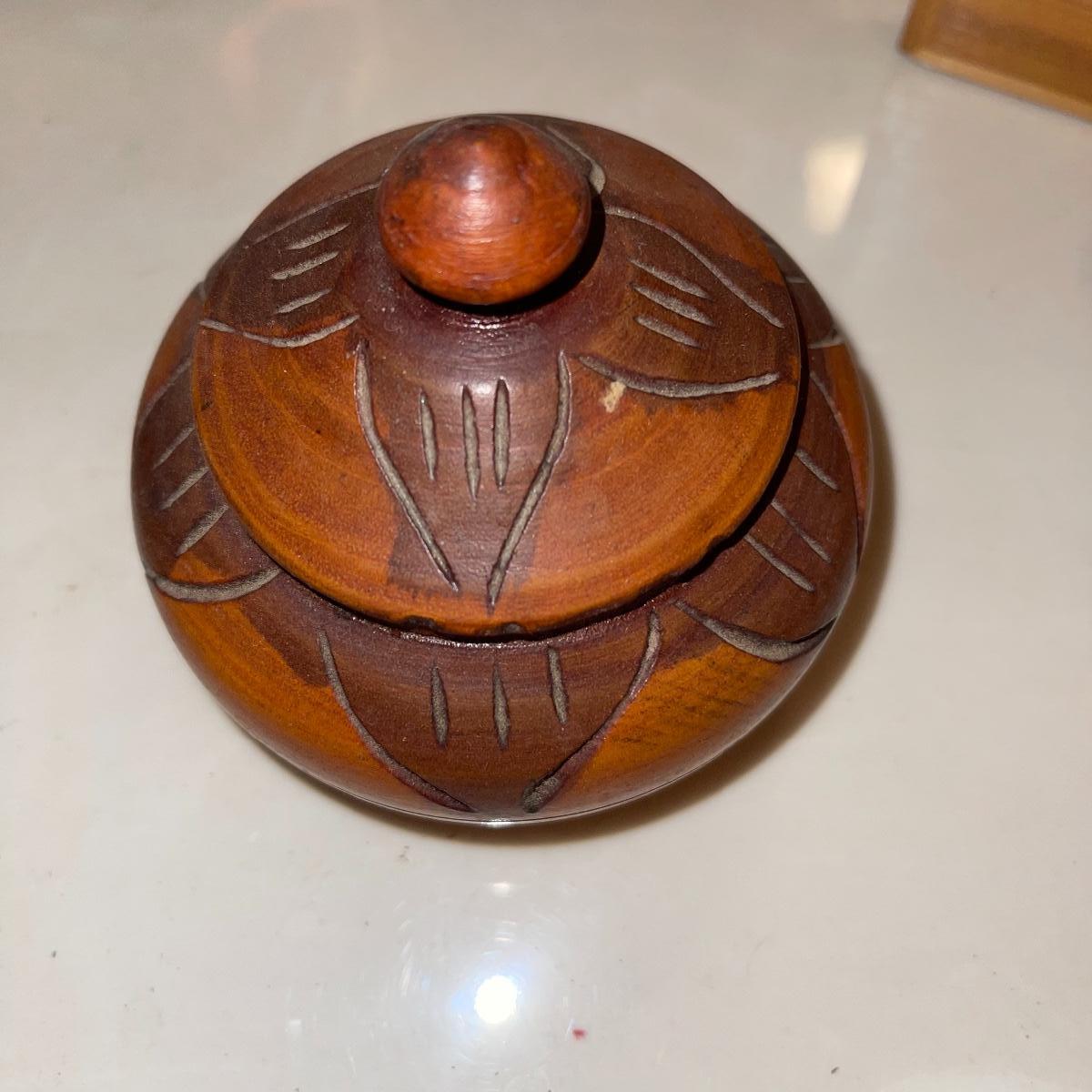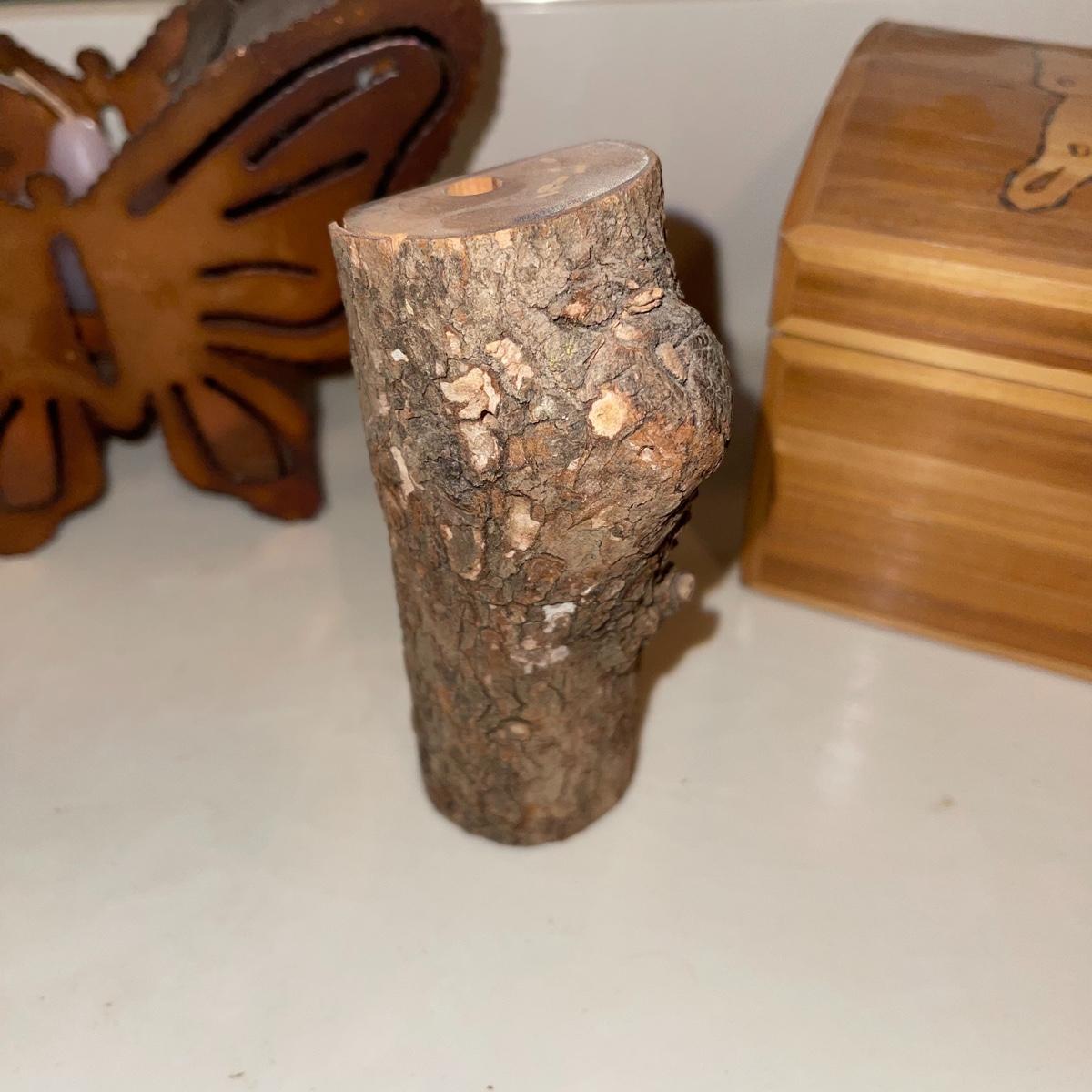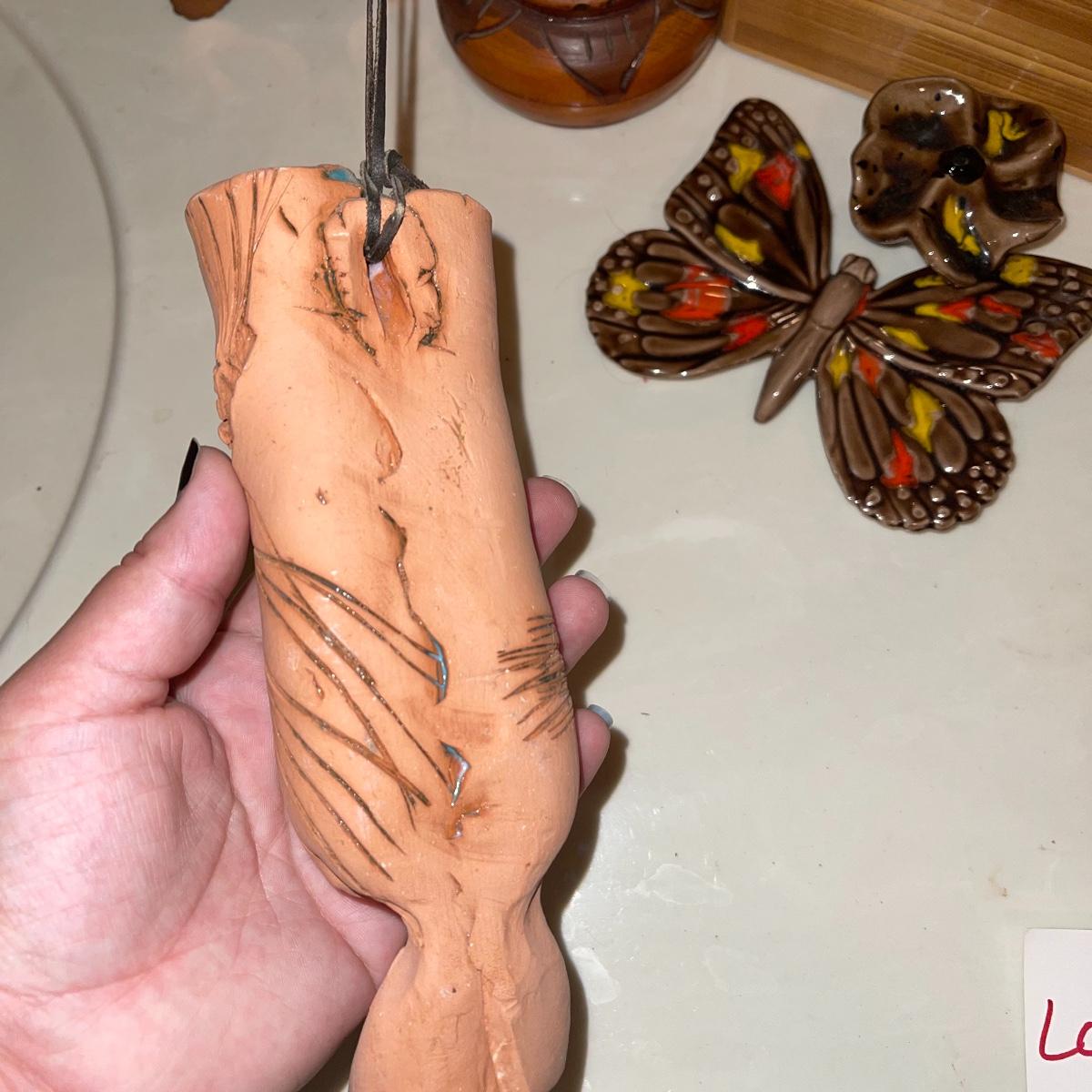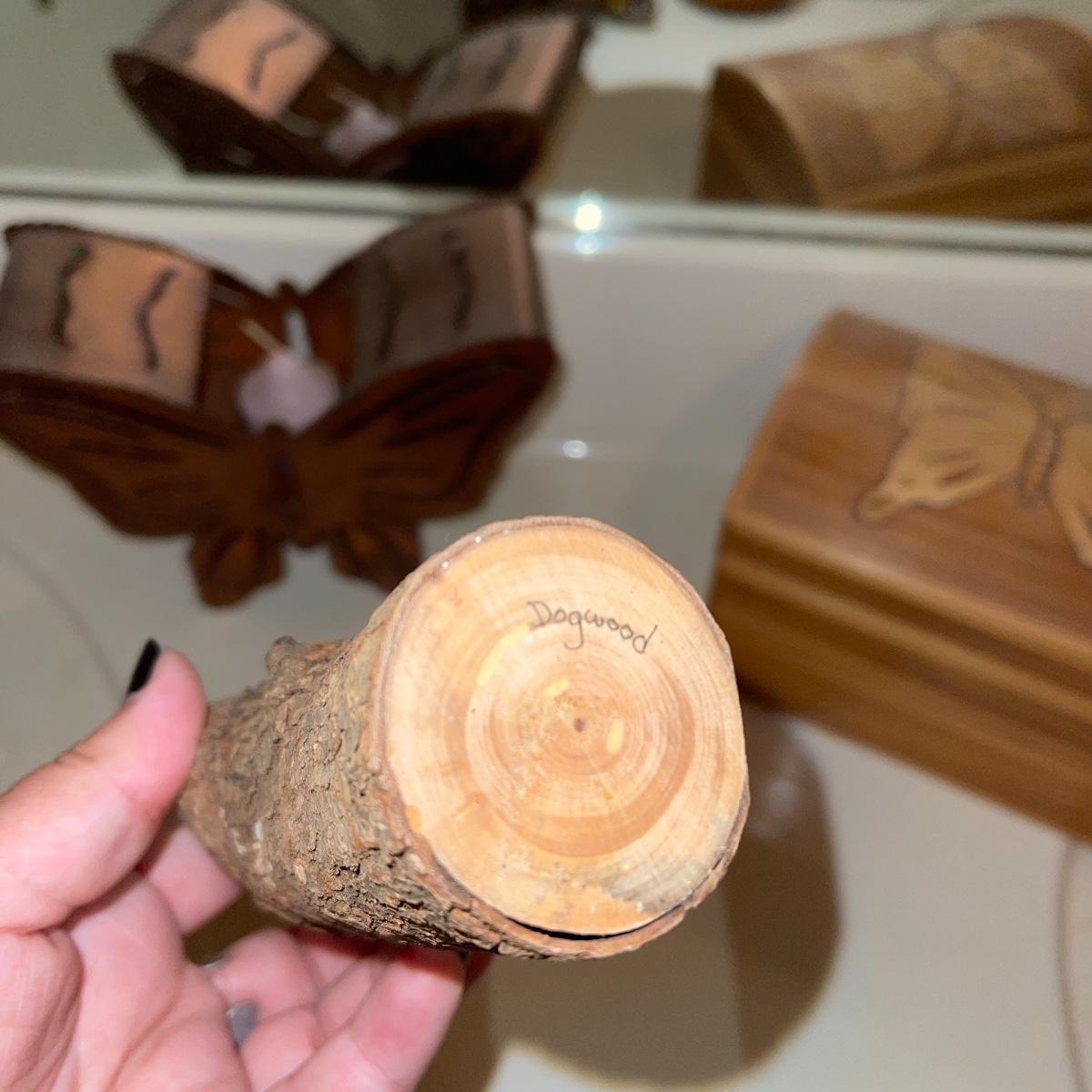 A metal bronze-colored butterfly candle holder, a wooden box with an incised butterfly, a piece of wood pencil holder, a small ceramic flower, a ceramic butterfly, a small wooden lidded jar, and a ceramic hanging vase make up this cute lot. All are a range of brown colored wood/glaze/clay/metal. The hanging clay vase is glazed on the interior to allow for water. Both glazed ceramic items, the butterfly and flower, appear to have been hand glazed.