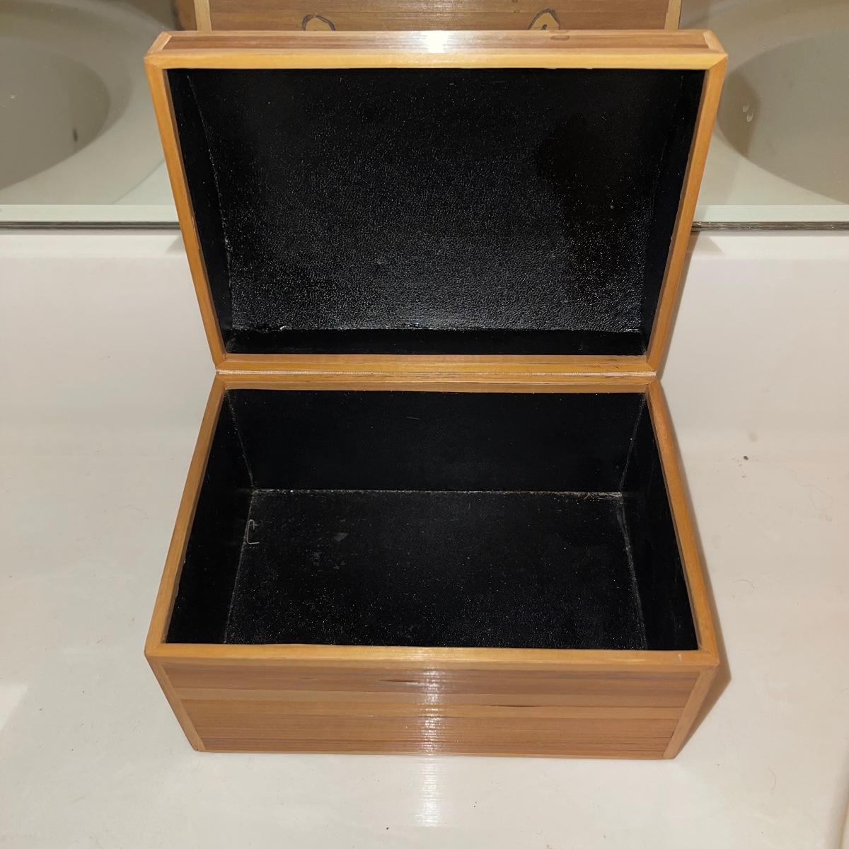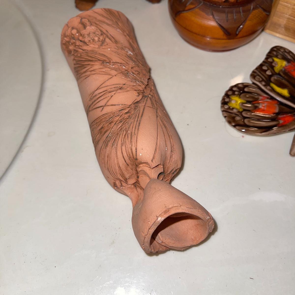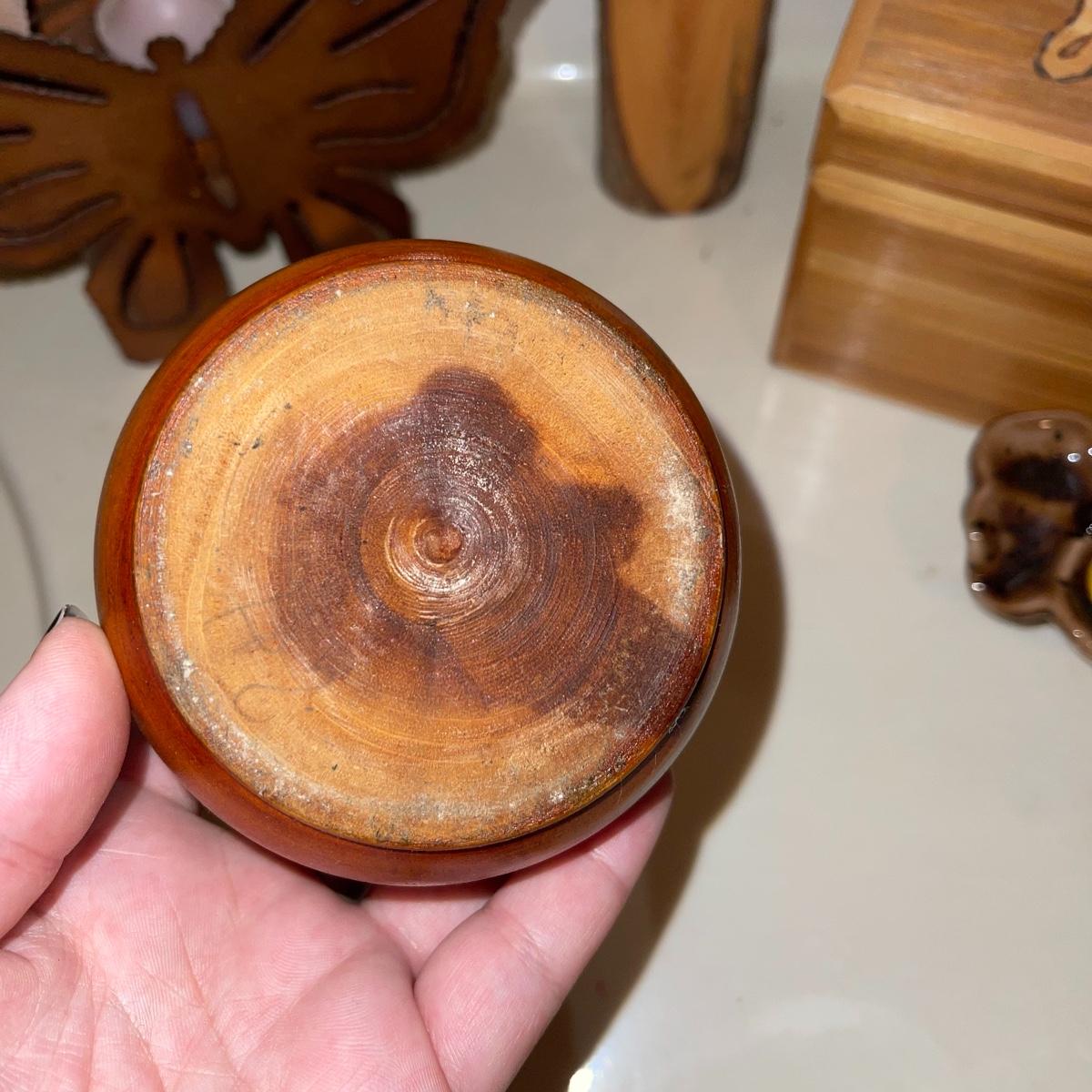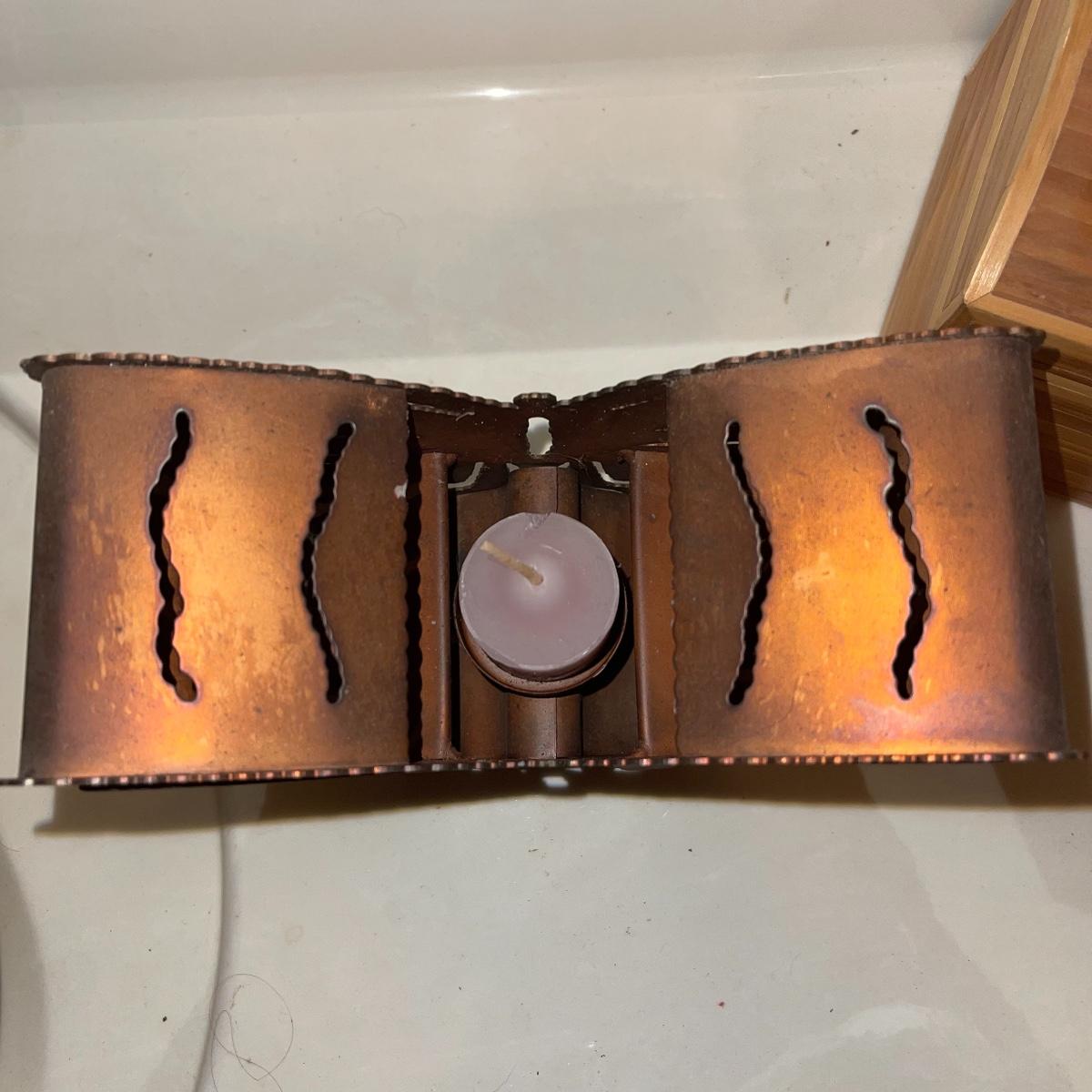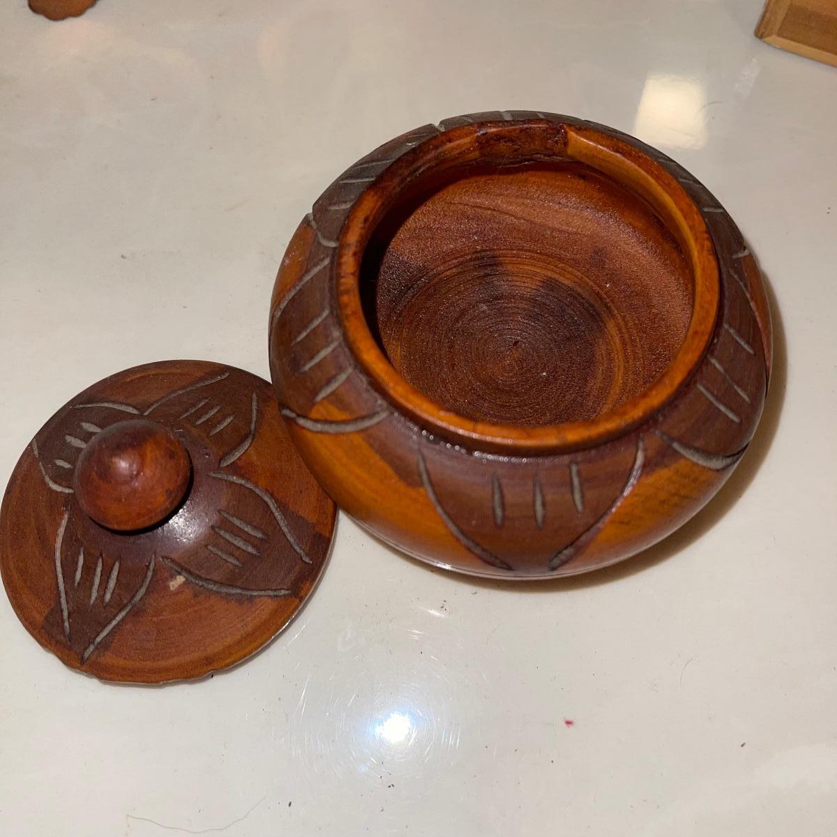 A metal bronze-colored butterfly candle holder, a wooden box with an incised butterfly, a piece of wood pencil holder, a small ceramic flower, a ceramic butterfly, a small wooden lidded jar, and a ceramic hanging vase make up this cute lot. All are a range of brown colored wood/glaze/clay/metal. The hanging clay vase is glazed on the interior to allow for water. Both glazed ceramic items, the butterfly and flower, appear to have been hand glazed.