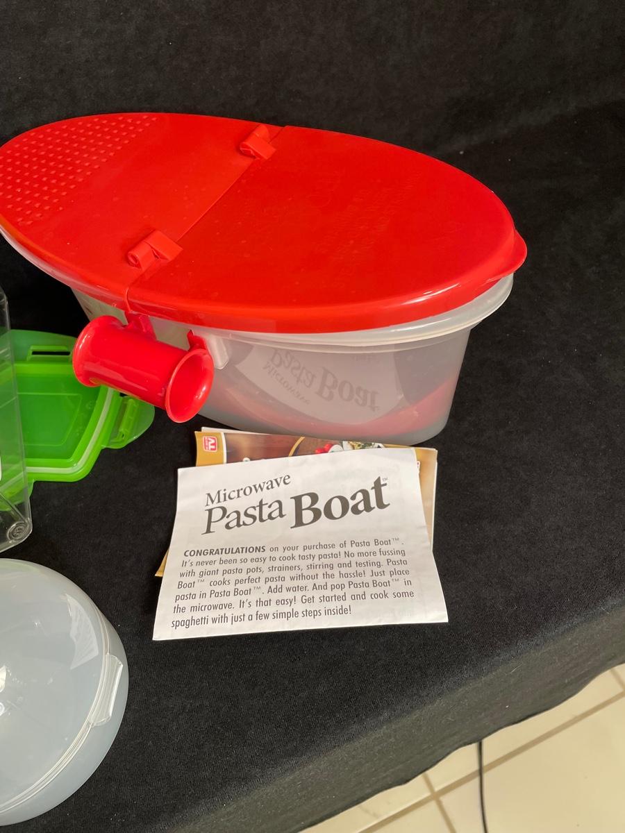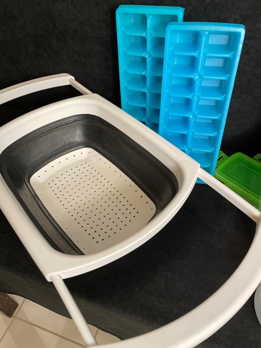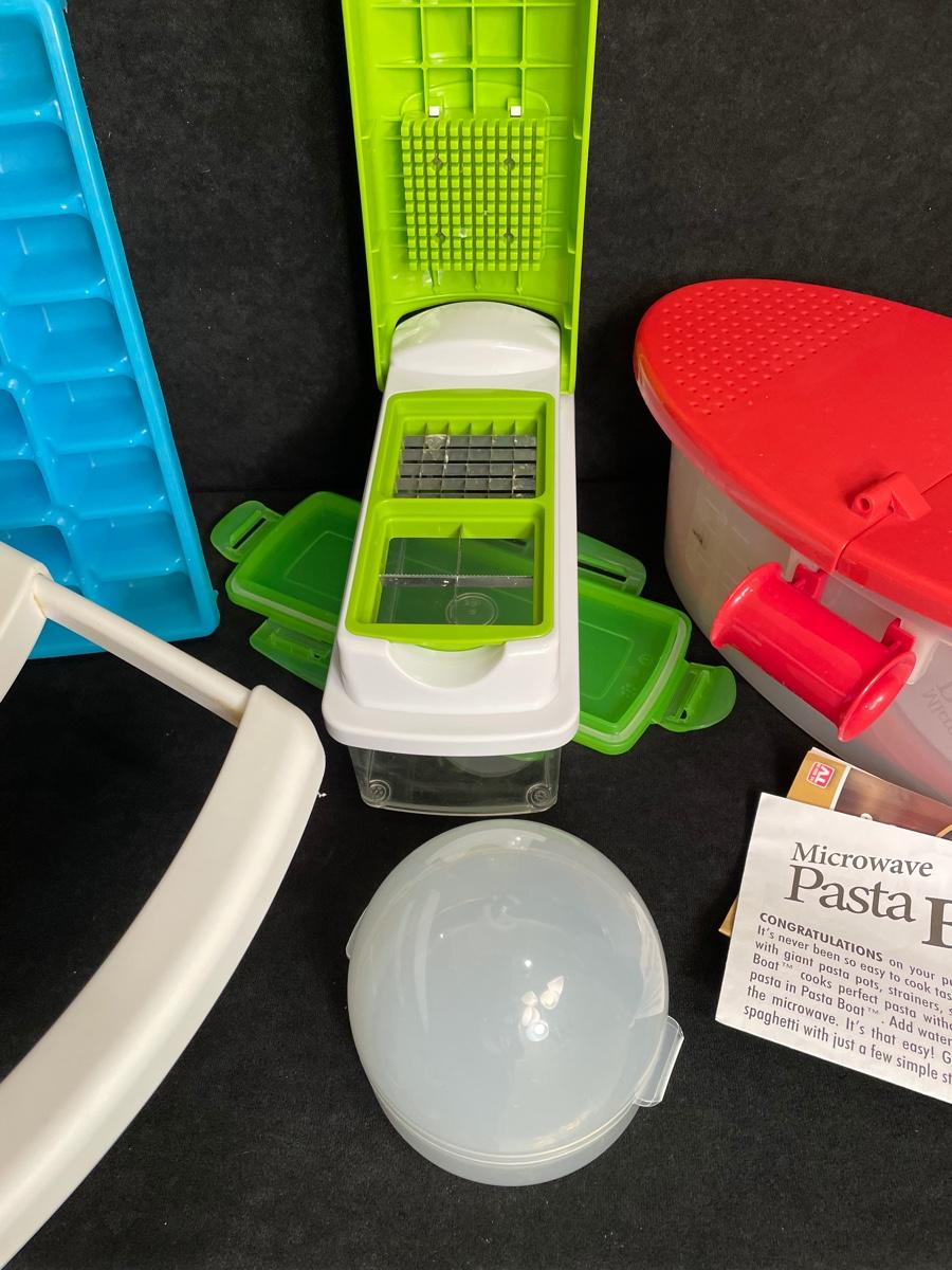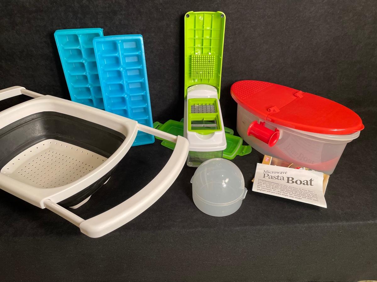 Microwave pasta cooker, over-sink colander, ice cube trays, slicer, onion keeper