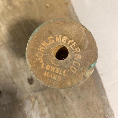Cool 4 repurposed wooden thread spools 15” x 6” x4” spools 4” apart Mounted to rough sawn board Spools marked John C. Meyer Co. Mass. SMILAX 2OZ