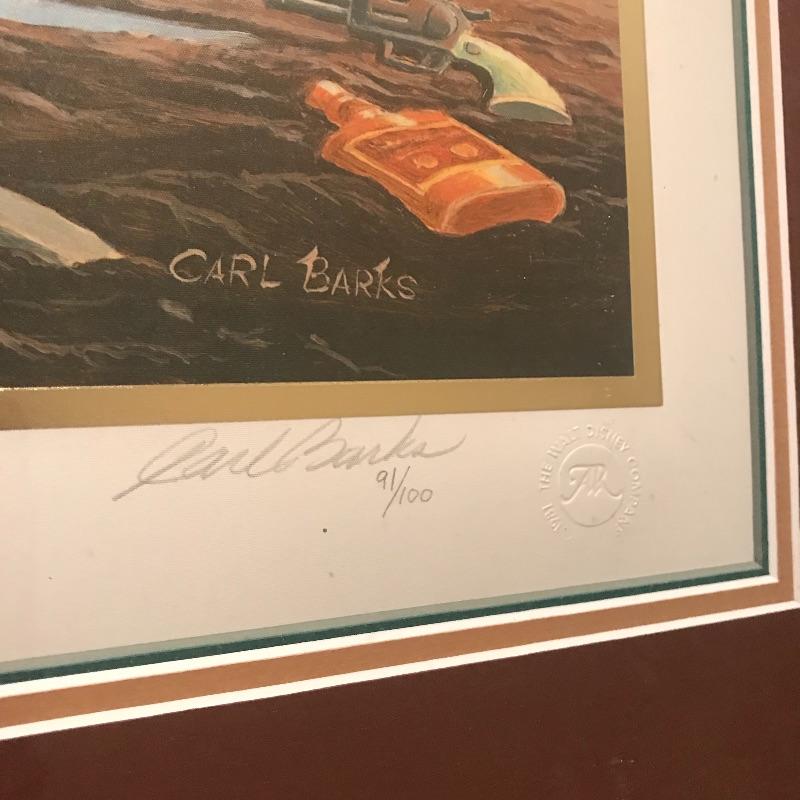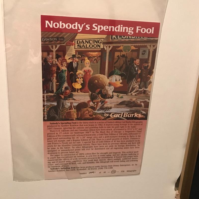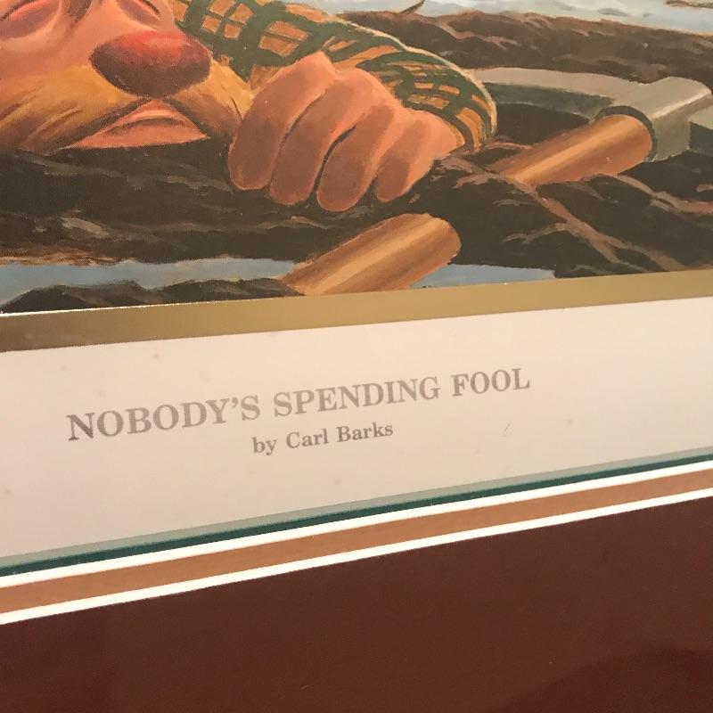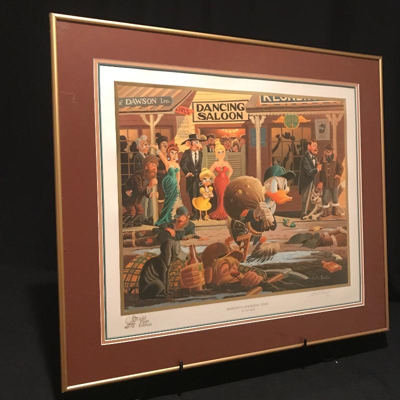 Gold Pate Edition number 91/100 Nobody’s Spending Fool” Lithograph by Carl Barks measures 27.5” x25” and has COA. Shipping available. Please call UPS for shipping quote prior to bidding at 828-252-6930