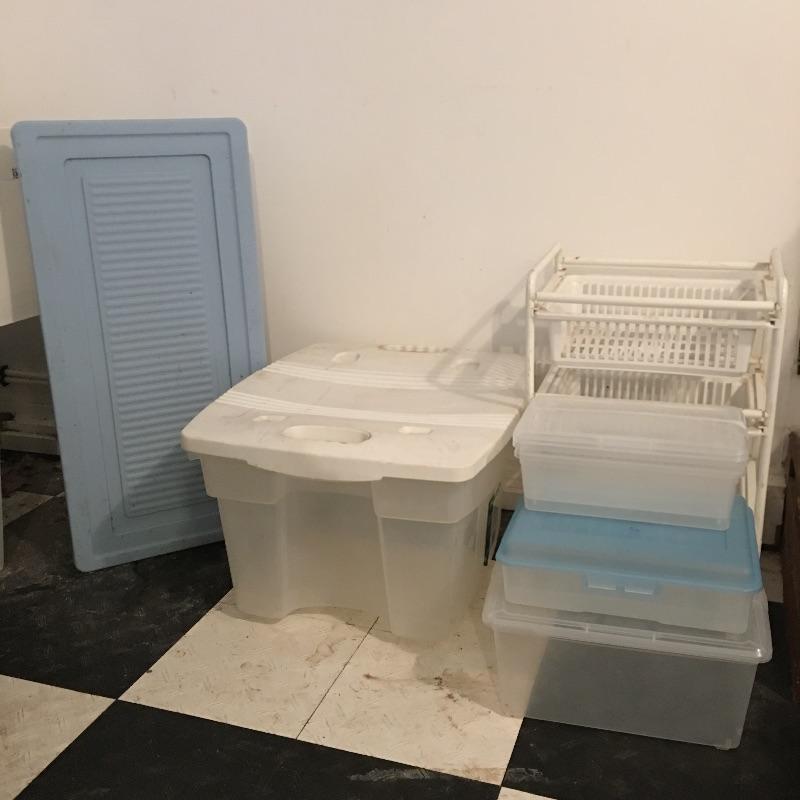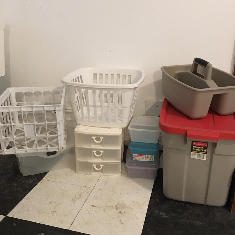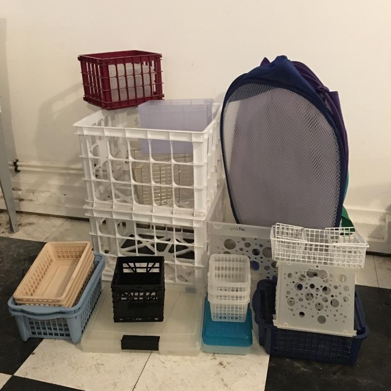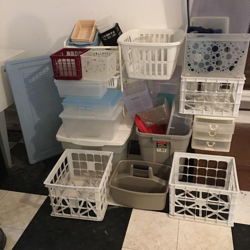 A solution for most every storage need with this collection of plastic storage that includes crates, boxes with lids, boxes with drawers, baskets in a rack, cloth folding baskets, small metal trays, mini baskets and more. Largest storage box measures 21” x 24” x 15”.